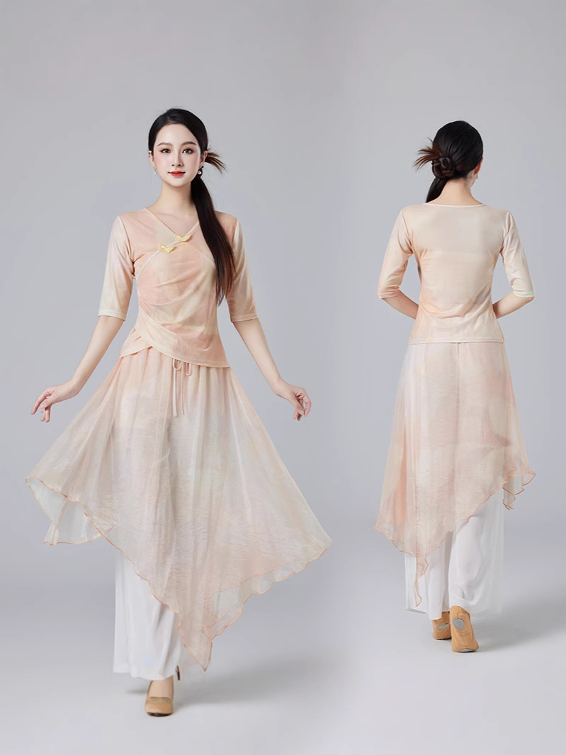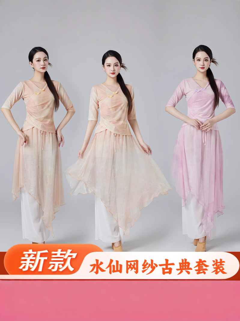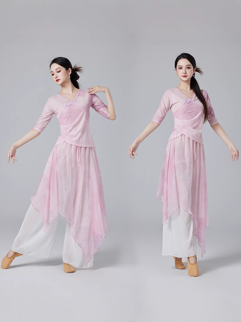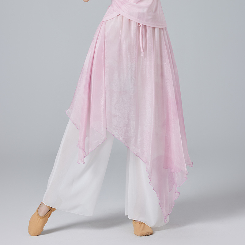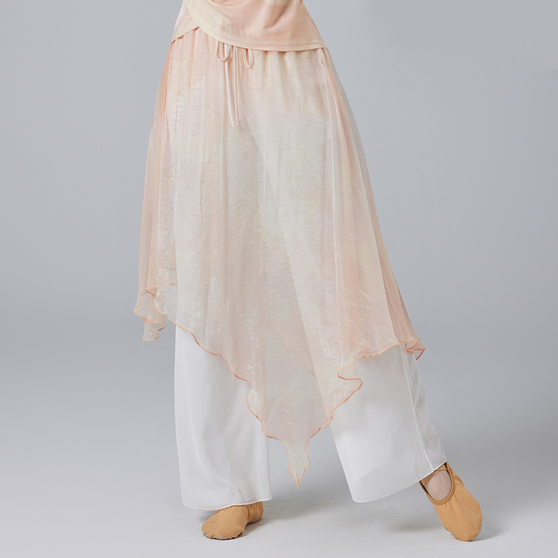 Китайский стиль классическая танцевальная одежда летний новый стиль брючный юбка свободная широкая нога брюки танцевальный элегантный цветение градиент цвет костюм