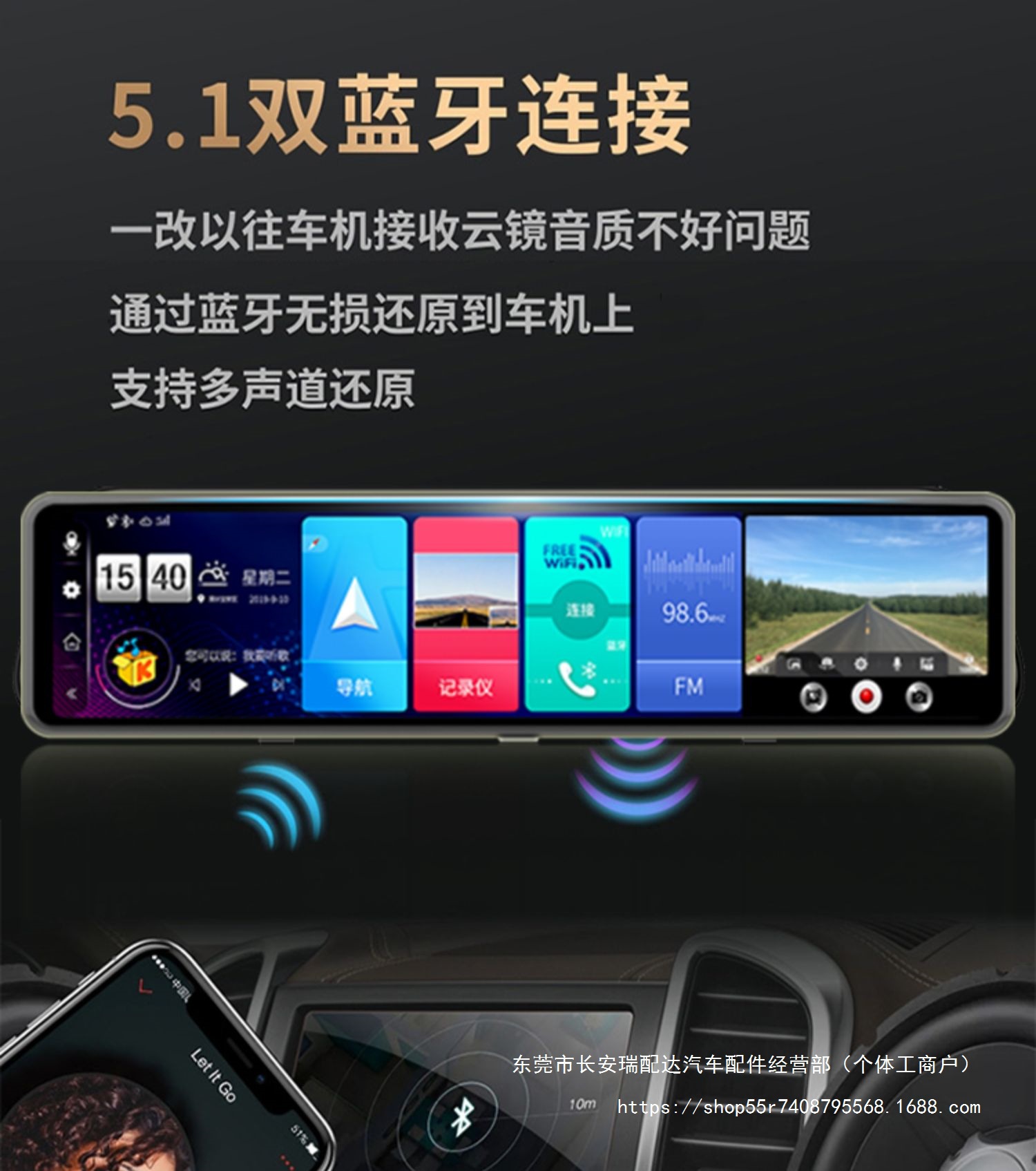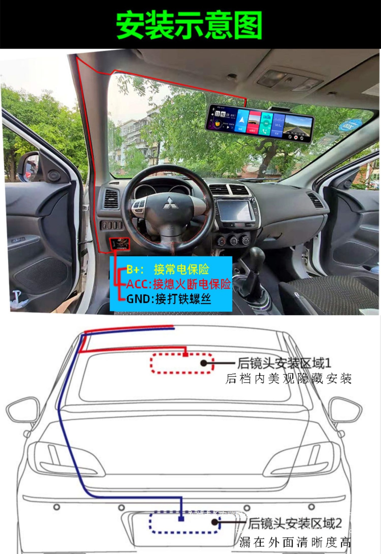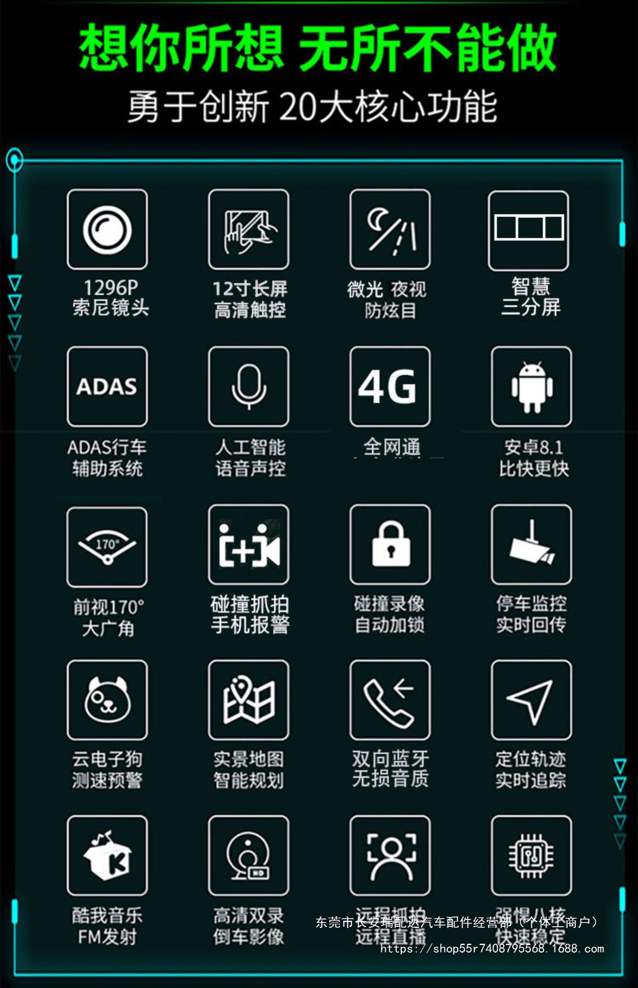 Bluetooth, GPS-навигация, позиционирование, изображение заднего вида, обнаружение движения, циклическая запись, измерение фиксированной скорости, мониторинг парковки, заполняющий свет ночного видения, помощь при смене полосы движения, запуск переднего автомобиля