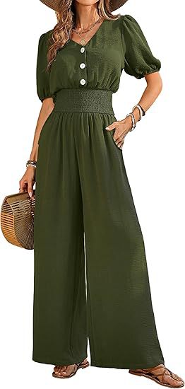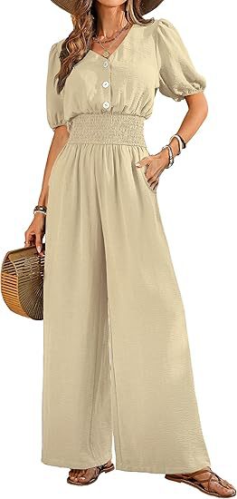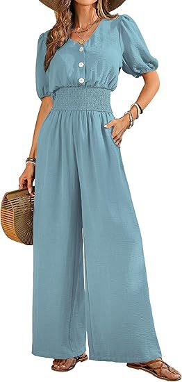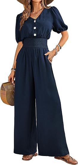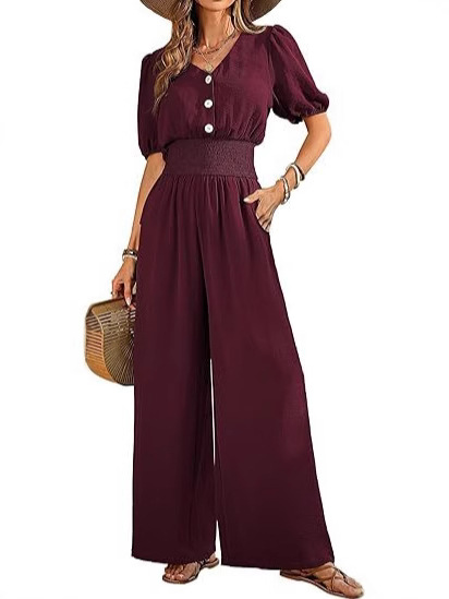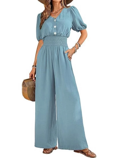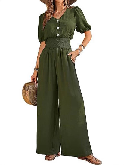 Amazon 2025 Летний женский комбинезон на пуговицах с коротким рукавом и v-образным вырезом, комбинезон с широкими штанинами, повседневные широкие брюки