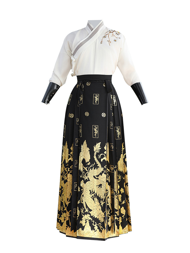 Белый (только топ с вышивкой цветка сливы); Черный (только юбка-лошадь с рисунком дракона); Белый и черный (топ + юбка-лошадка + браслеты)