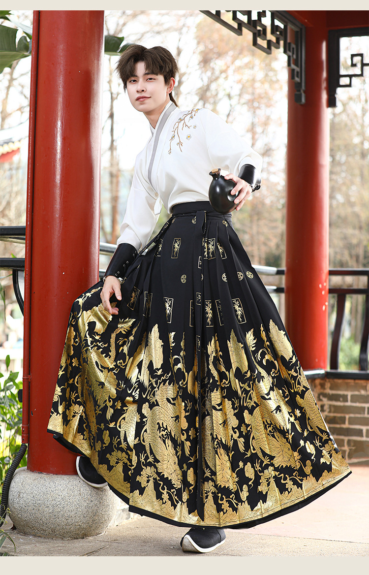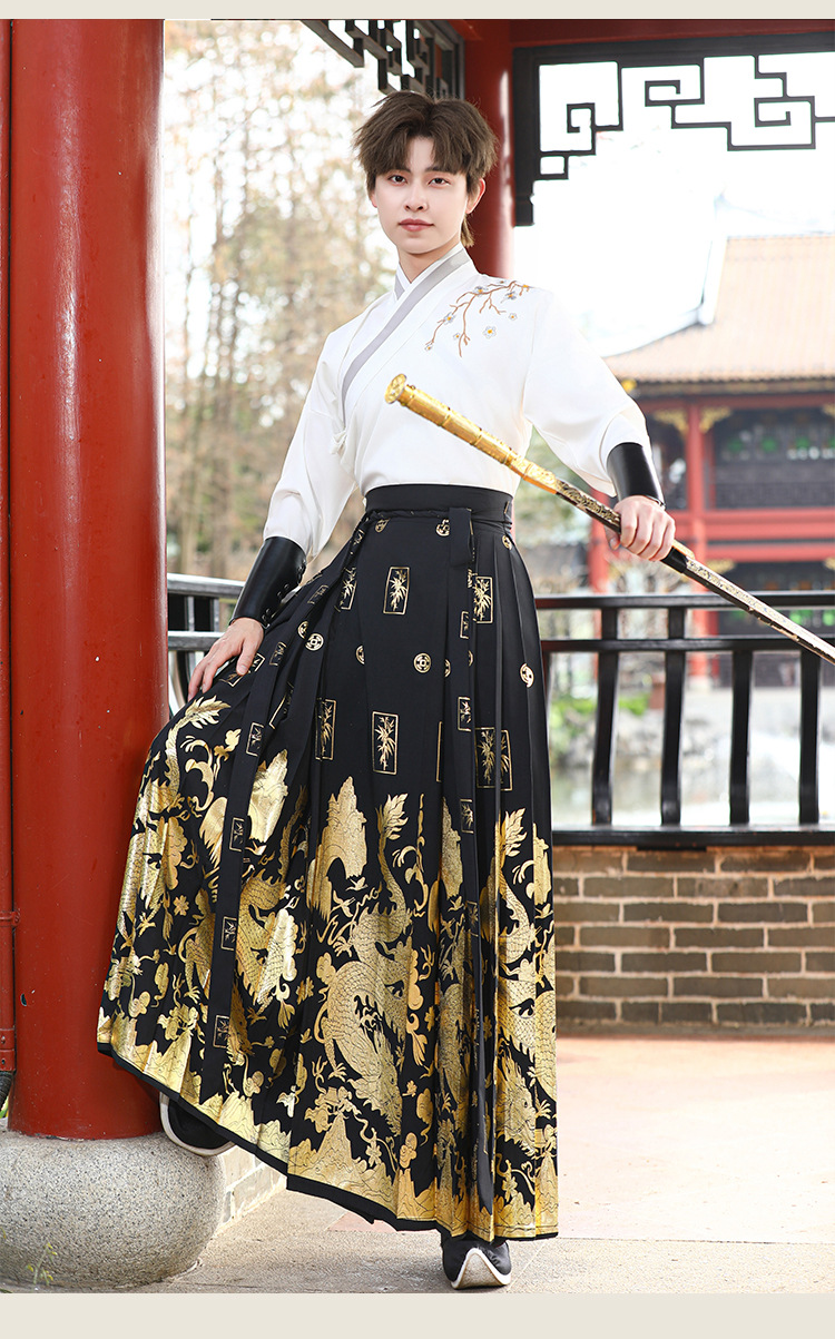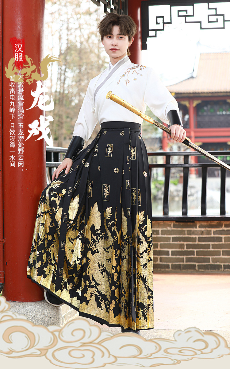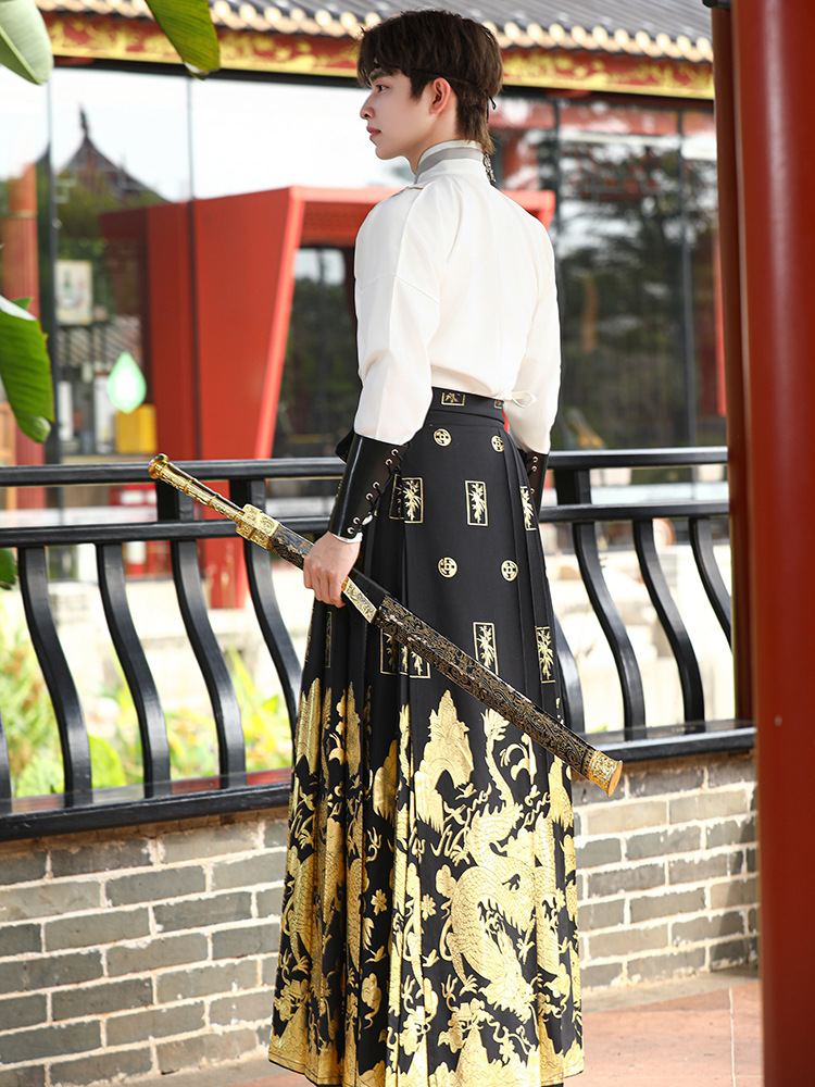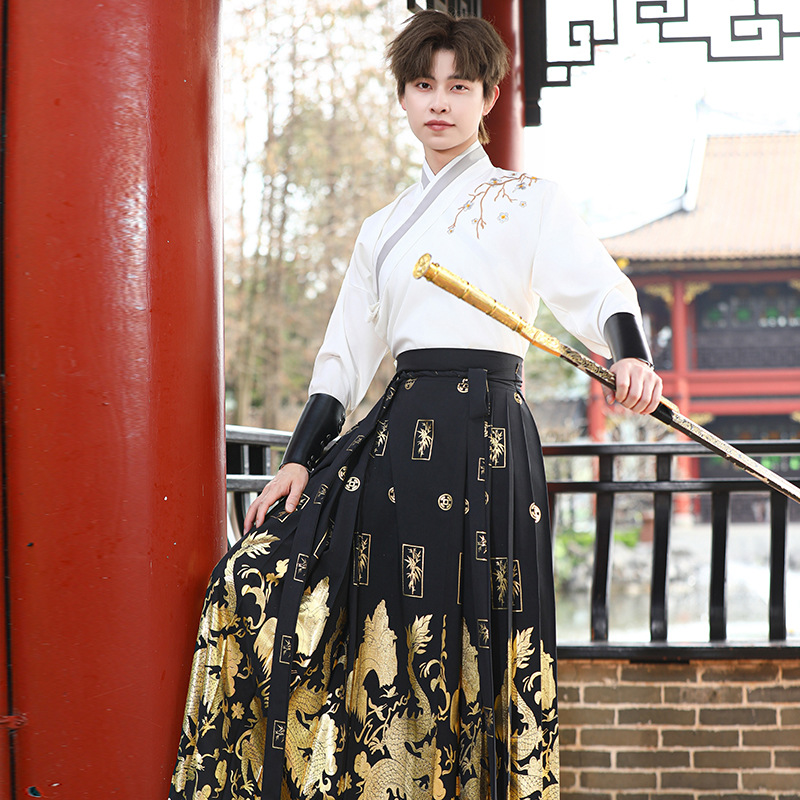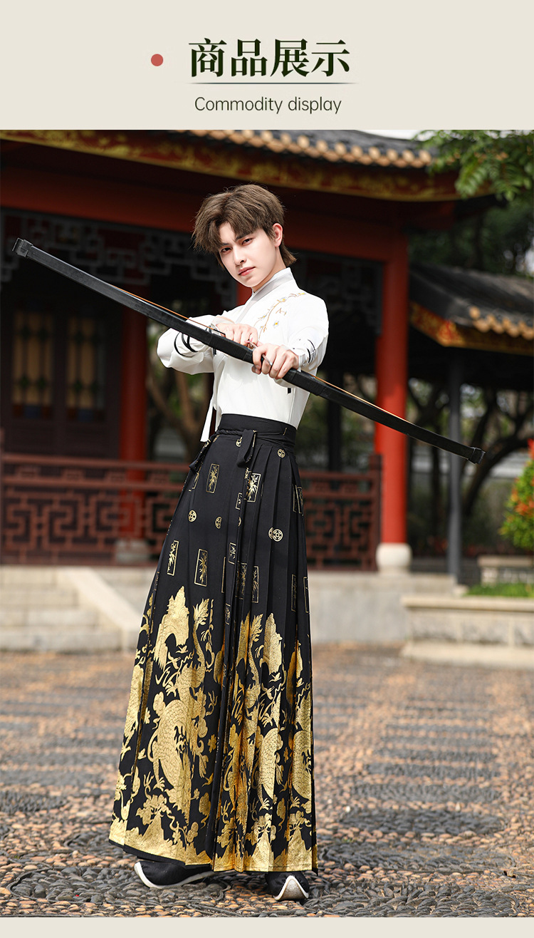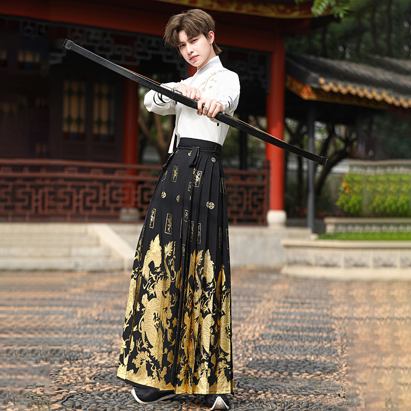 Новая юбка мамиан в китайском стиле с узором дракона и золотым тиснением, большие размеры, древний стиль, белый и черный традиционный мужской костюм ханьфу для боевых искусств