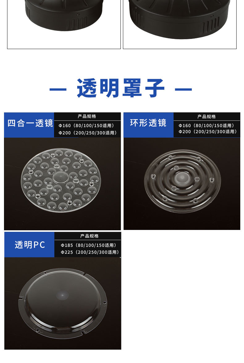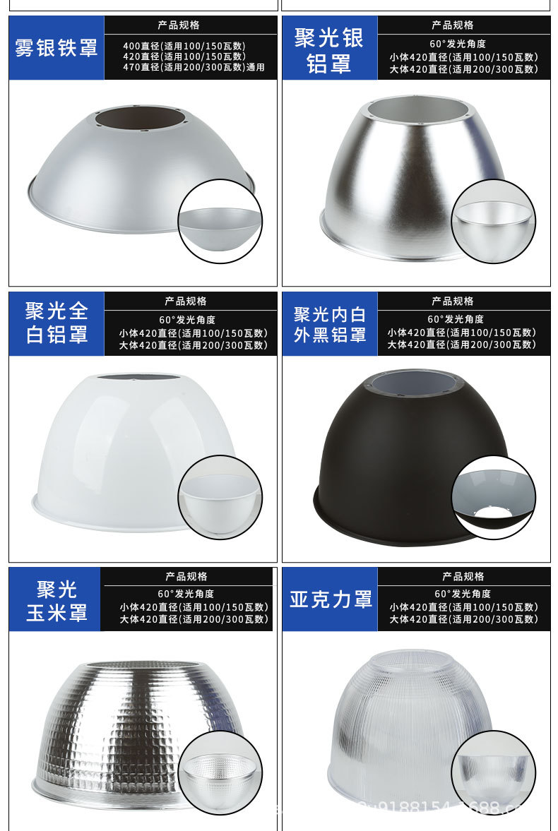 100 Вт черный; 100 Вт алюминиевый цвет; 150 Вт черный; 150 Вт алюминиевый цвет; 200 Вт черный; 200 Вт алюминиевый цвет; Блок питания диаметром 200 (серебристый); Блок питания диаметром 240 (серебристый); Блок питания диаметром 200 (черный); Блок питания диаметром 240 (черный); Прозрачный ПК диаметром 185; Прозрачный ПК диаметром 225; Объектив «четыре в одном» диаметром 160; Объектив «четыре в одном» диаметром 200; 160-кольцевая линза; 200-кольцевая линза; 400 белый внутри и черный железный абажур; 420 белый внутри и черный железный абажур; 470 белый внутри и черный железный абажур; Абажур из матового серебра 400.; Абажур из матового серебра 420; 470 туман серебряный железный абажур; 400 полностью белый железный абажур; 420 полностью белый железный абажур; 470 полностью белый железный абажур; 420 внутренний серебристый внешний черный алюминиевый абажур; 470 внутренний серебристый внешний черный алюминиевый абажур; 420 двойной белый алюминиевый абажур; 470 двойной белый алюминиевый абажур; Алюминиевый абажур 450 кукурузный; Алюминиевый абажур 500 кукурузный; Алюминиевый абажур с концентрацией серебра 60 градусов (маленький корпус); Абажур из серебристого алюминия с концентрацией 60 градусов (общий); Белый абажур с концентрацией 60 градусов (маленький корпус); Белый абажур с концентрацией 60 градусов (общий); Прожектор 60 градусов, внутренний белый и внешний черный абажур (маленький корпус); Прожектор 60 градусов, внутренний белый и внешний черный абажур (общий); Концентрированный кукурузный абажур на 60 градусов (маленький корпус); 60-градусный концентрированный кукурузный абажур (общий; Акриловая крышка 60 градусов (маленький корпус); Акриловая крышка 60 градусов (общая); Антибликовое покрытие 360°, полностью белое (набор из трех частей); 370, полностью белая антибликовая крышка (набор из трех частей); Подвесные цепные винты; Винты адаптера