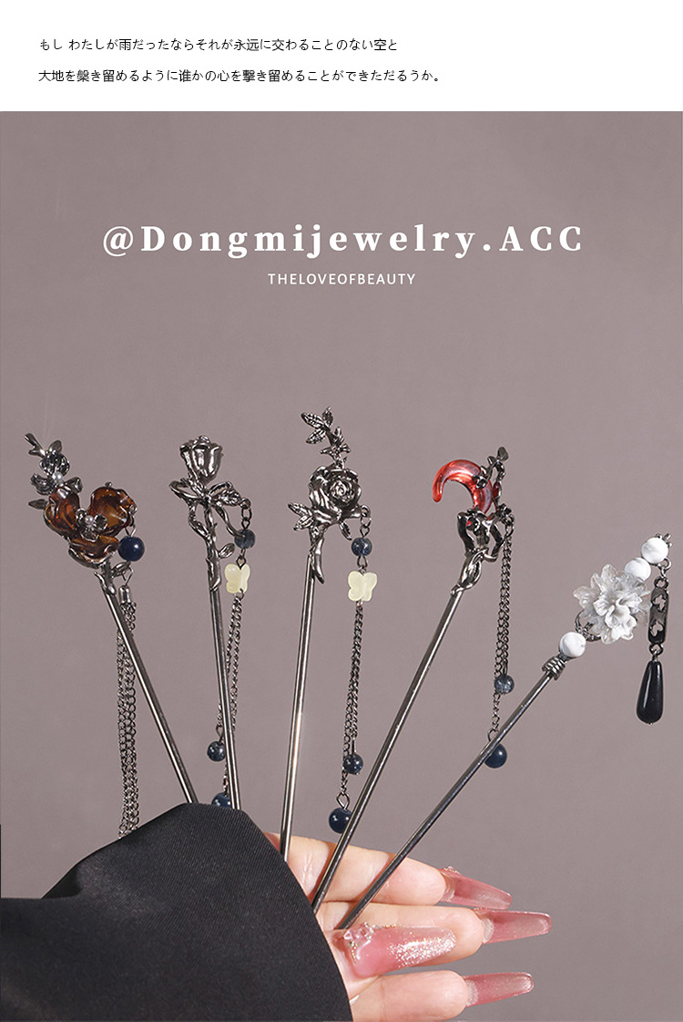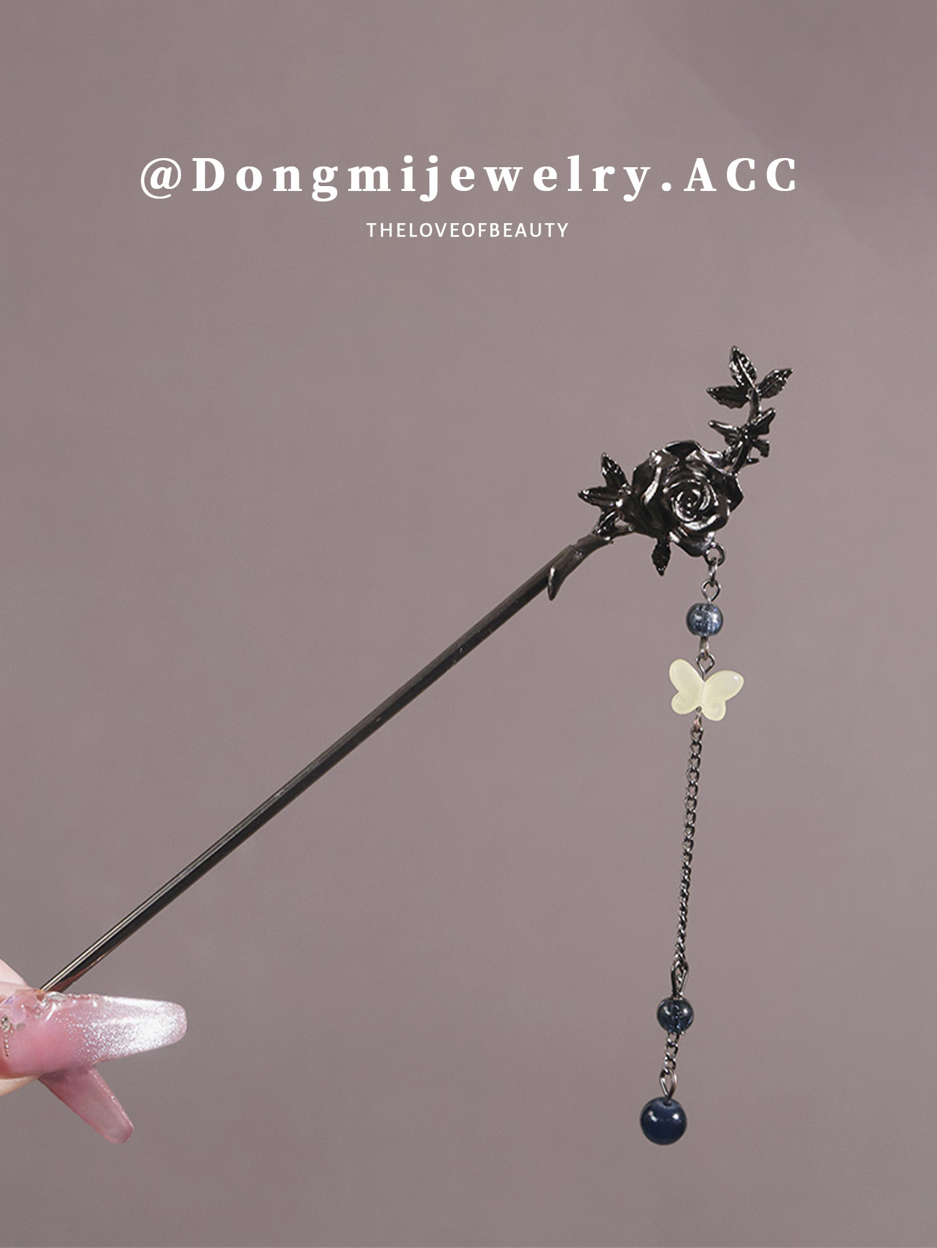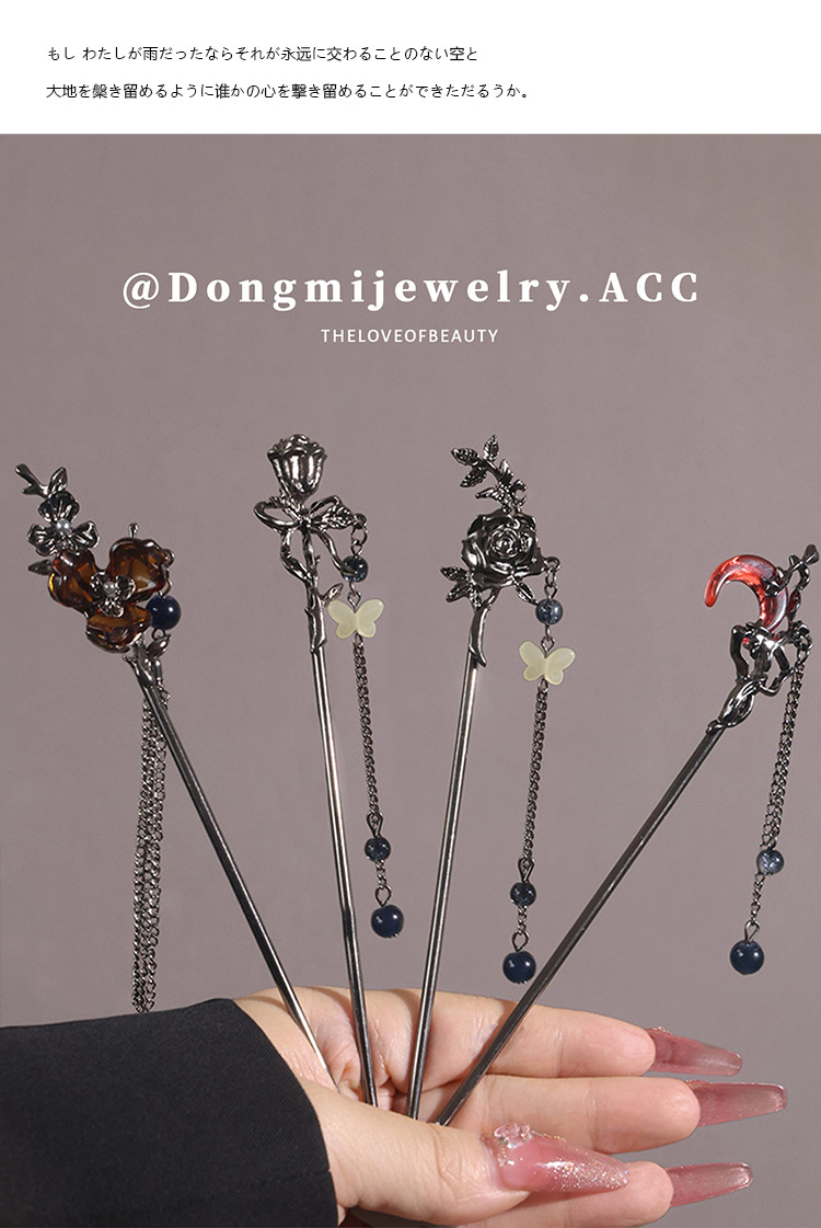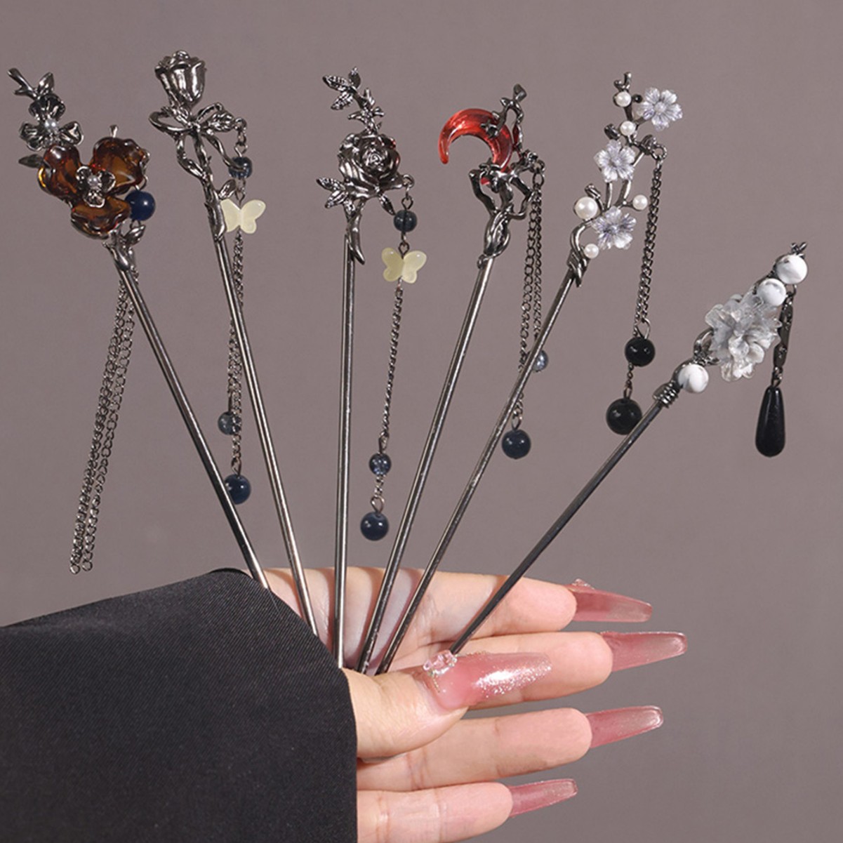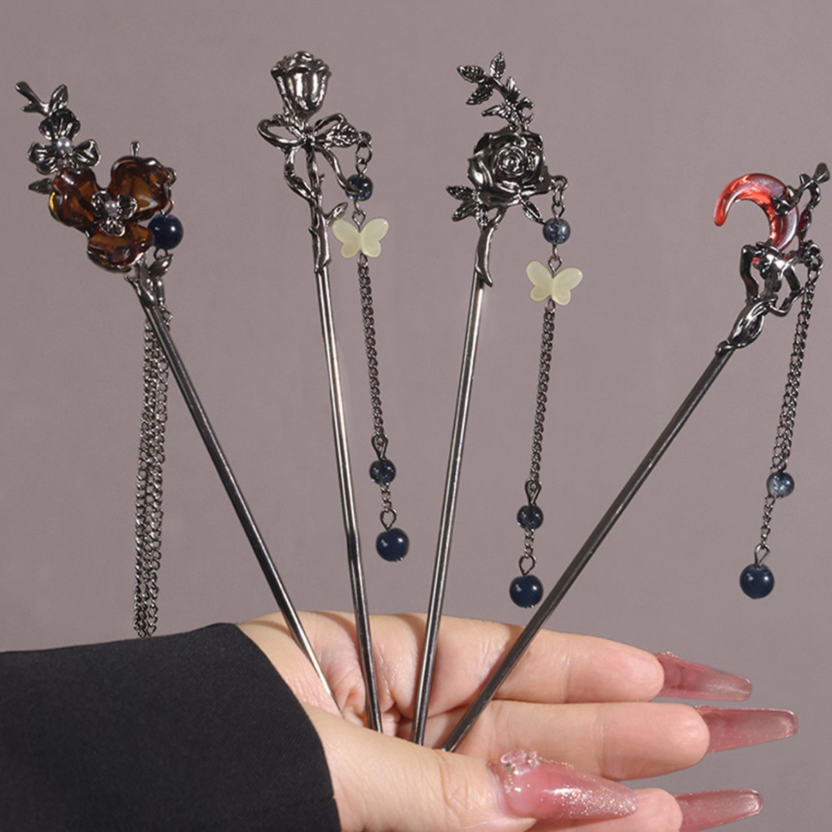 Заколка для волос с кисточкой Gun Black Red Moon; Шпилька с кисточкой в форме пистолета черного цвета; Заколка для волос с кисточкой в форме черной розы; Шпилька для волос с кисточкой Gun Black Clover; Шпилька с подвеской в виде цветка из чернил; Заколка для волос с кисточкой и тремя цветами