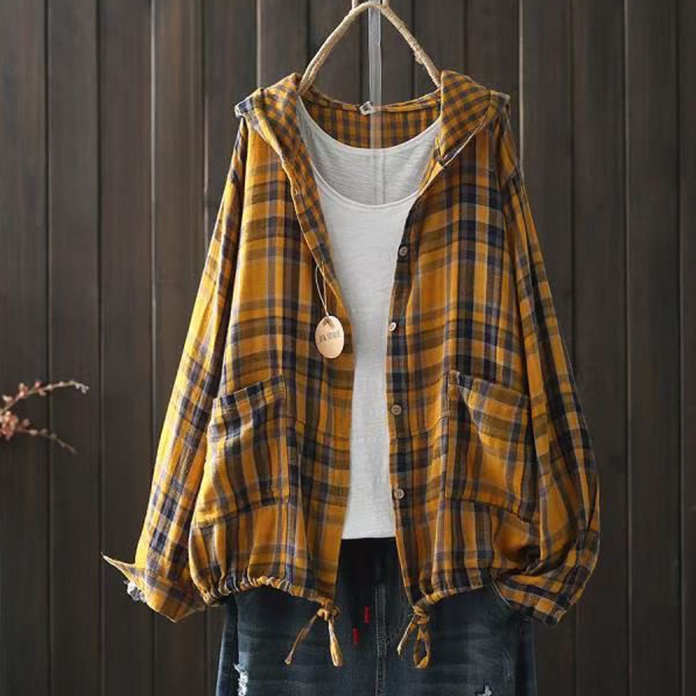 2025 Весенне-осенний худи с капюшоном из двойного слоя хлопковой пряжи, рубашка в клетку для внешней торговли, большой размер, литературный ретро-кардиган, повседневный топ