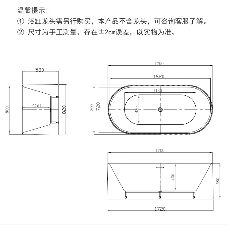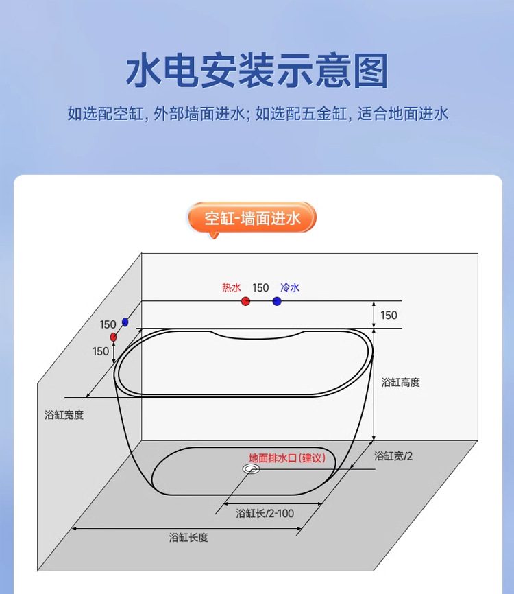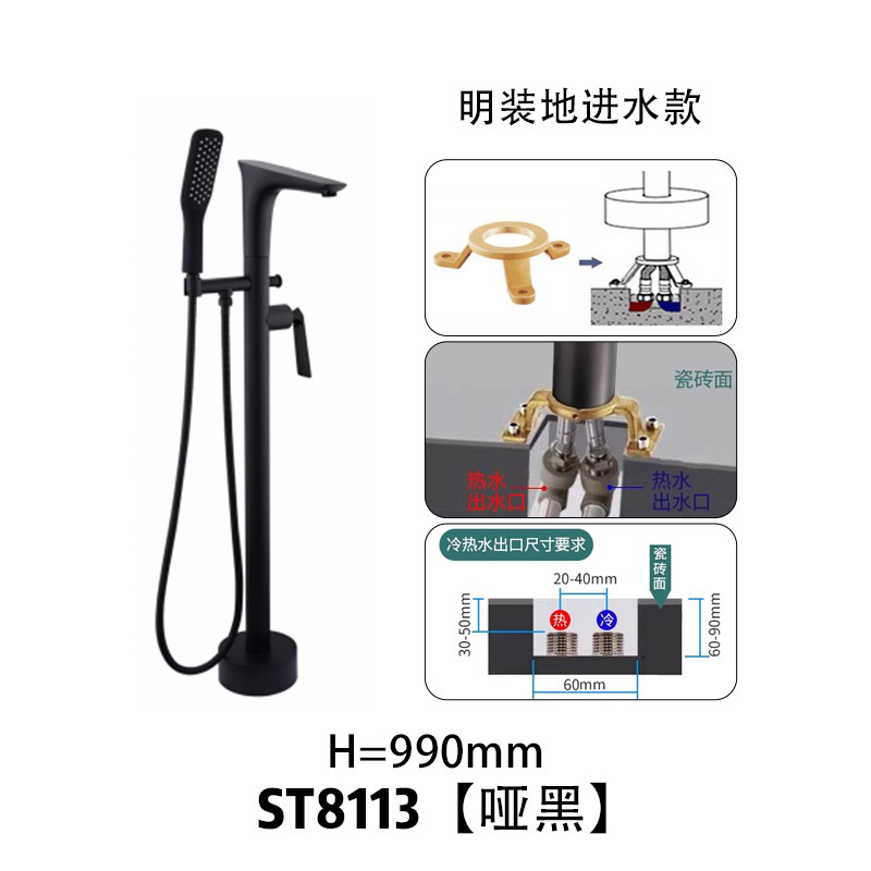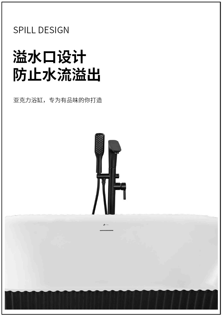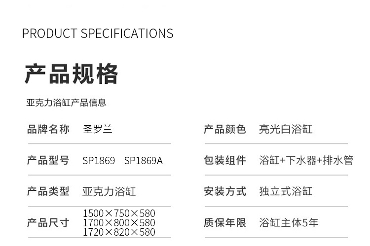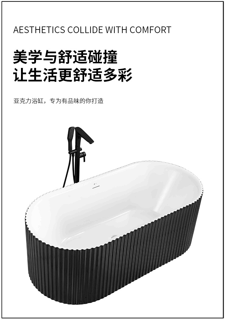 1500×750×580 (SP1869A-15, матовые белые тонкие вертикальные линии); 1700×800×580 (SP1869A-17, матовые белые тонкие вертикальные линии); 1720×820×580 (SP1869-17, толстое вертикальное зерно); 1720×820×580 (SP1869-17, толстые вертикальные полосы и черный цвет снаружи); Хромированный набор смесителей; Смеситель напольный в тон (черный матовый)