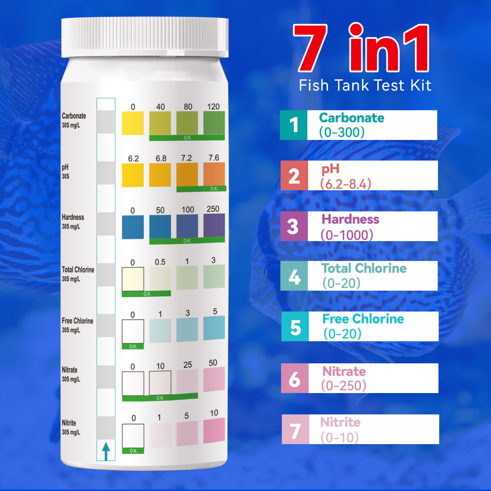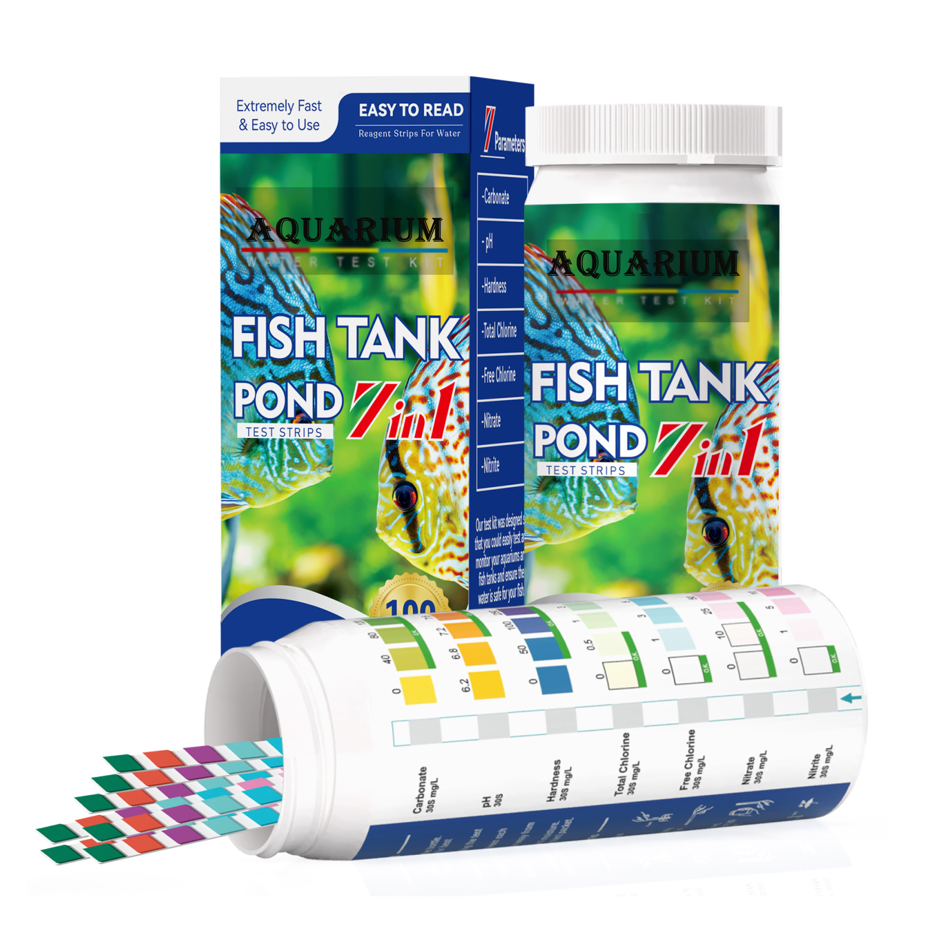 外贸热销7合一水族鱼塘水质检测试纸 PH硝酸盐亚硝酸盐氨氮检测