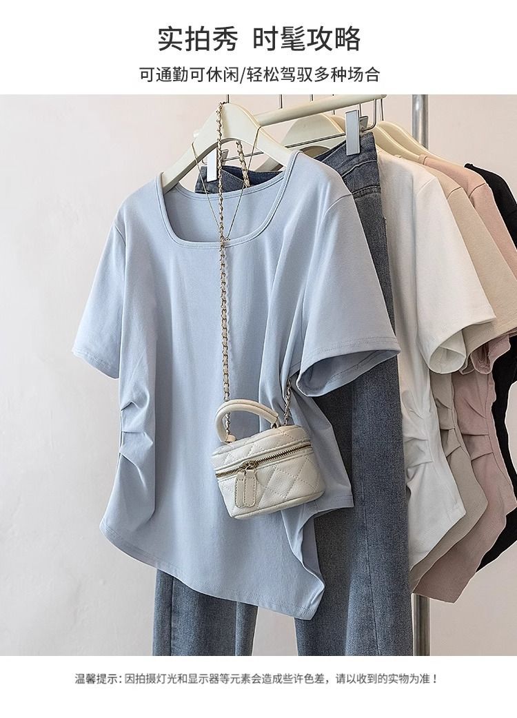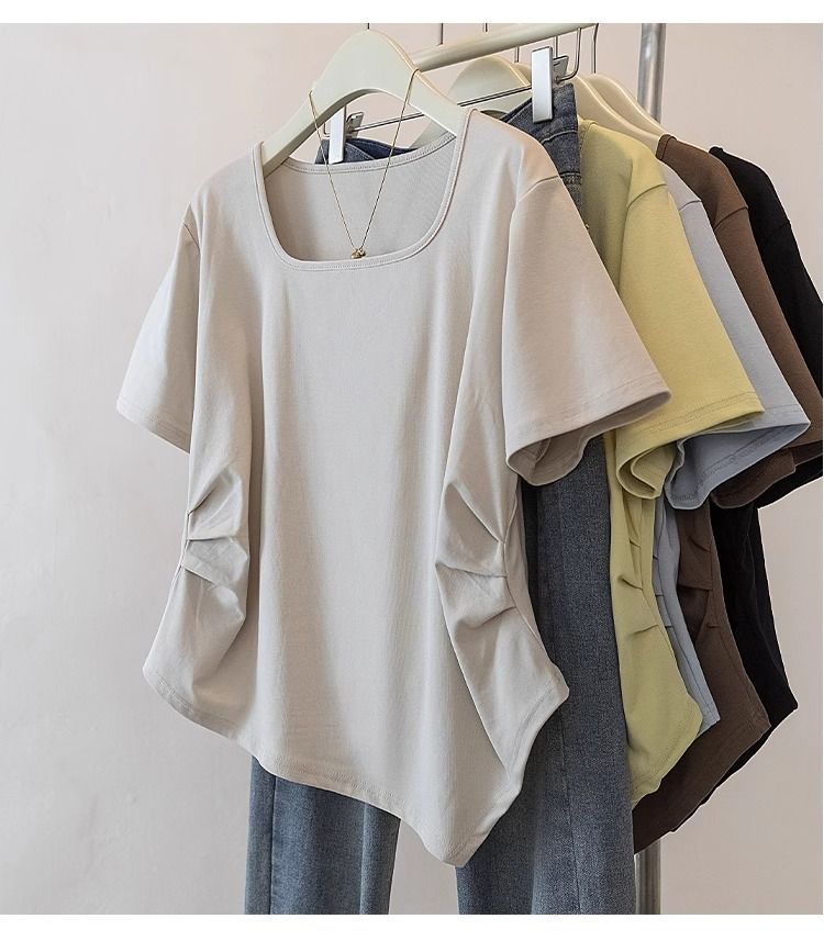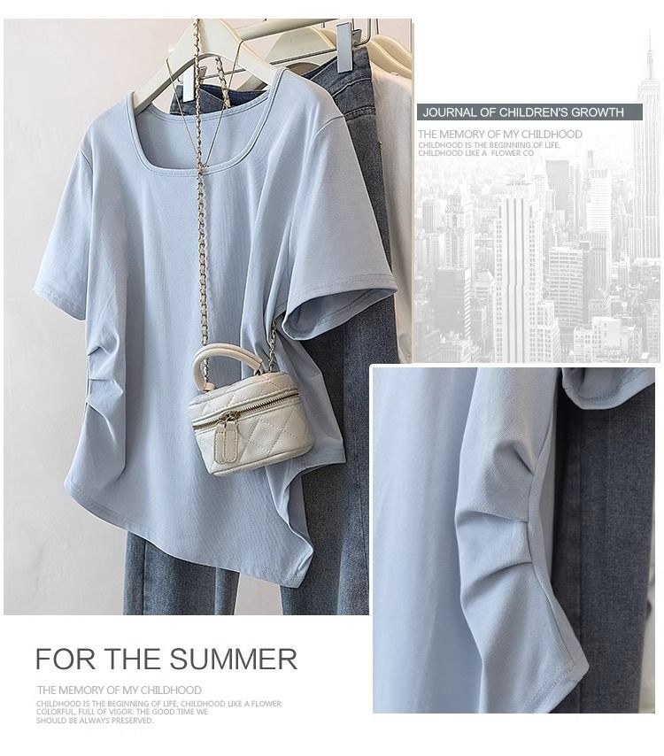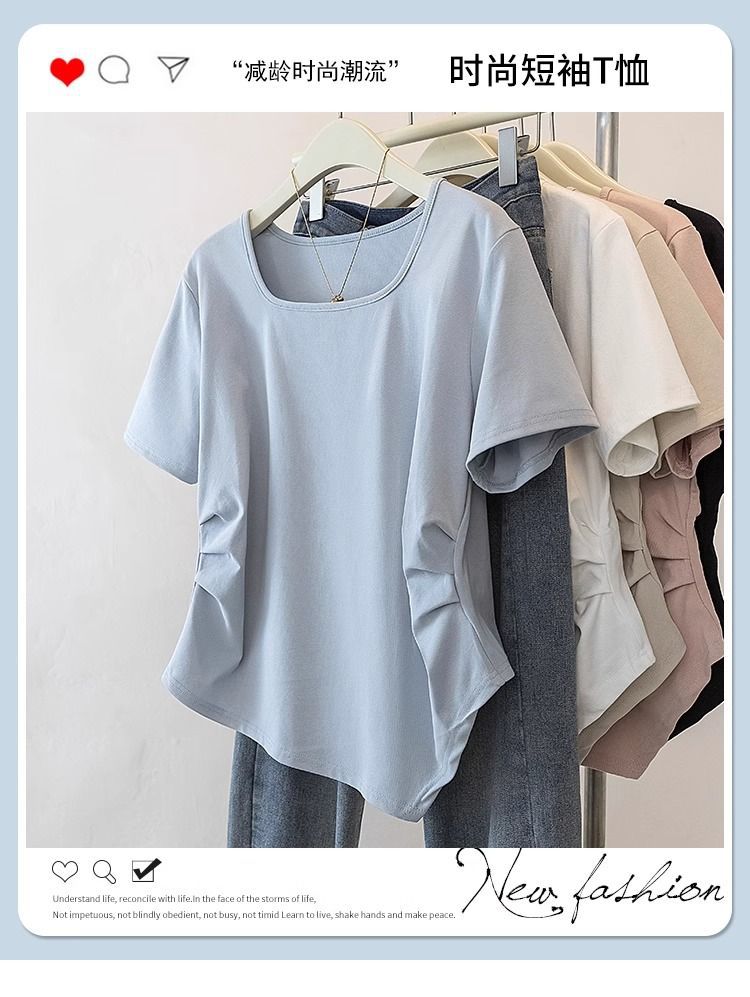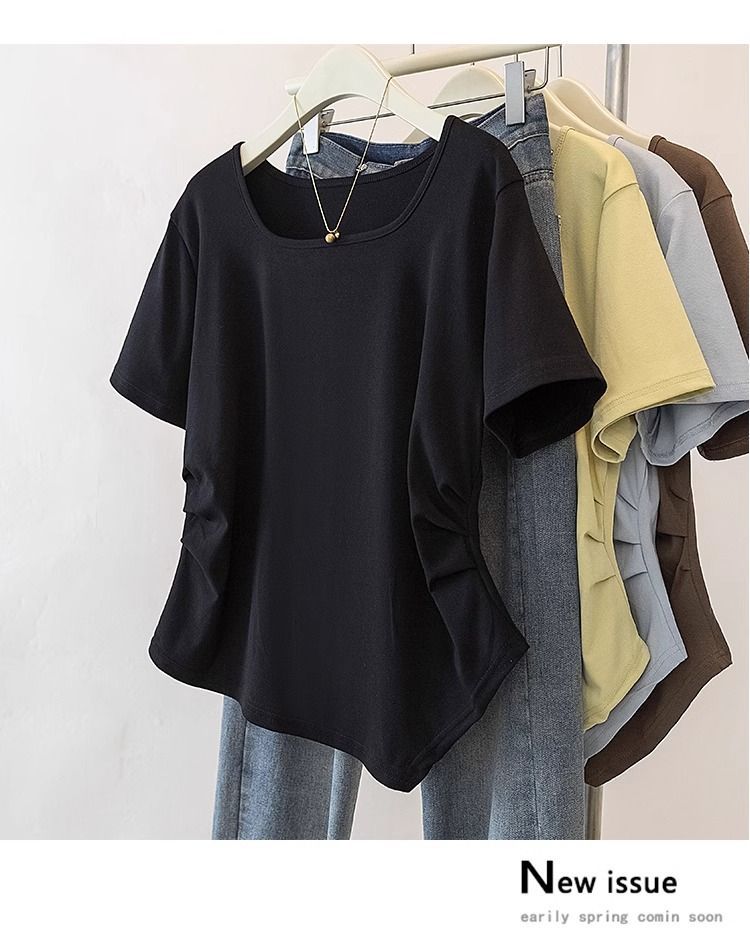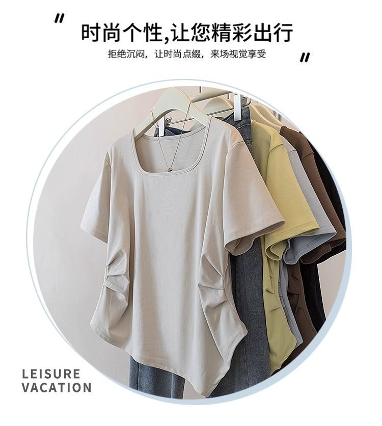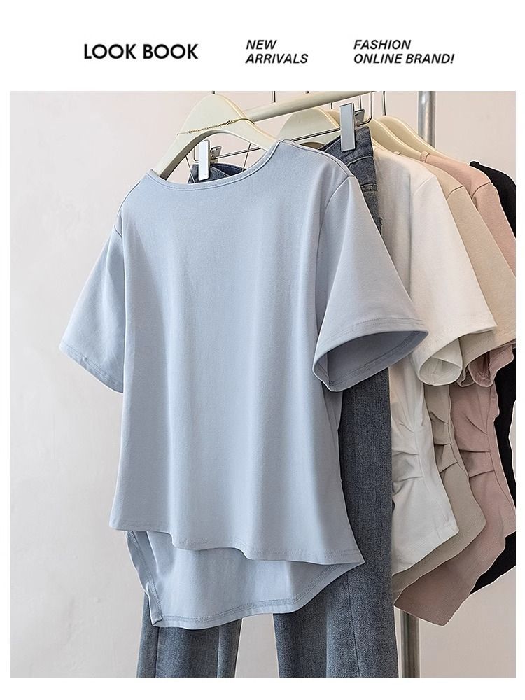 Летняя свободная футболка больших размеров с асимметричным подолом и коротким рукавом, новинка 2026 года, с эффектом утяжки талии, скрывающая живот, однотонный топ со стандартным плечевым вырезом для женщин.