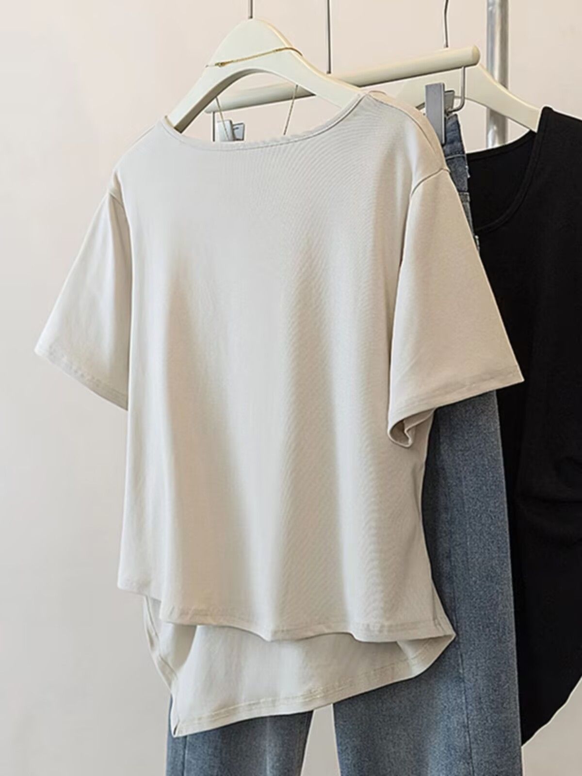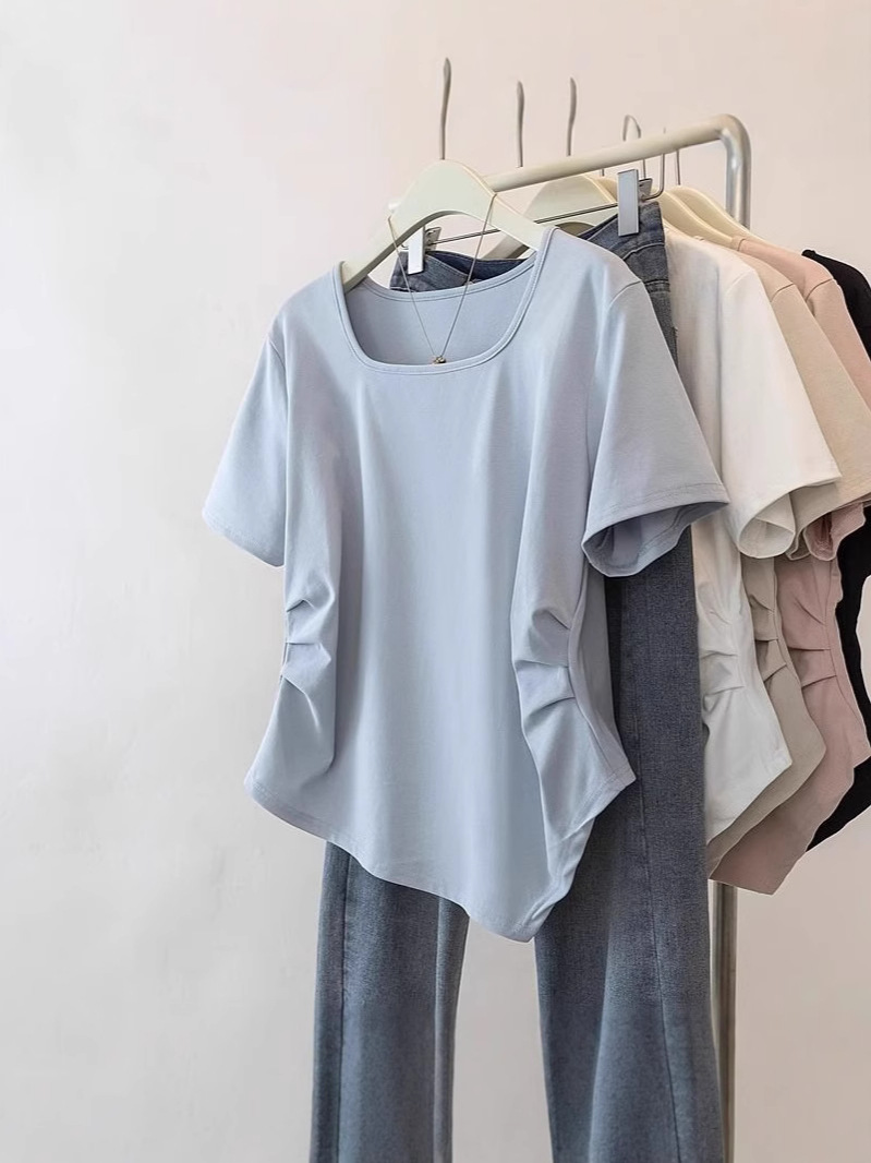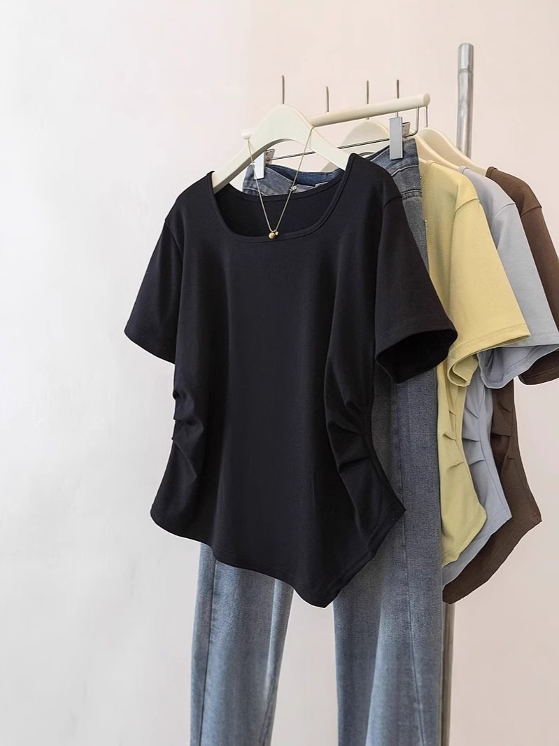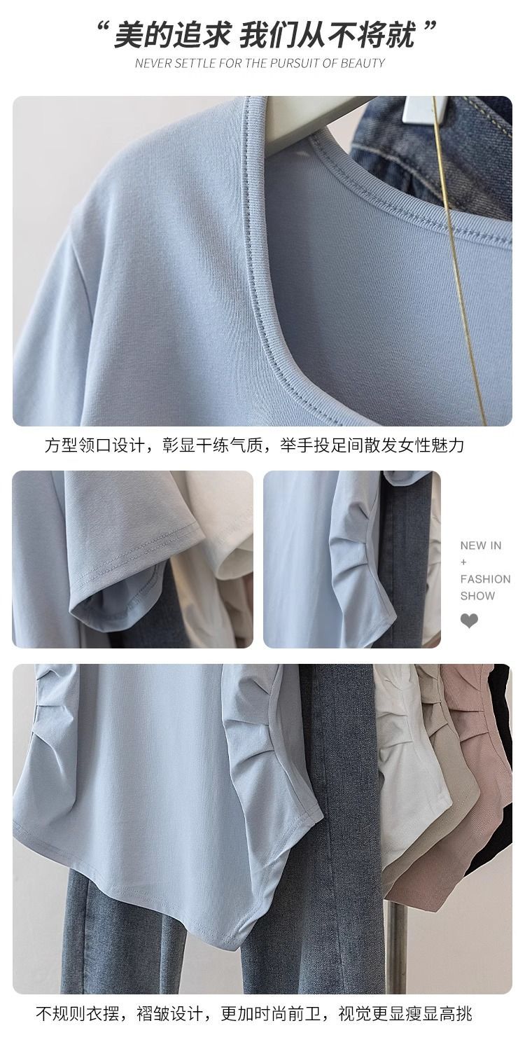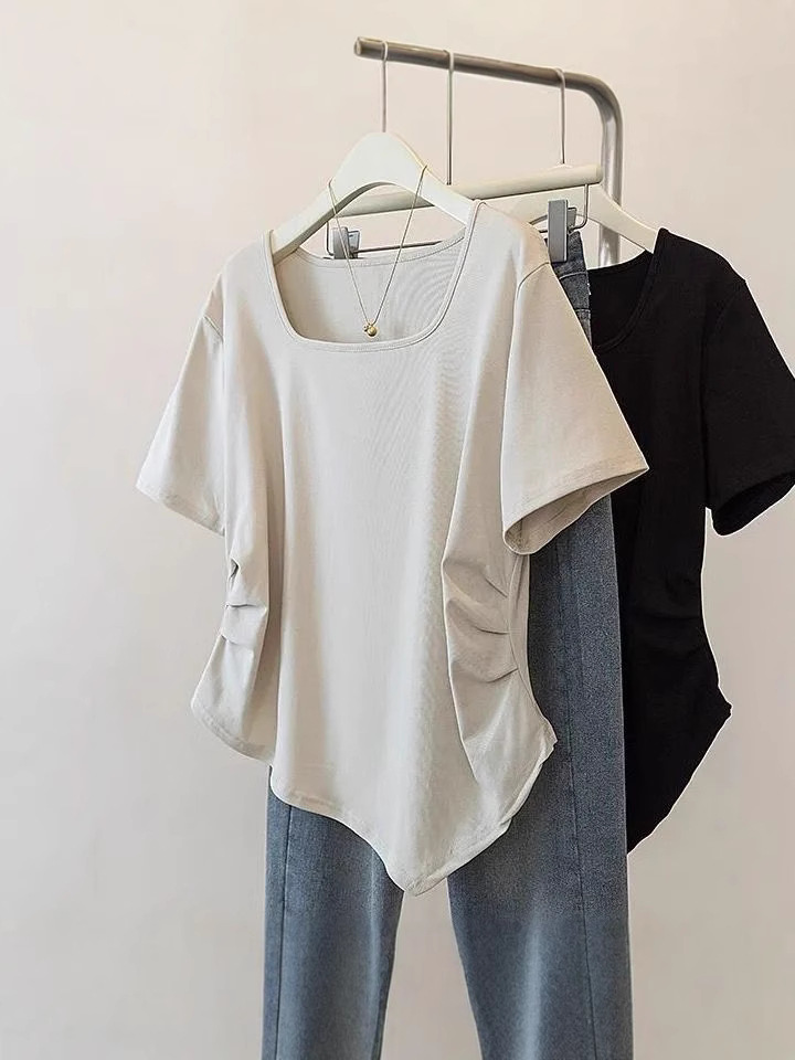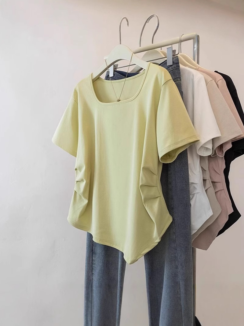Летняя свободная футболка больших размеров с асимметричным подолом и коротким рукавом, новинка 2026 года, с эффектом утяжки талии, скрывающая живот, однотонный топ со стандартным плечевым вырезом для женщин.