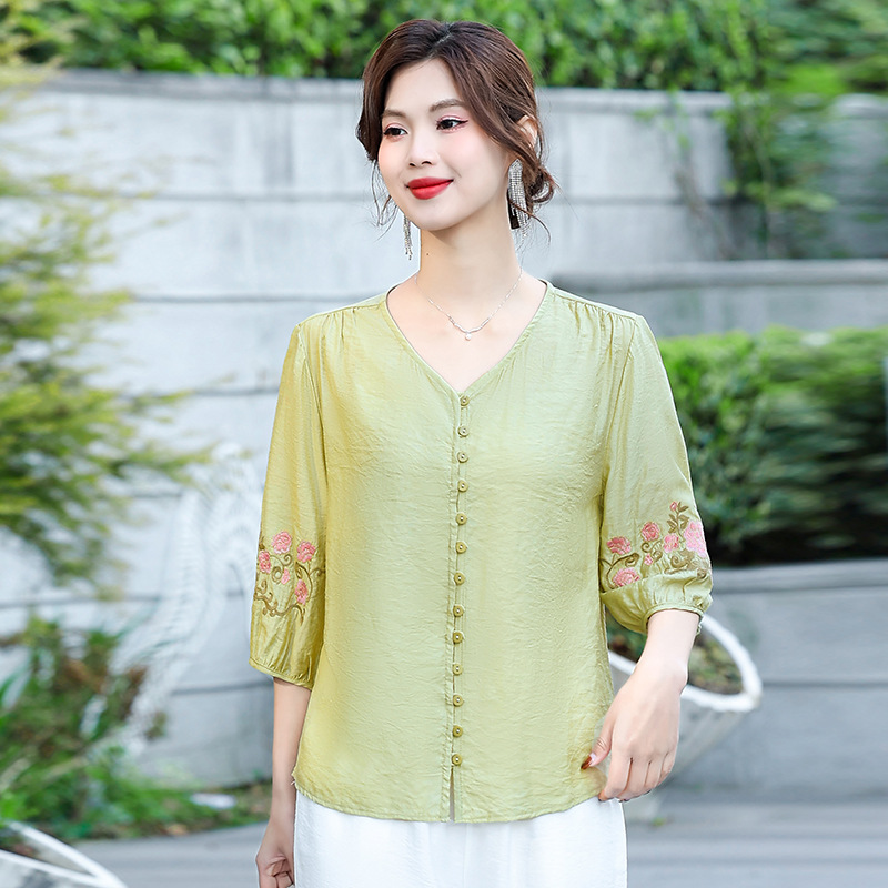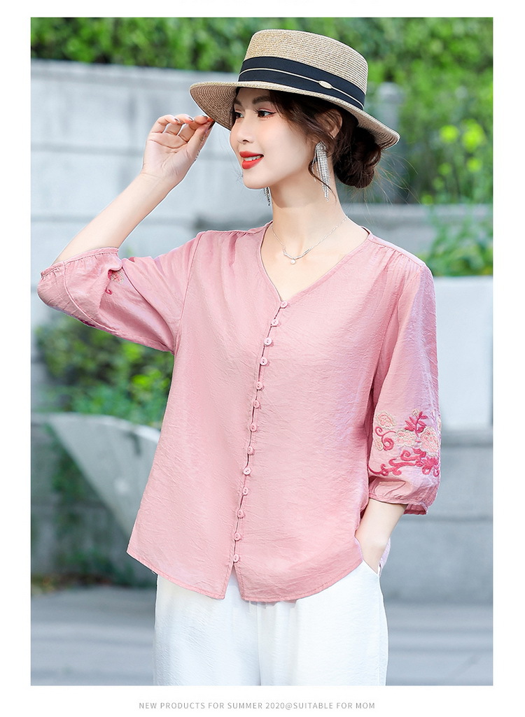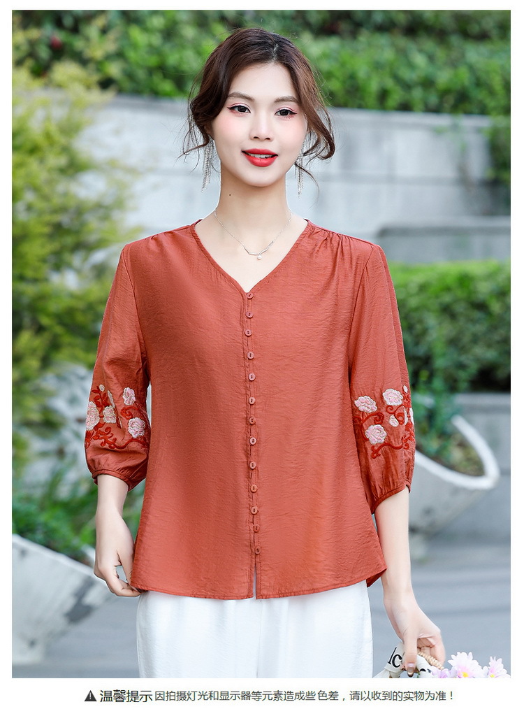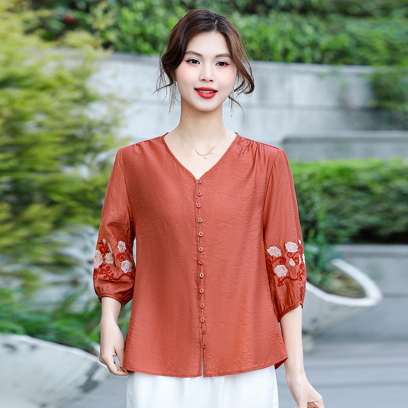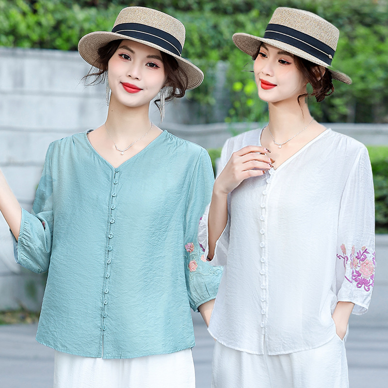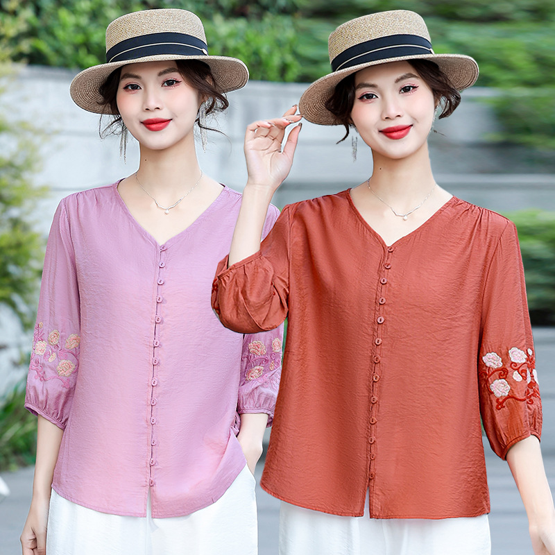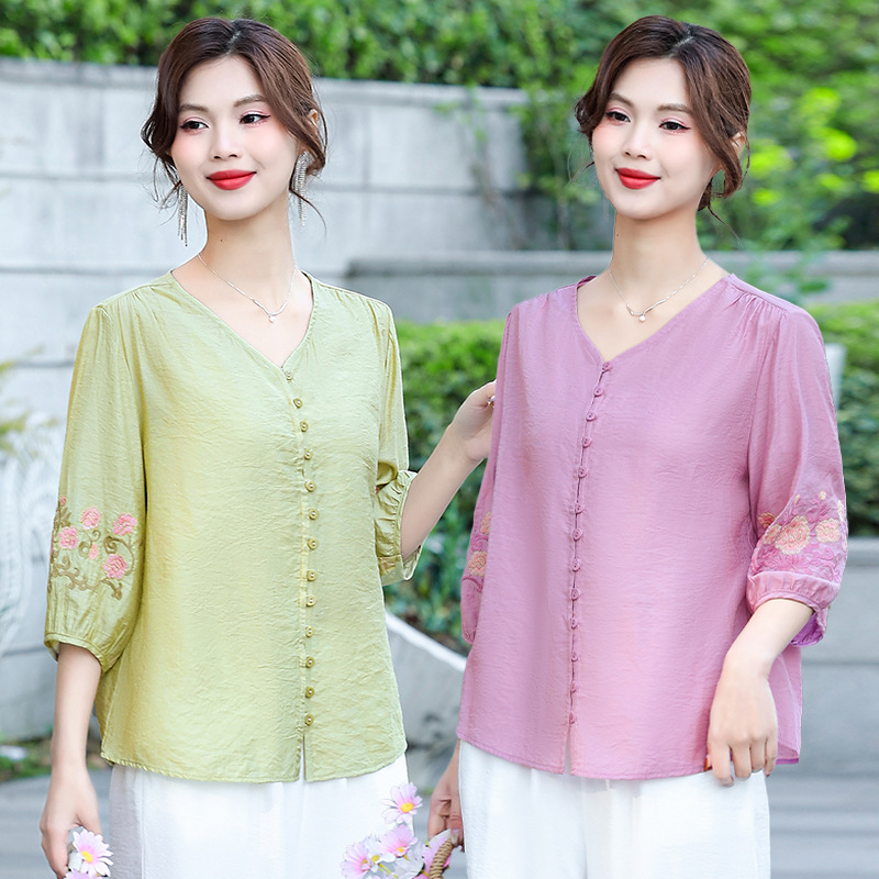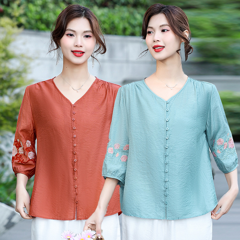 Летние топы в китайском стиле ретро 2025 года, женские рубашки в этническом стиле с вышивкой, больших размеров, с V-образным вырезом, тонкие, три четверти рукава