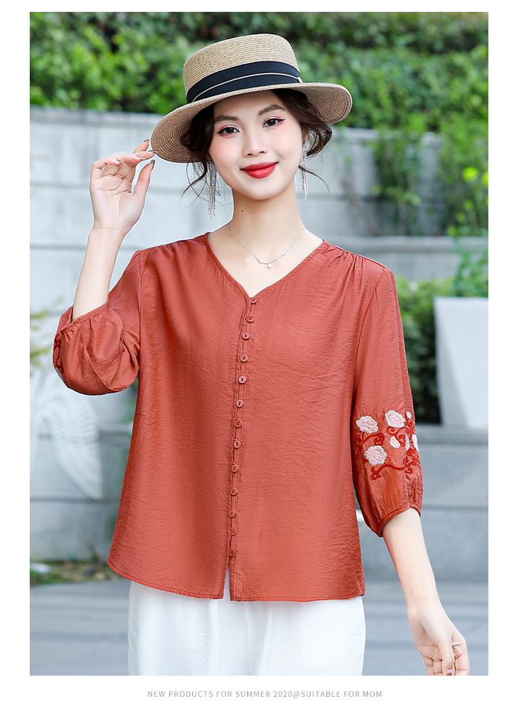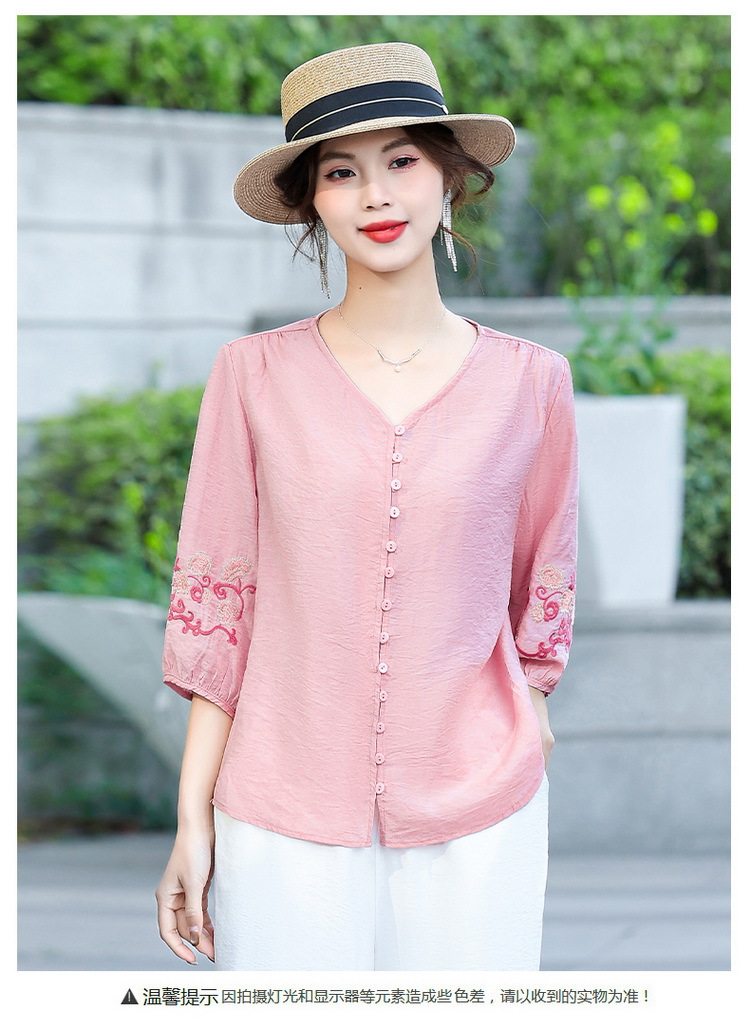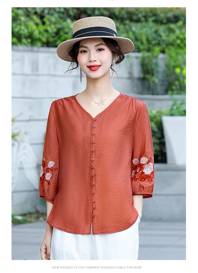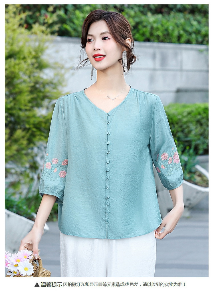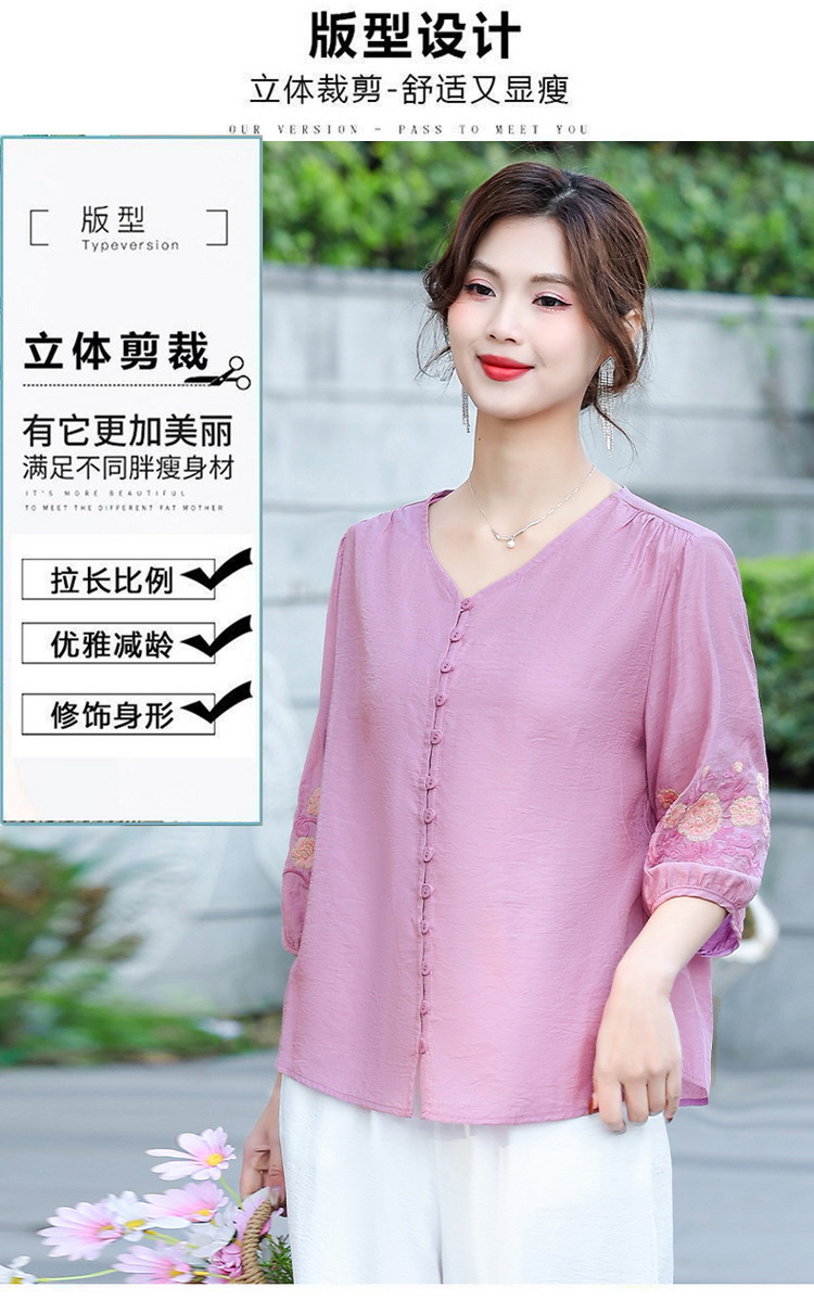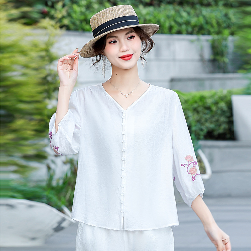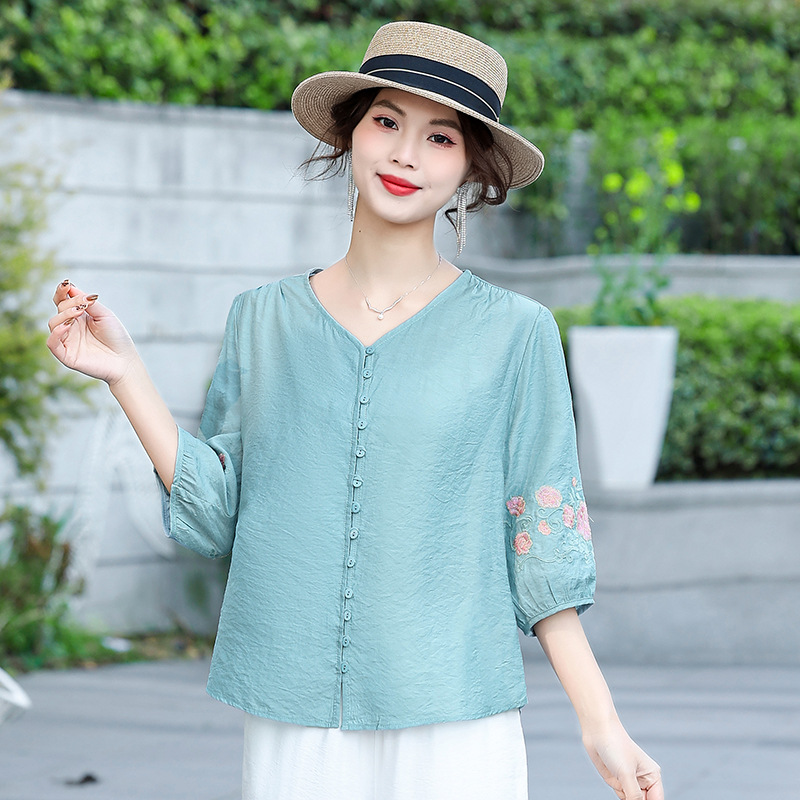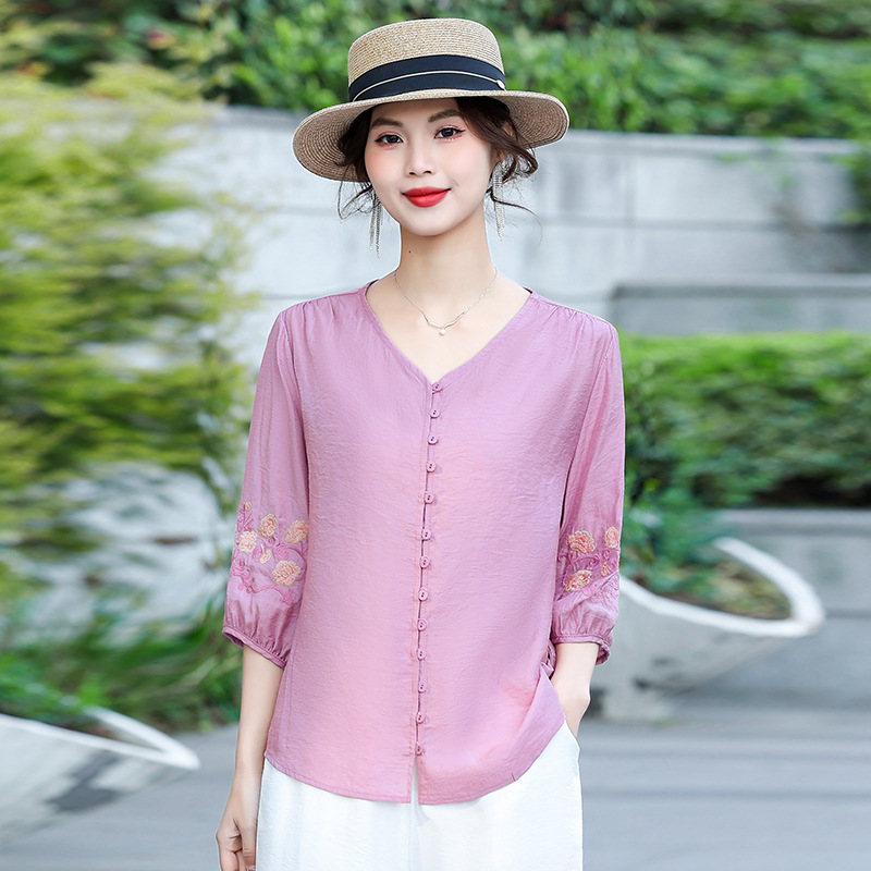 Летние топы в китайском стиле ретро 2025 года, женские рубашки в этническом стиле с вышивкой, больших размеров, с V-образным вырезом, тонкие, три четверти рукава