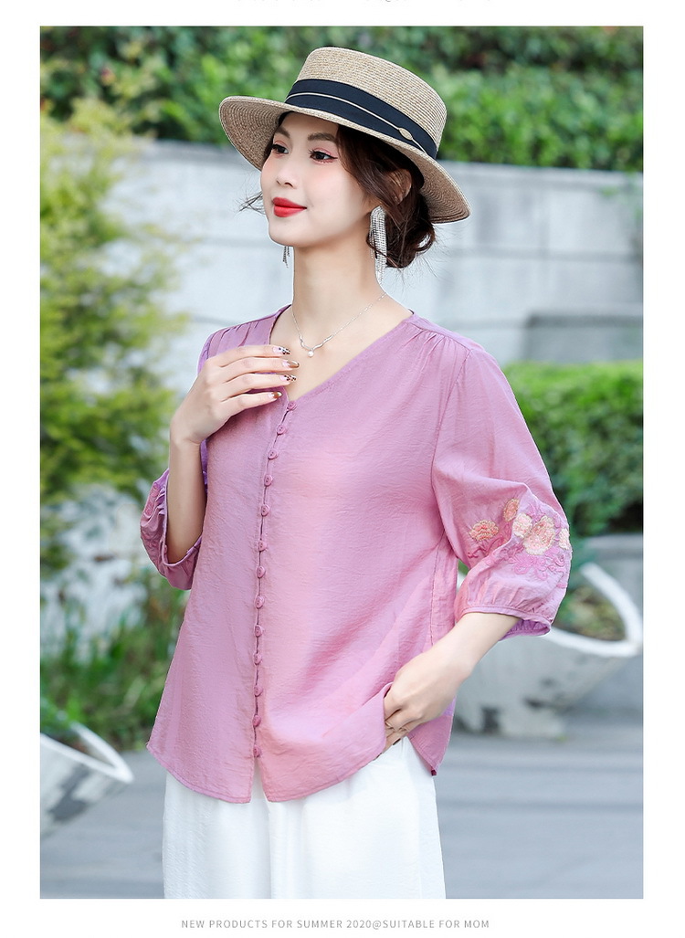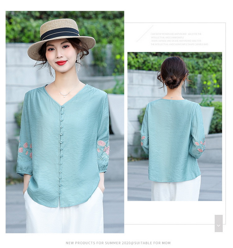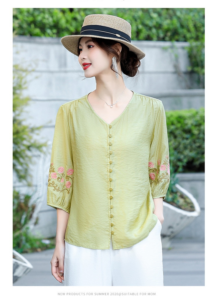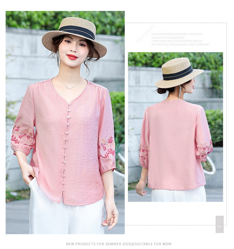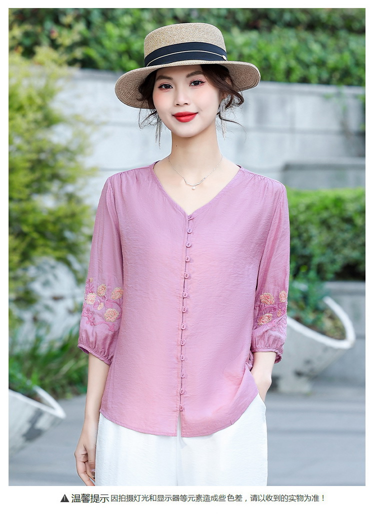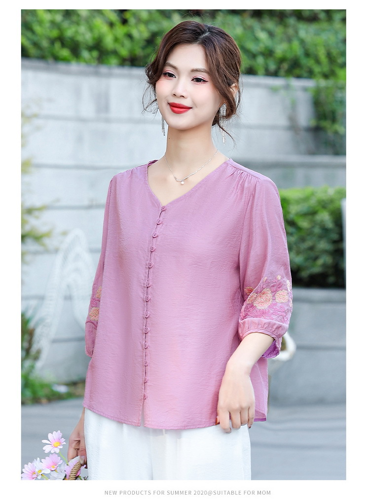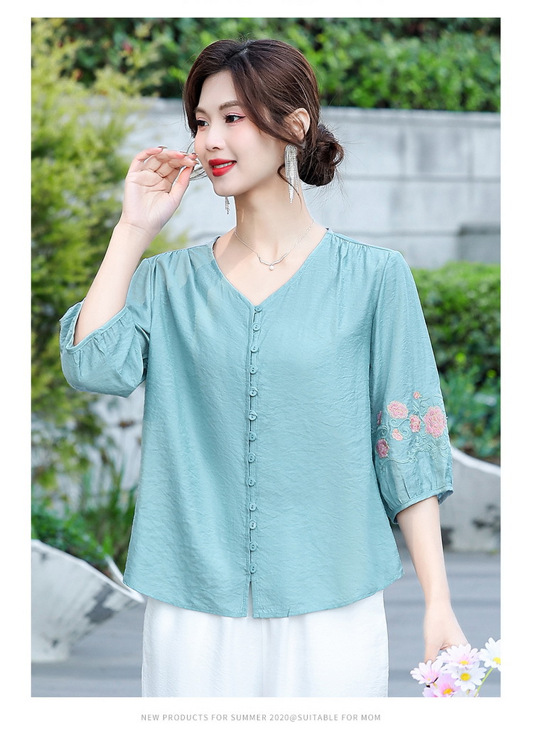 Летние топы в китайском стиле ретро 2025 года, женские рубашки в этническом стиле с вышивкой, больших размеров, с V-образным вырезом, тонкие, три четверти рукава