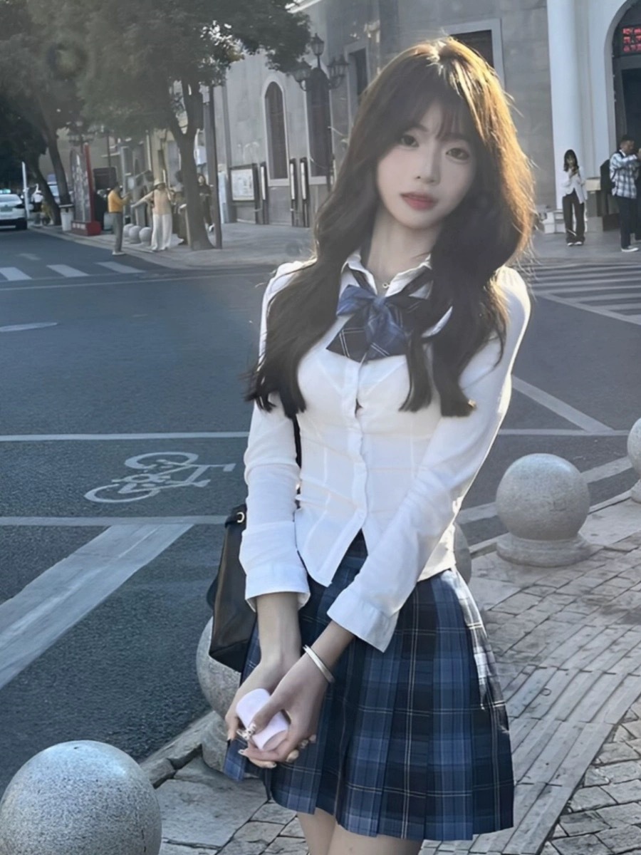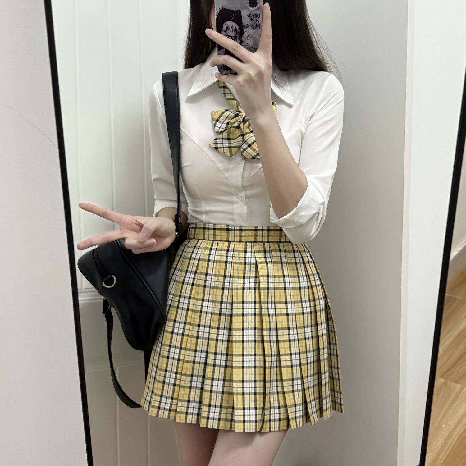 Комплект: рубашка с V-образным вырезом и поясом в стиле JK, приталенная рубашка в стиле преппи, юбка в клетку, японский свежий и нежный стиль.
