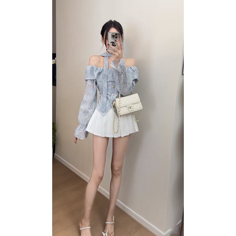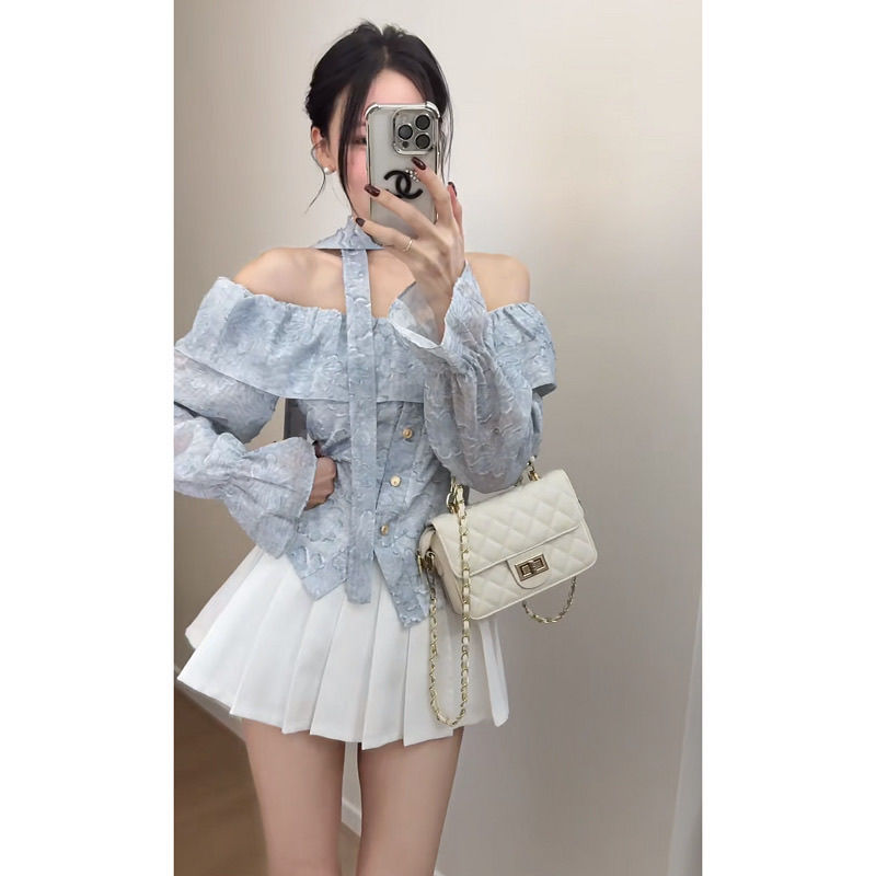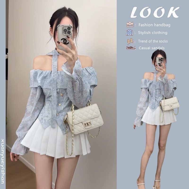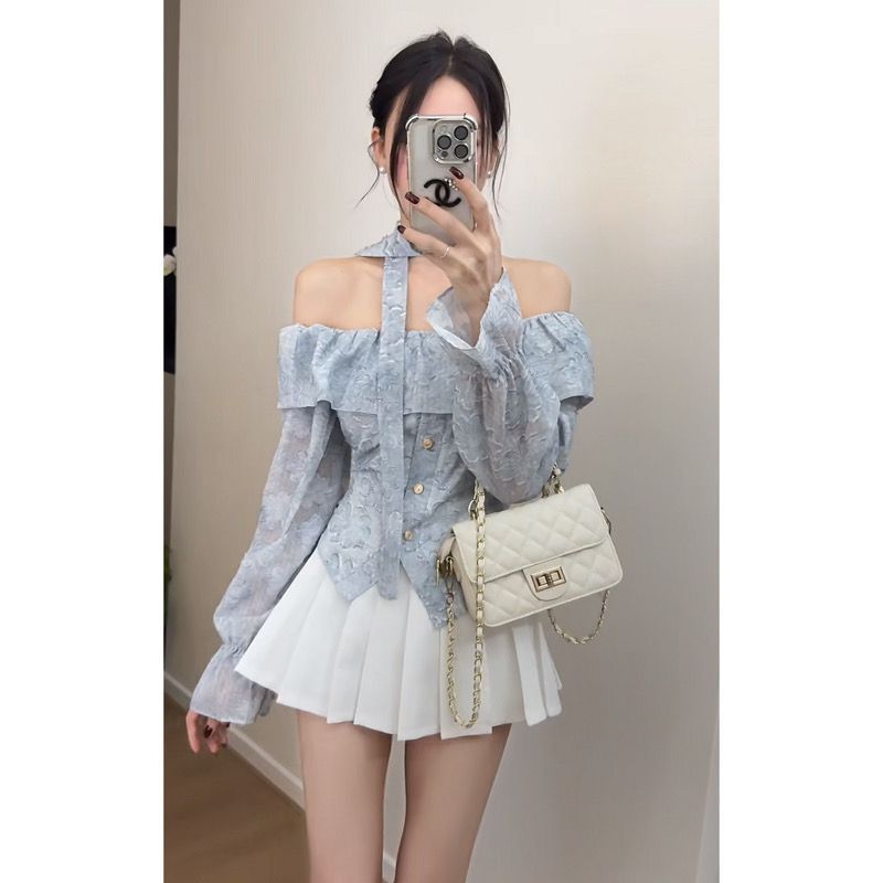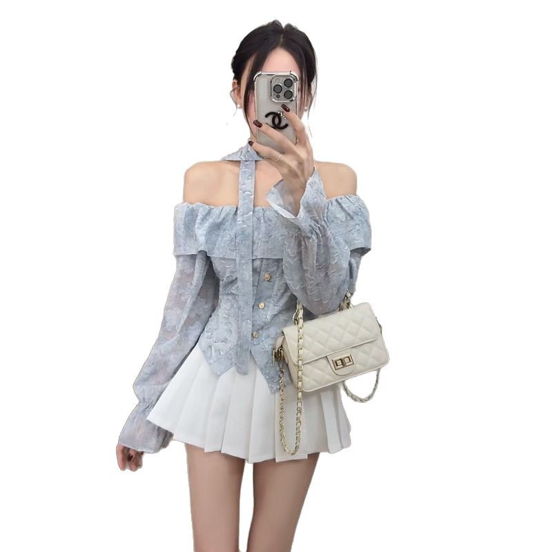 Весенне-летний сладкий и пряный комплект одежды для женщин 2025 года, новый корейский стиль, топ-халтер на одно плечо, плиссированная юбка, костюм из двух предметов