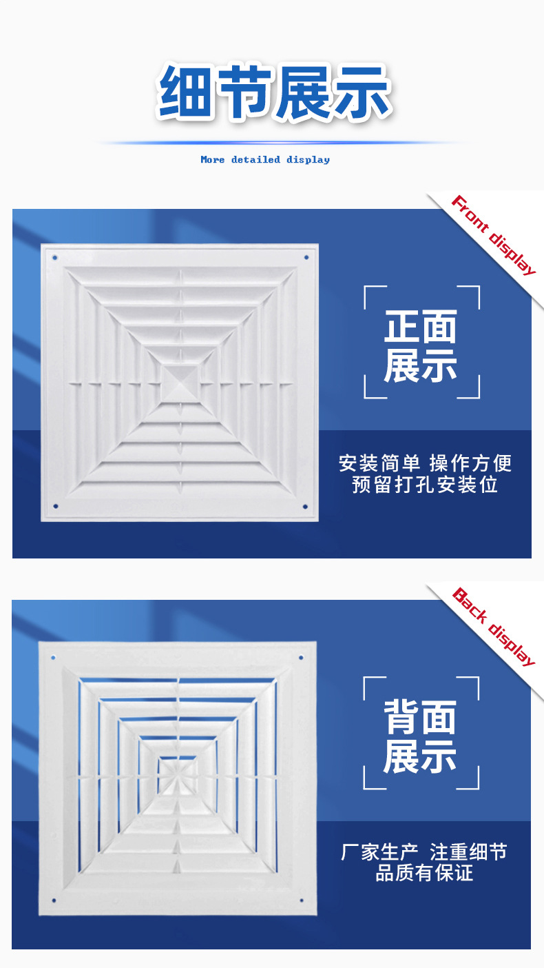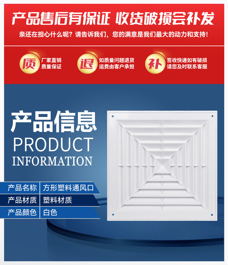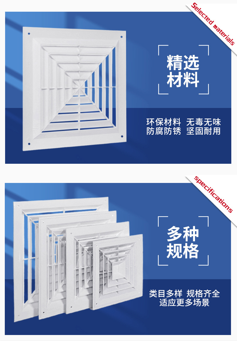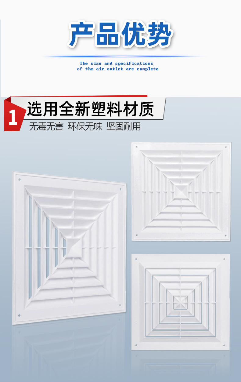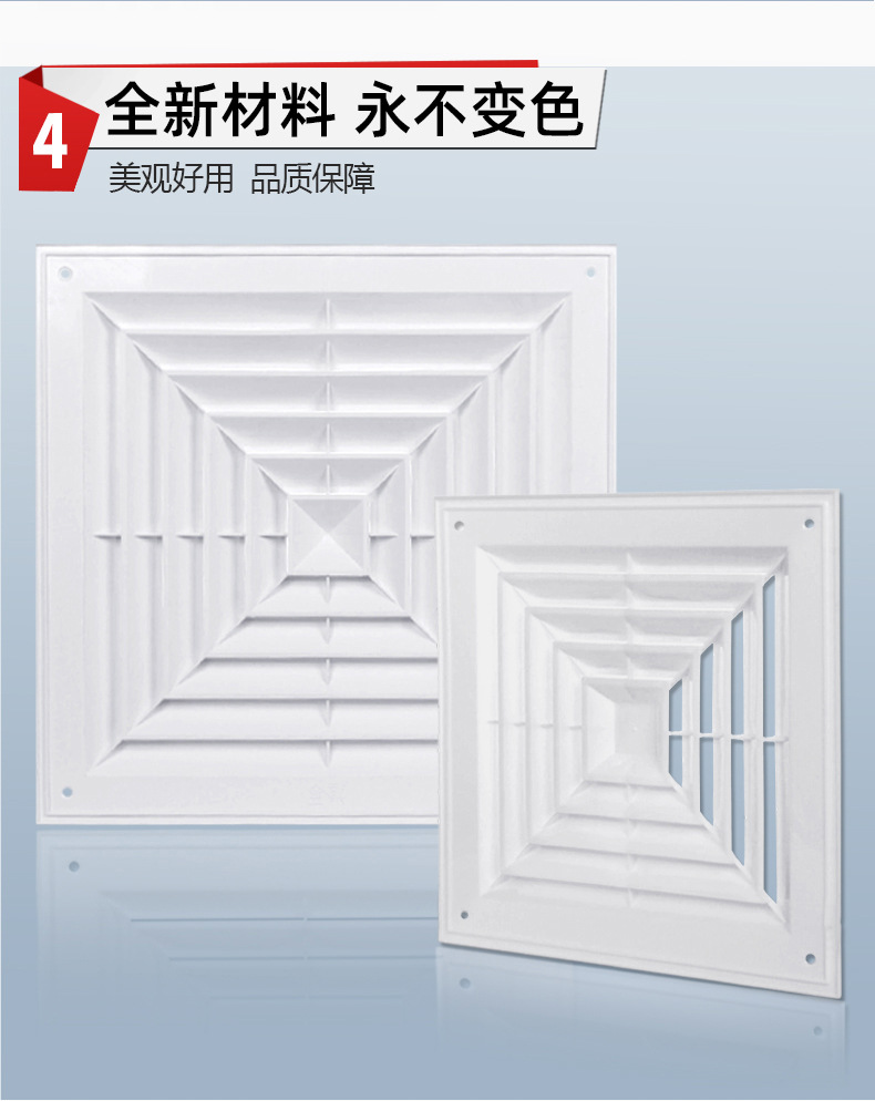 Вентиляционный центральный кондиционер, потолочный пластиковый жалюзийный воздуховод, квадратный диффузор