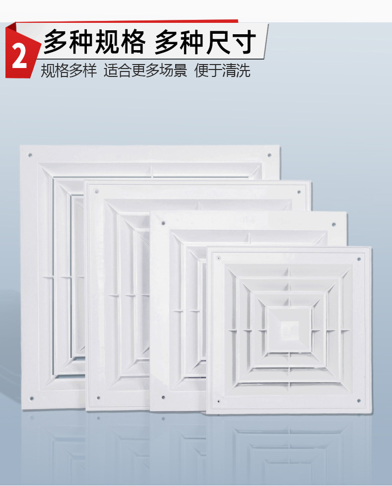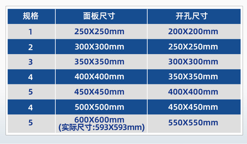 250X250мм (отверстие 200x200мм); 300X300мм (отверстие 250x250мм); 350X350мм (отверстие 300х300мм); 400X400мм (отверстие 350x350мм); 600X600мм (отверстие 550x550мм); Внешний диаметр горизонтальной жалюзи 300*300 (отверстие 250*250); Внешний диаметр горизонтальной жалюзи 400*200 (отверстие 350*150)