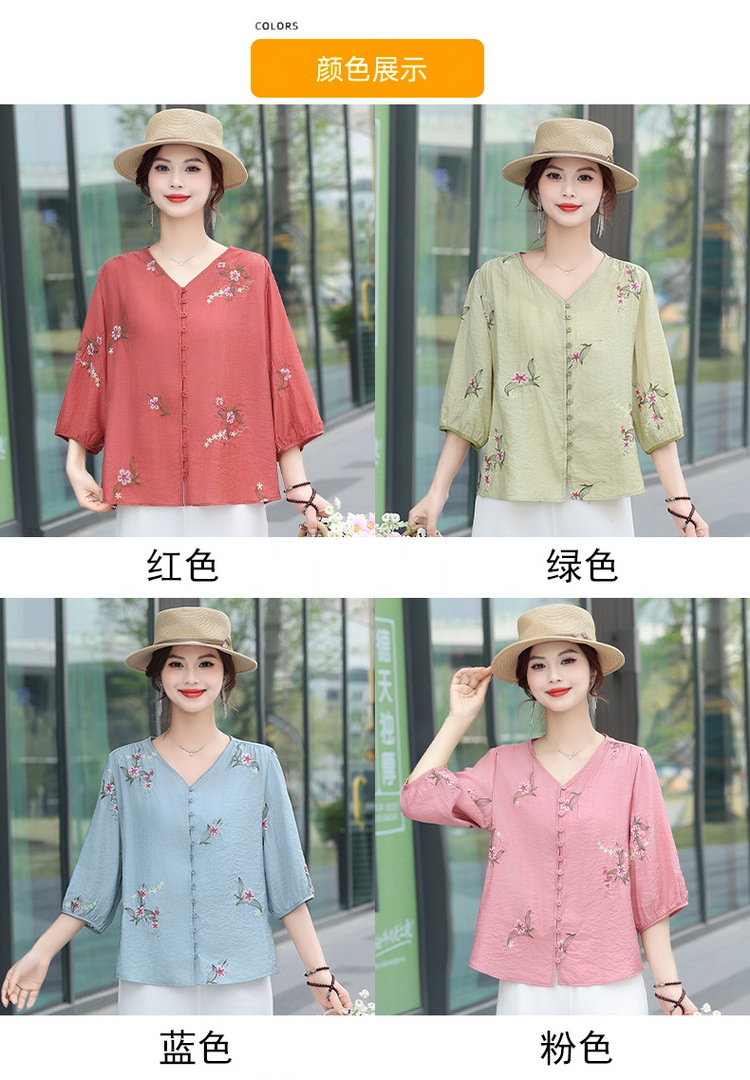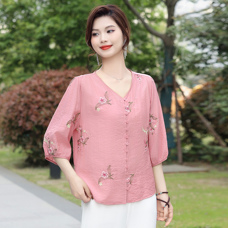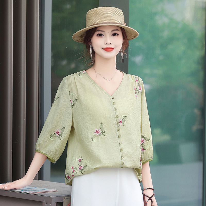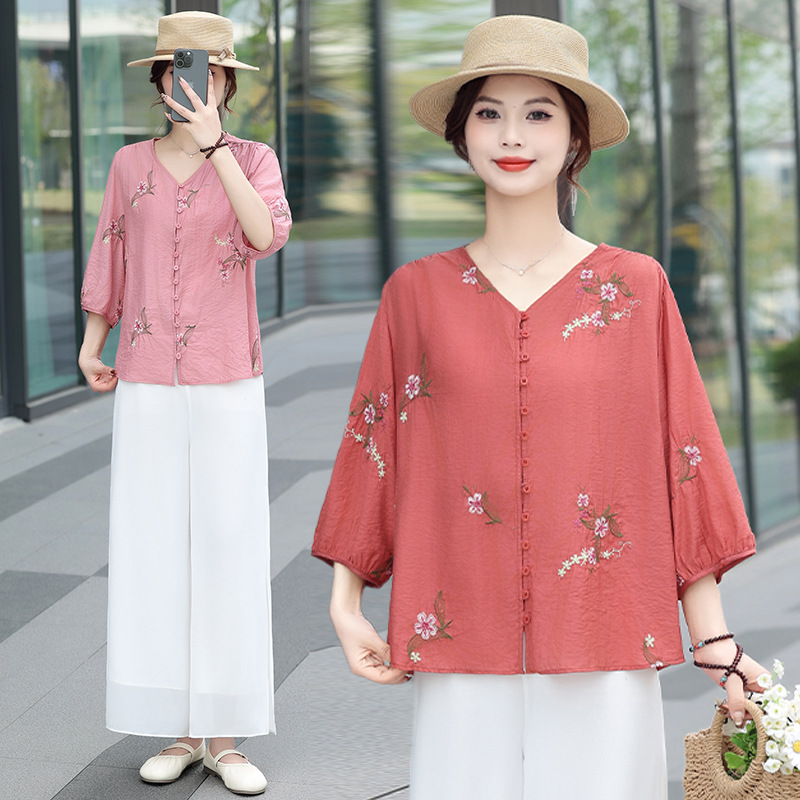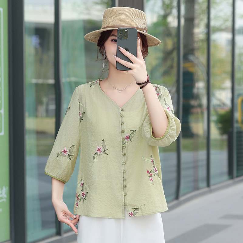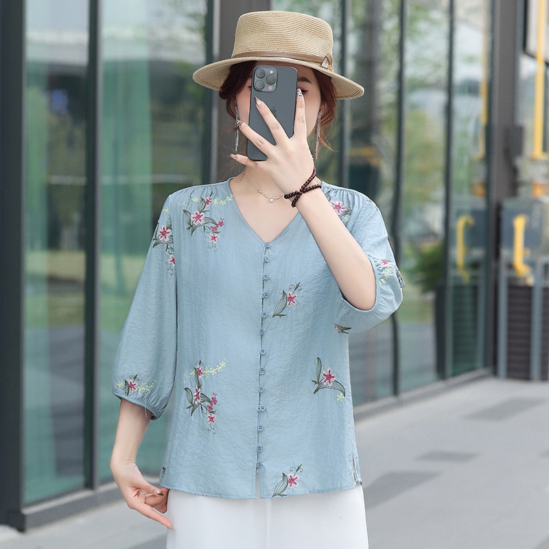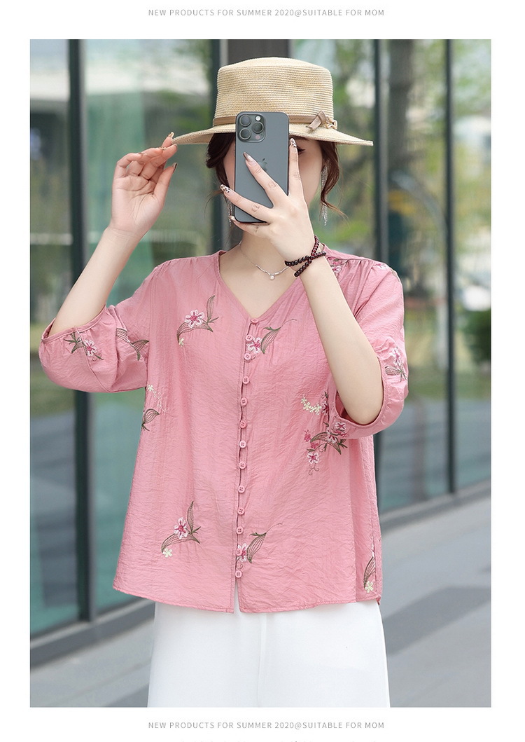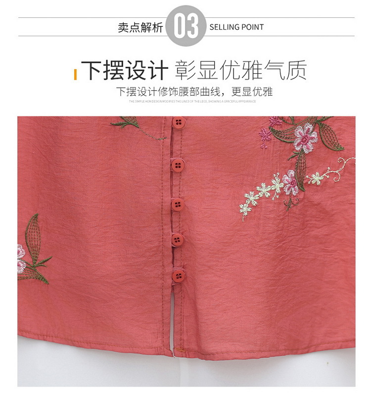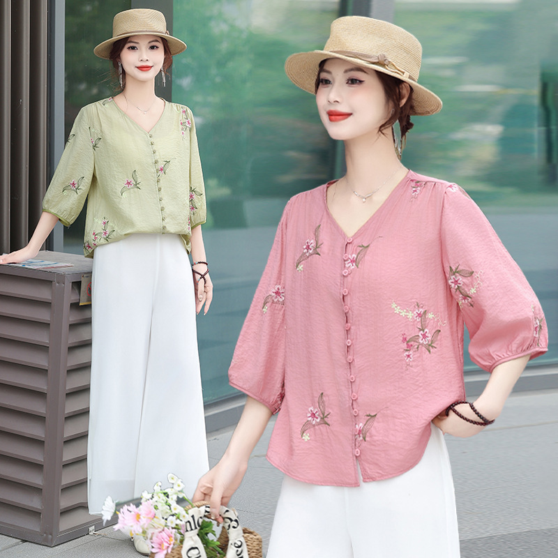 2025 Новый стиль вышитый хлопчатобумажный пиджак с короткими рукавами рубашка женская пуговица
