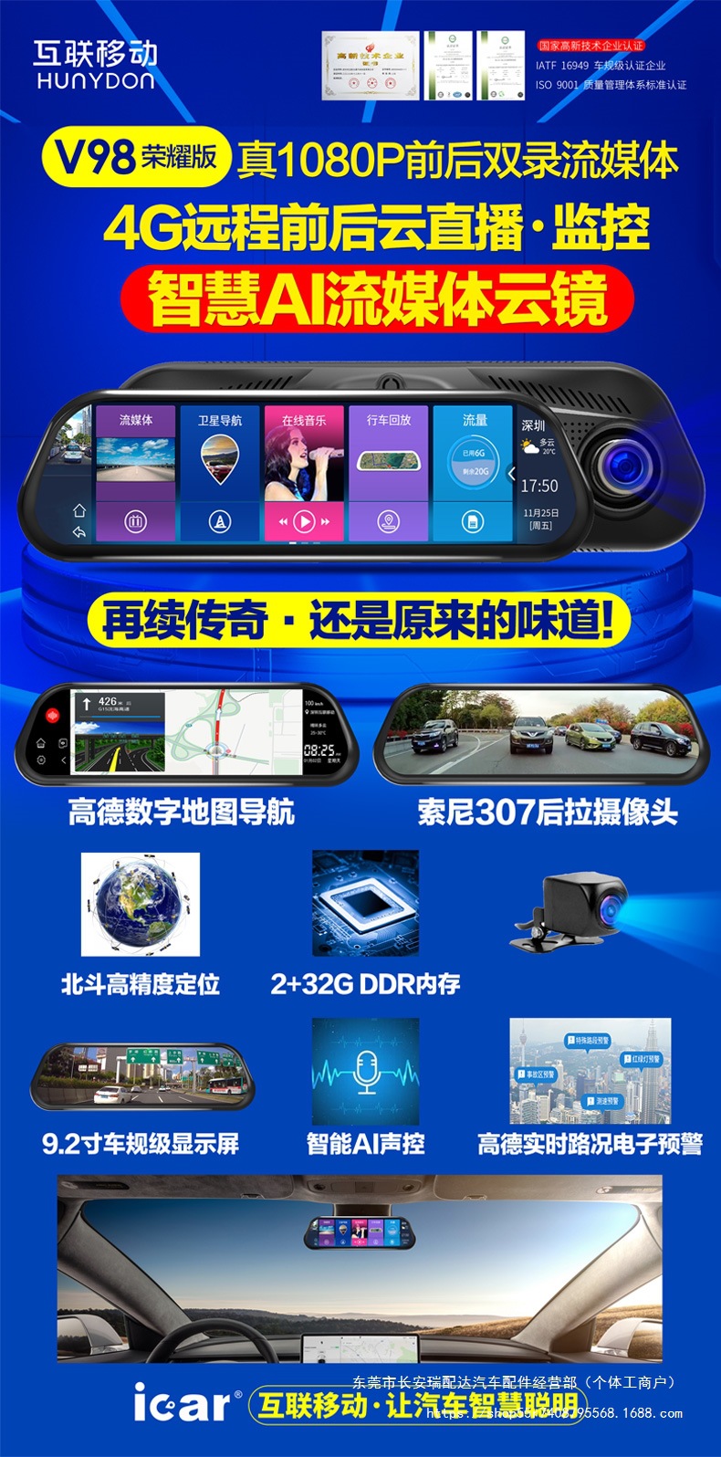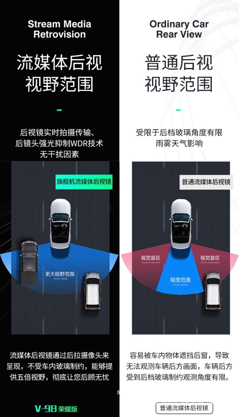 Соединенные мобильные V98 полноэкранные потоковые облачные умные зеркала заднего вида, видеорегистратор, навигация, цифровой пес Yirui