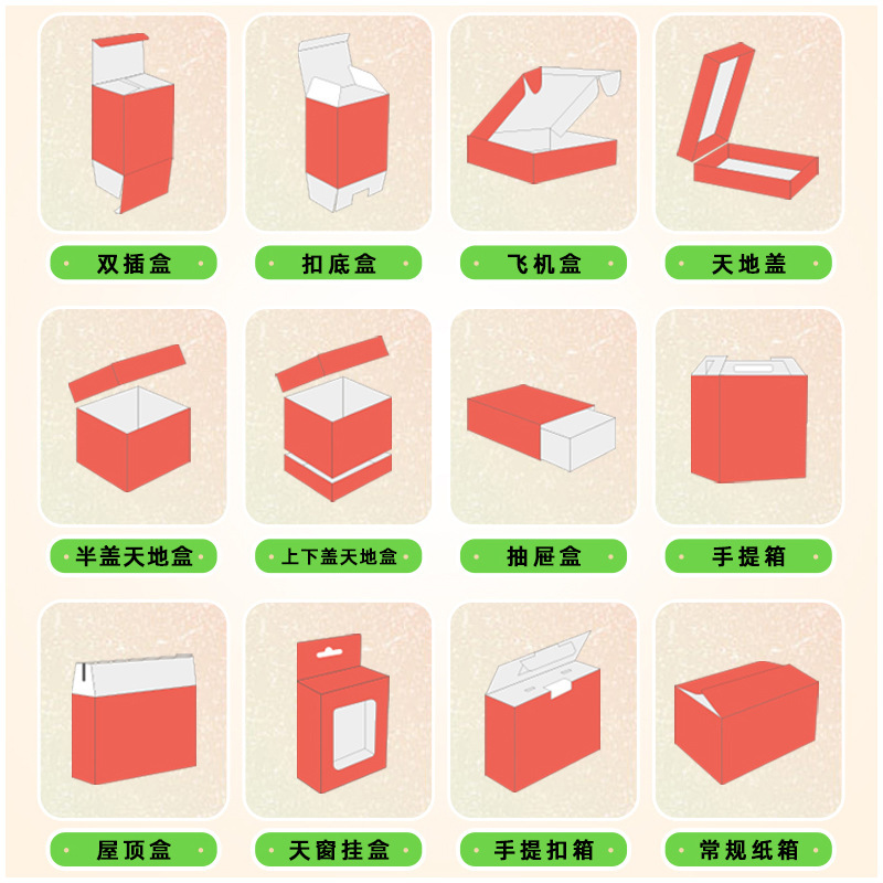 коробка оборота; Общая упаковка; Косметическая упаковка; Упаковка ювелирных изделий; упаковка игрушек; Упаковка аксессуаров для оборудования; Логистическая упаковка; Цифровая упаковка; Упаковка бытовой техники; Упаковка универмагов