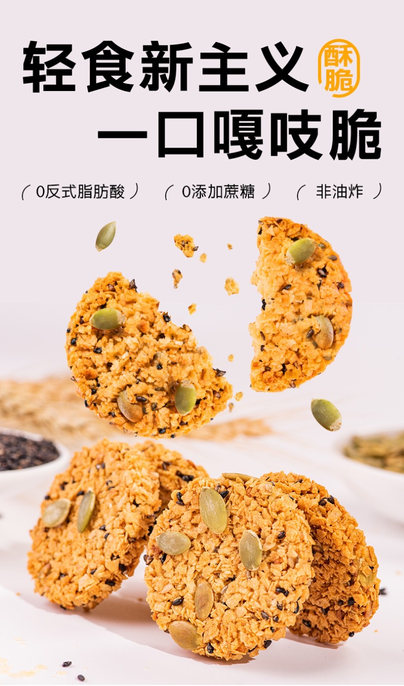 Закуски с высоким содержанием живота из семян тыквы, овсяных хлопьев, хлопьев, кунжута, без сахарозы, цельные зерна, печенья, заменители еды