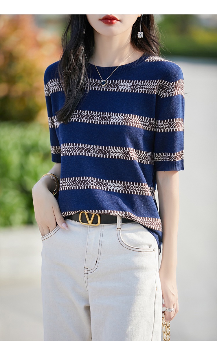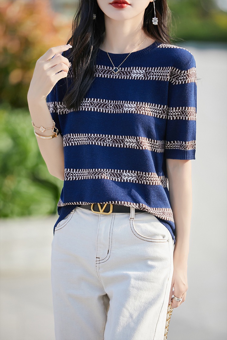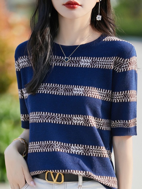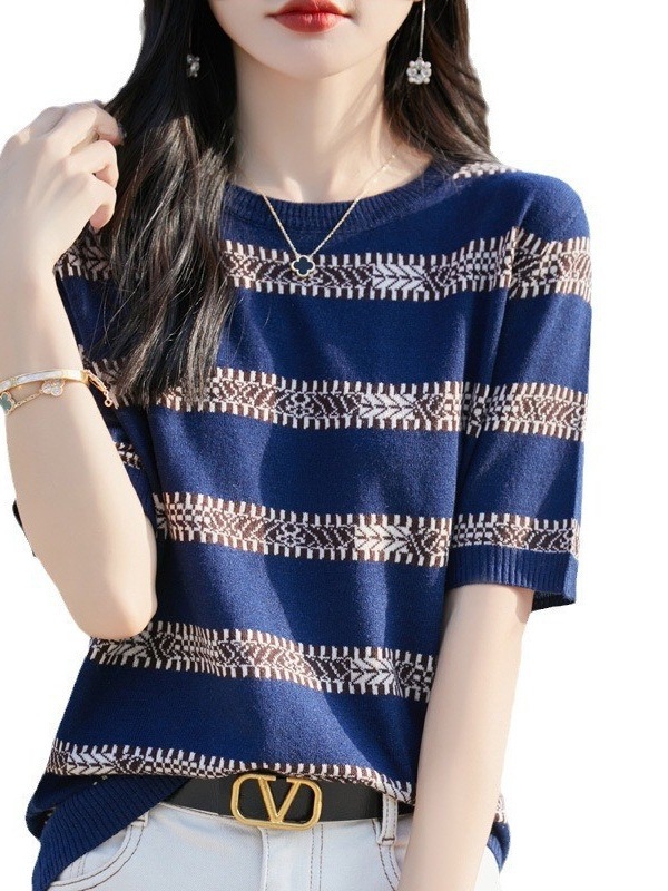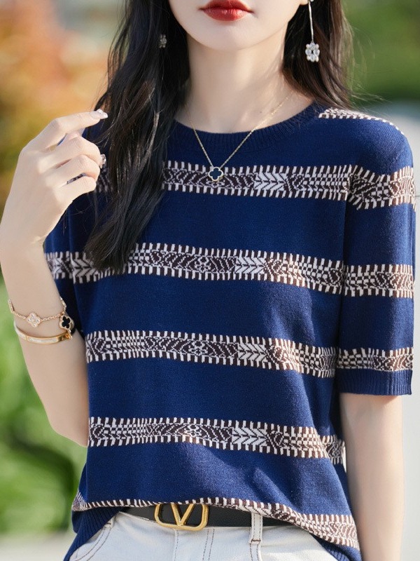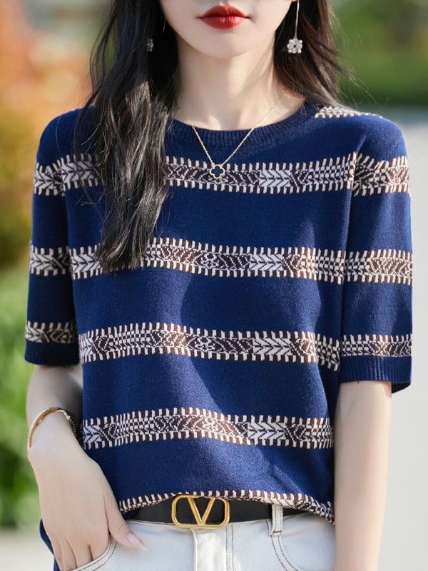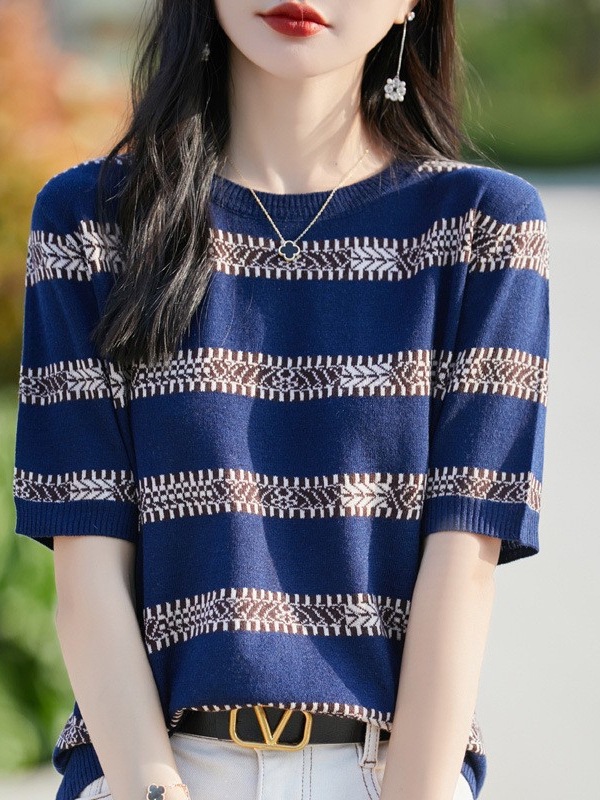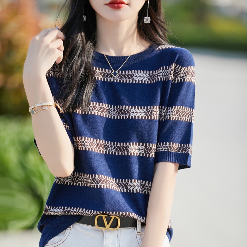 Летний топ 2025 года, женский, с коротким рукавом, круглым вырезом, тонкий, в полоску, ретро, цветные блоки, модный, свободный крой, больших размеров, однотонный, универсальный