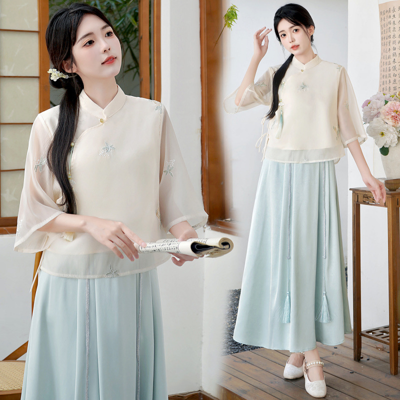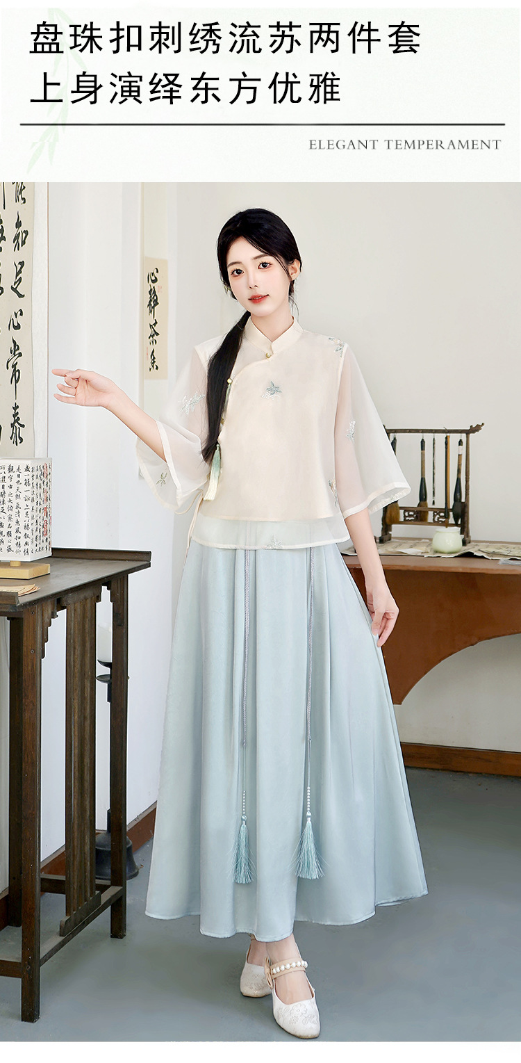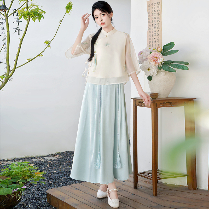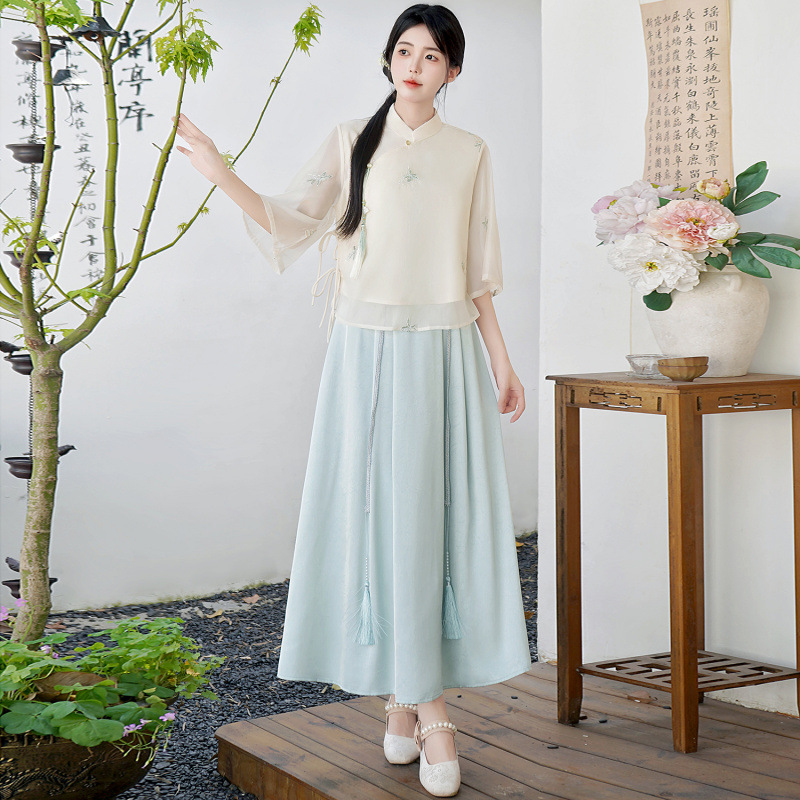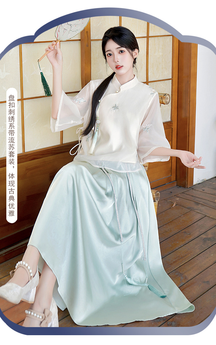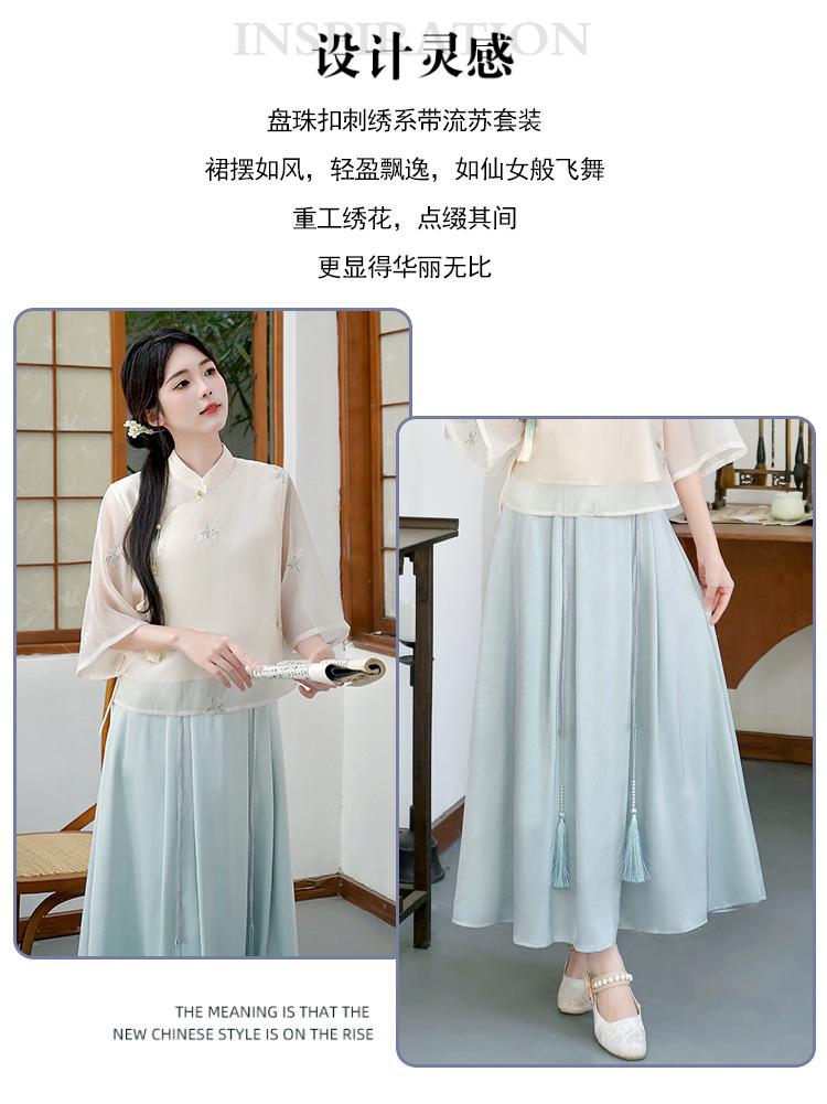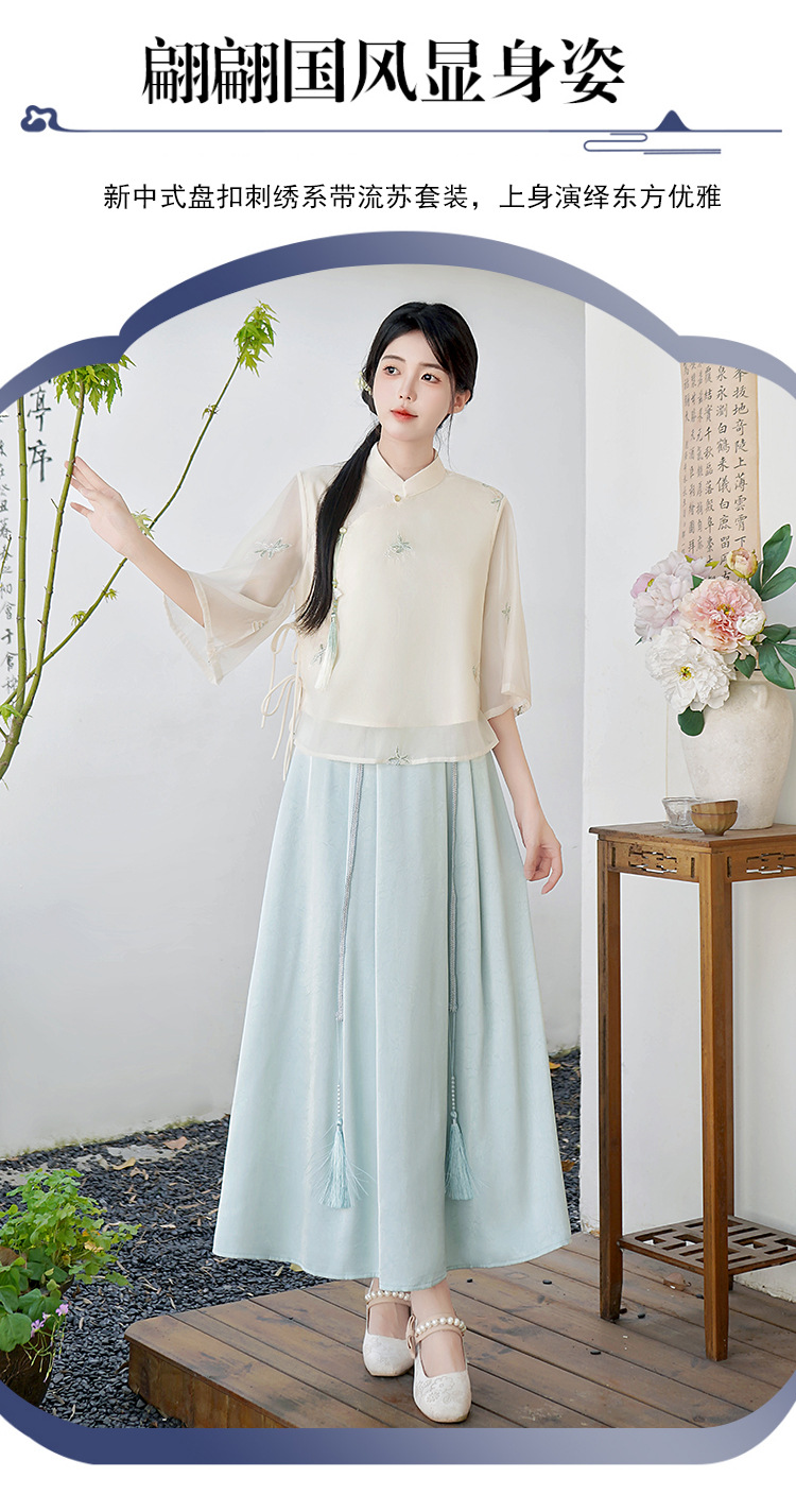 Летний костюм 2025 года в китайском стиле: топ с вышивкой бисером, пуговицами и шнуровкой, рукав три четверти, юбка с кистями.