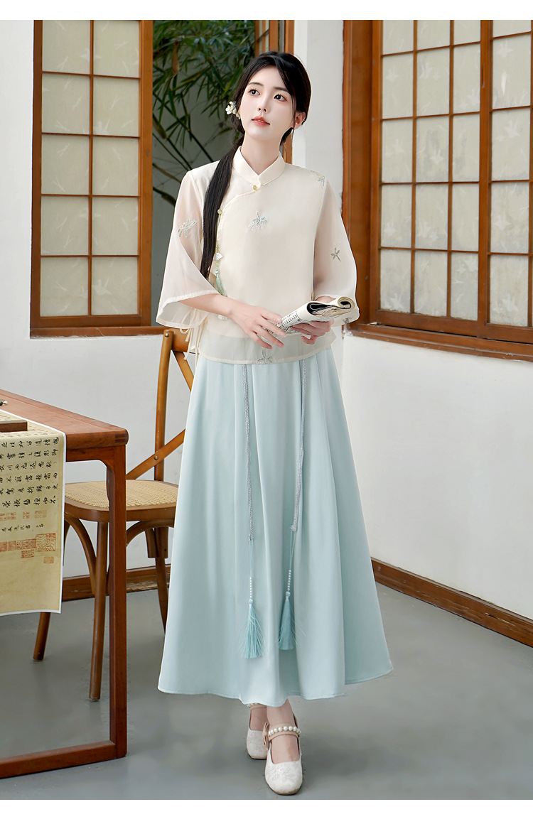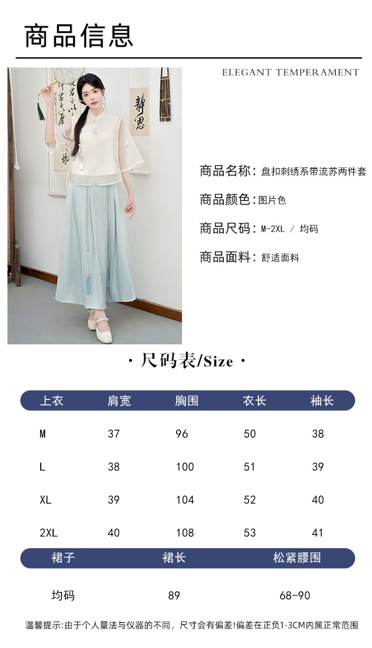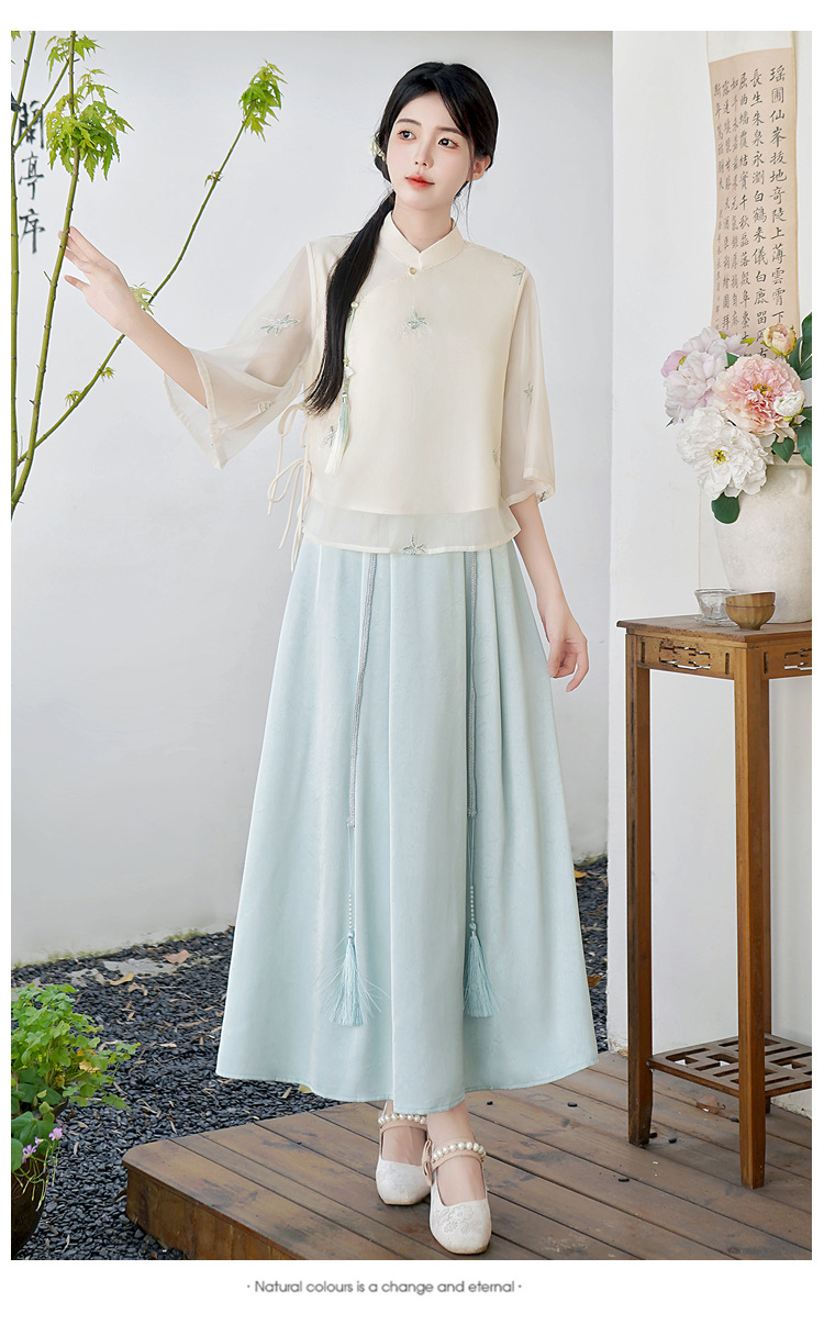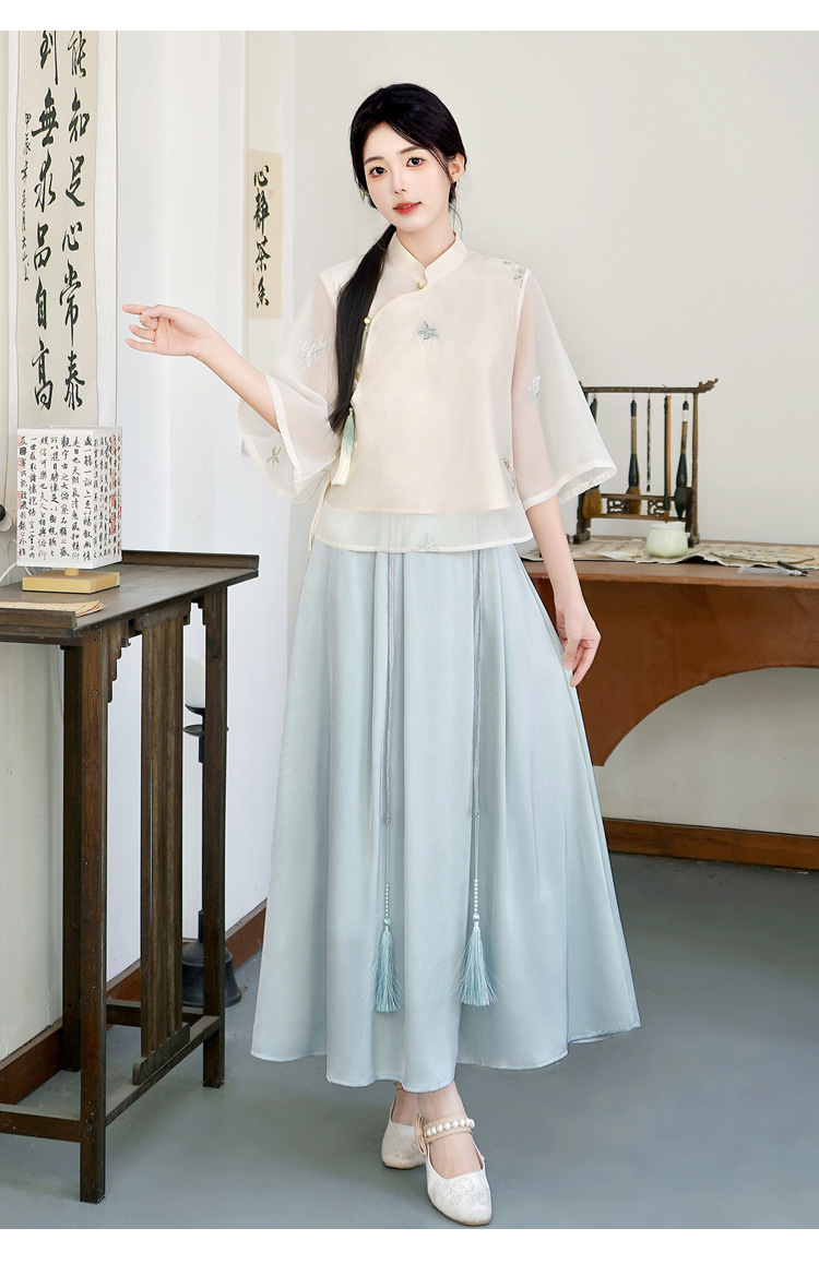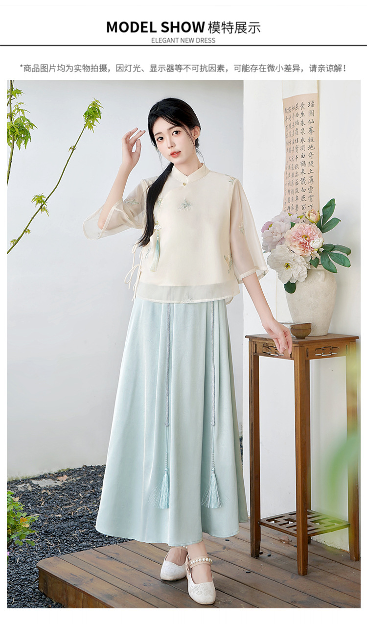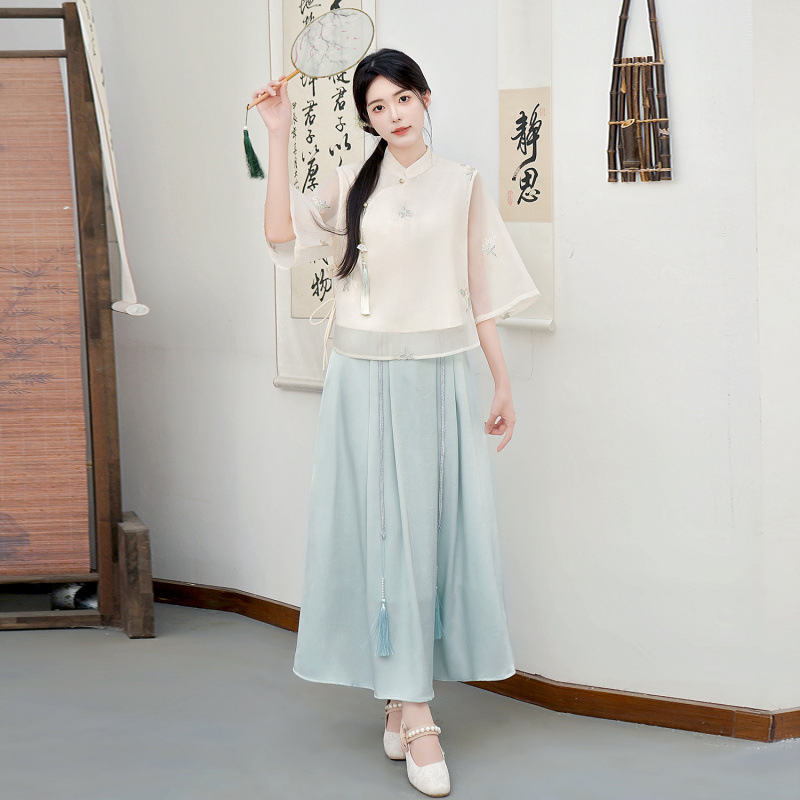 Летний костюм 2025 года в китайском стиле: топ с вышивкой бисером, пуговицами и шнуровкой, рукав три четверти, юбка с кистями.