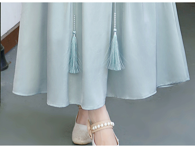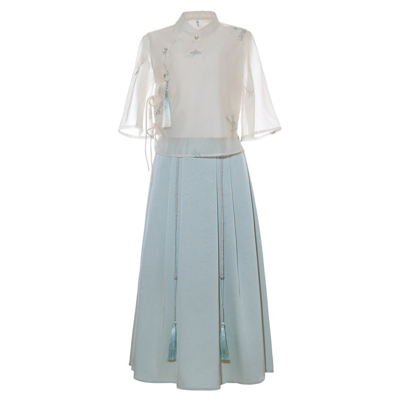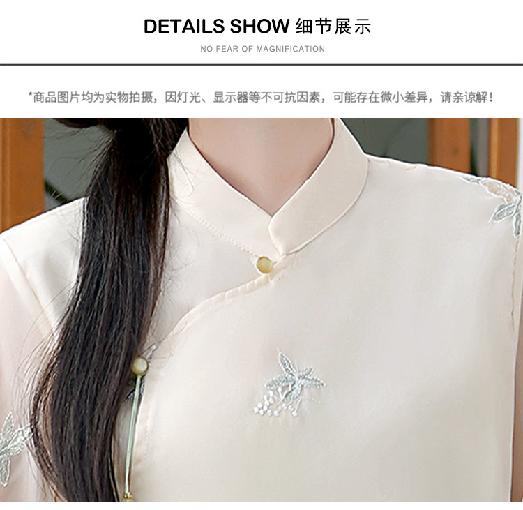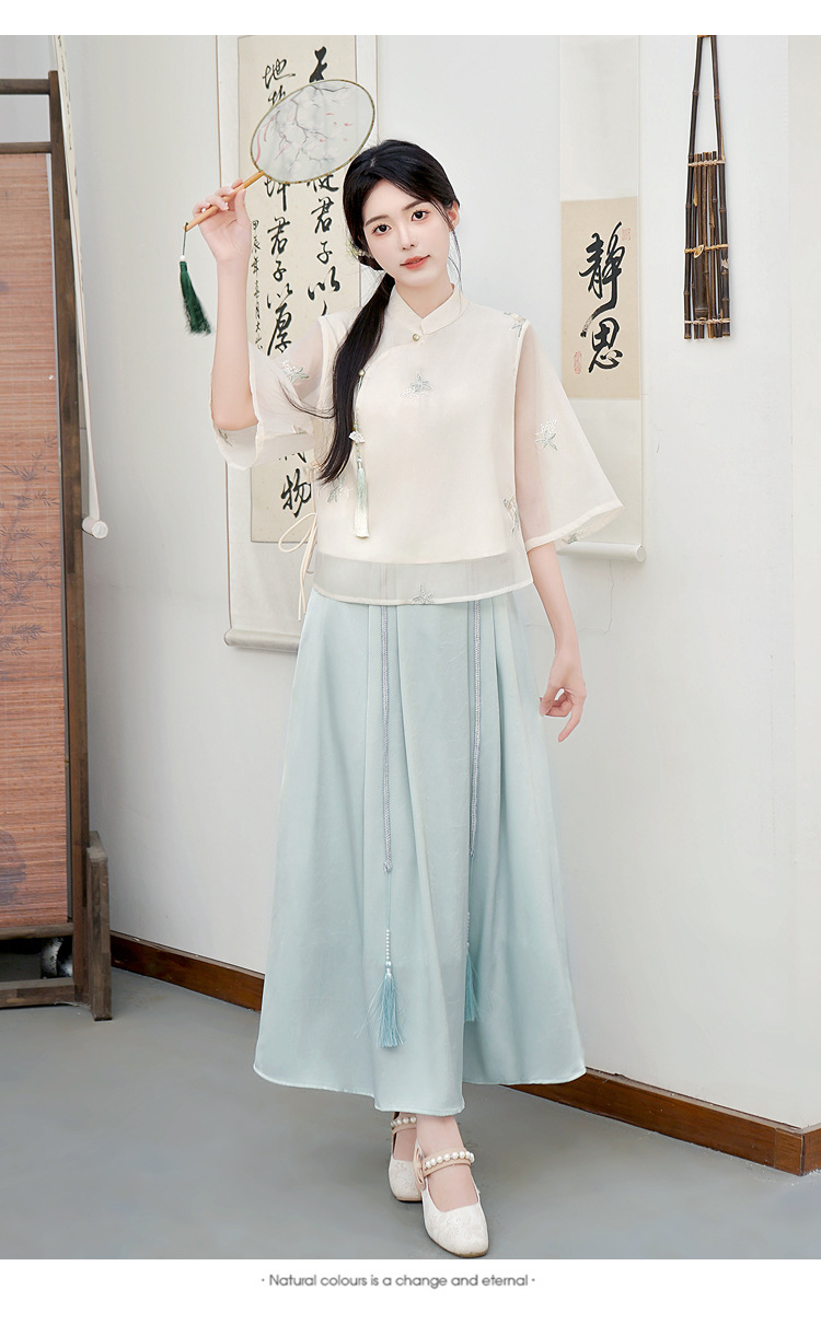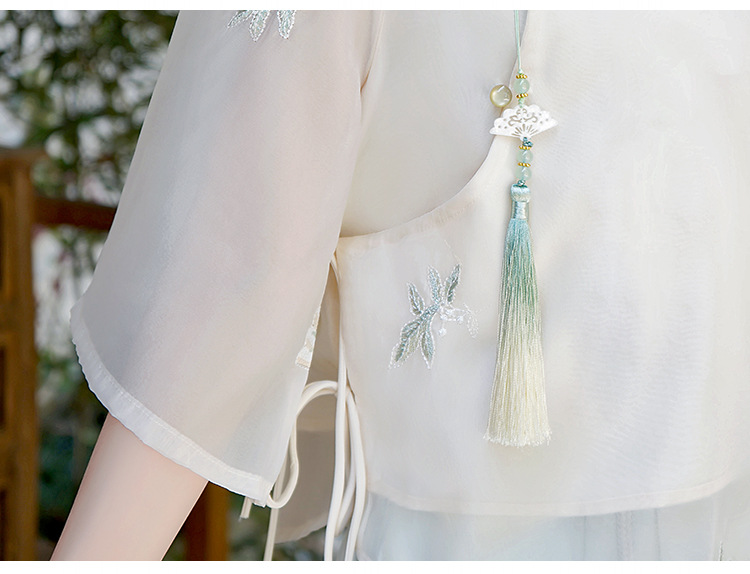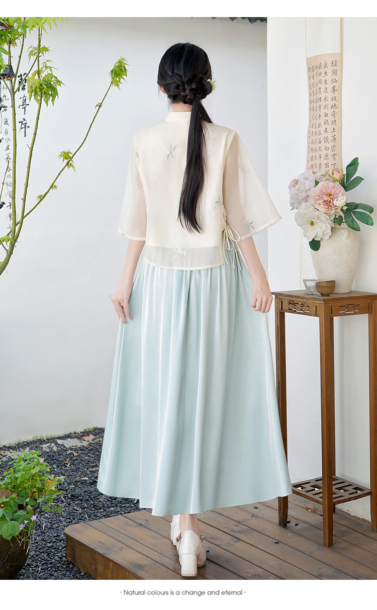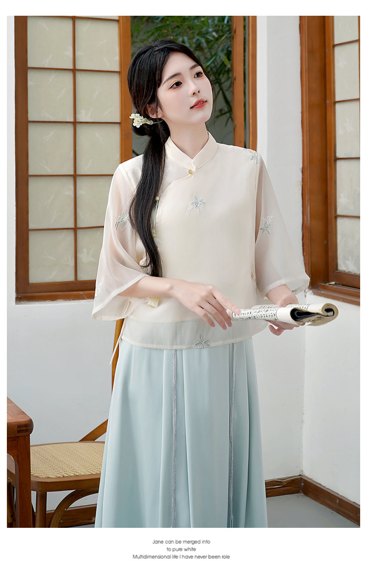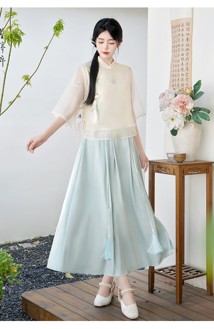 Летний костюм 2025 года в китайском стиле: топ с вышивкой бисером, пуговицами и шнуровкой, рукав три четверти, юбка с кистями.