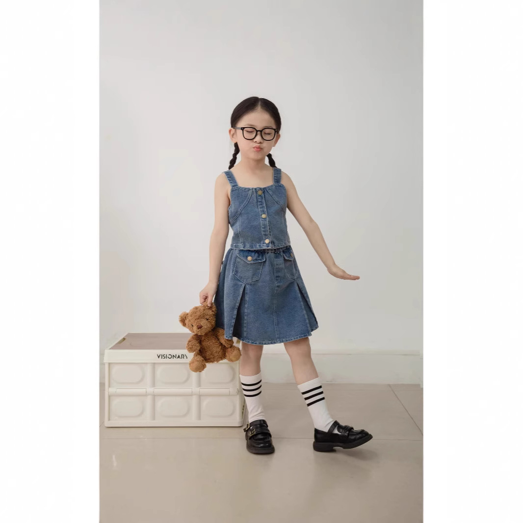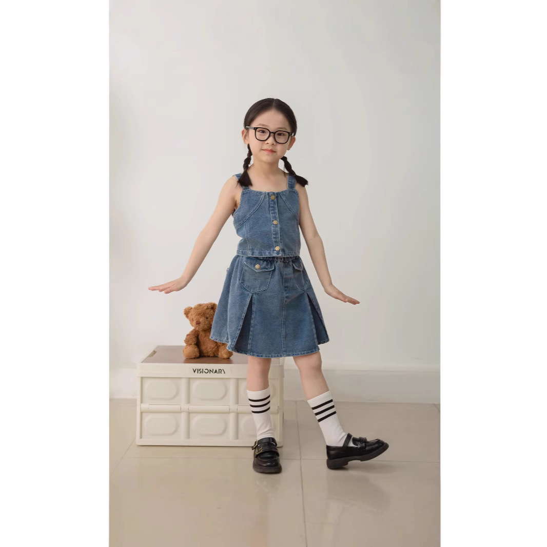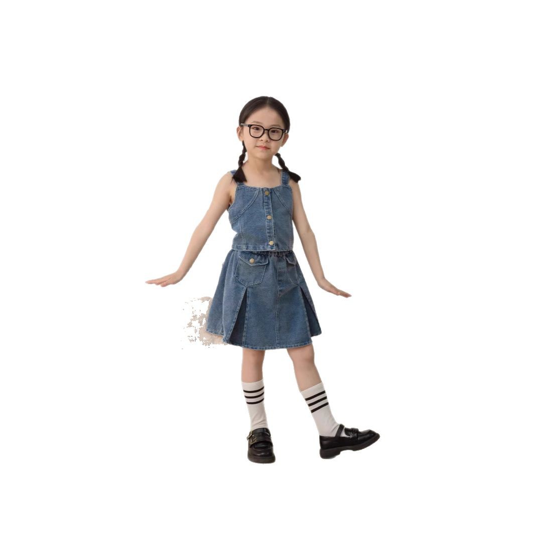 Комплект для девочек: джинсовая юбка-шорты и топ на бретельках, летний наряд 2025, оптовая продажа, модный комплект для девочек