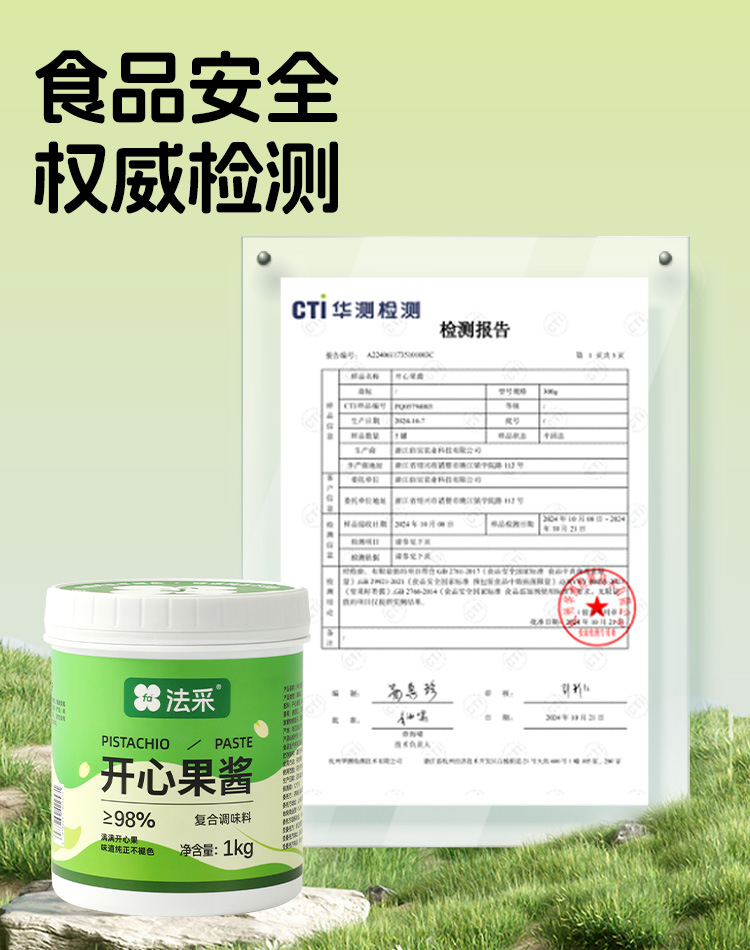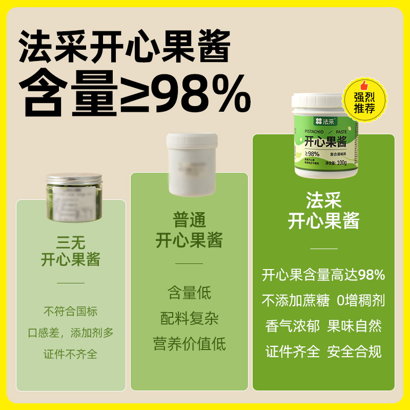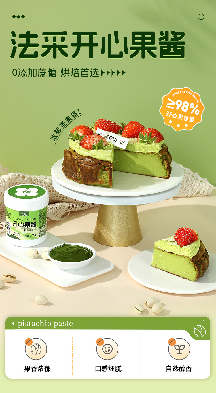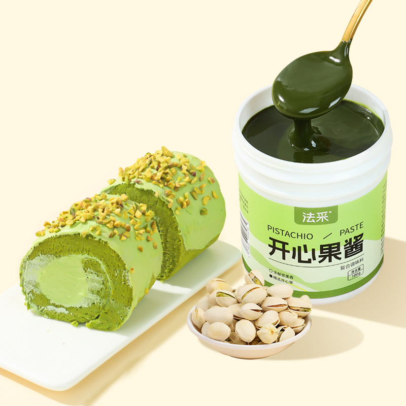 Ингредиенты для макаронных тортов с зеленым джемом из фисташек (98% зеленых фисташек), глазурью и зеленым джемом для коммерческого использования.