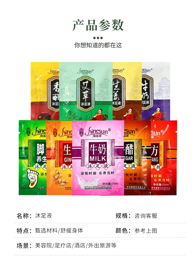 20 мл ароматного уксуса для ванночек для ног; 20 мл молочного раствора для ванночек для ног; 20 мл травяного раствора для ног с полынью; 20 мл имбирной ванны для ног