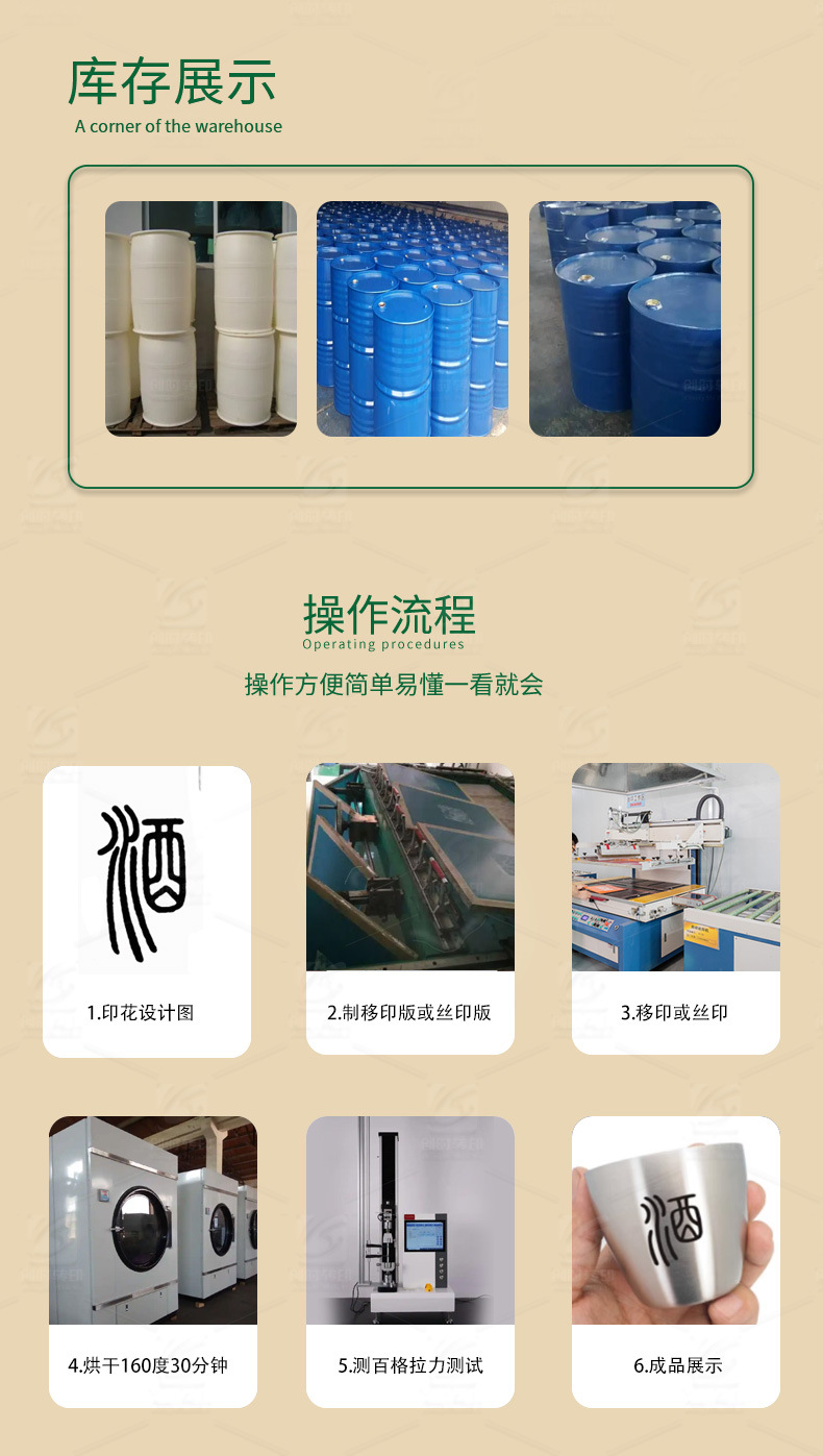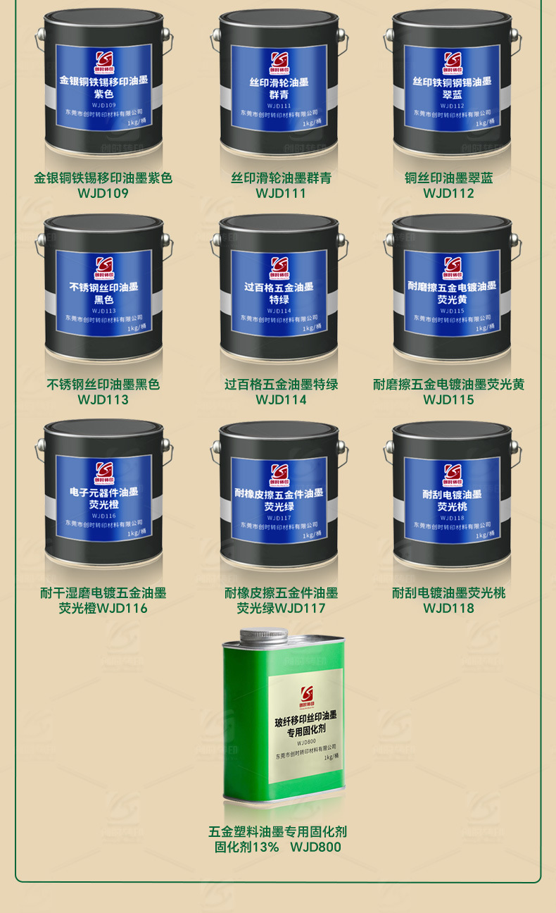 Тушь для трафаретной печати из нержавеющей стали, белая BXG102; Металлическая трафаретная краска для трафаретной печати, прозрачное масло WJD110; Аппаратные чернила для шелкографии белые WJD102; Алюминиевые чернила для тампопечати, оригинальные желтые WJD103; Клей для шелкографии, железные чернила, средний желтый WJD104; Гальванические детали, трафаретная печать, краска для трафаретной печати, красная WJD105; Шелкография POM чернила розово-красные WJD106; Тампопечать PMMA чернила розовые WJD107; Тампопечать трафаретная печать маленькое оборудование чернила оранжевый красный WJD108; Золото, серебро, медь, железо и олово, паста-печать, фиолетовый WJD109; Шелкография шкива чернил ультрамарин WJD111; Медная краска для трафаретной печати изумрудно-синего цвета WJD112; Чернила для трафаретной печати из нержавеющей стали WJD113; Более 100 сеток, аппаратные чернила, специальный зеленый WJD114; Износостойкие аппаратные гальванические чернила флуоресцентно-желтого цвета WJD115; Устойчивые к сухому и влажному шлифованию гальванические чернила флуоресцентно-оранжевого цвета WJD116; Стираемые аппаратные чернила флуоресцентно-зеленого цвета WJD117; Устойчивые к царапинам гальванические чернила флуоресцентного персикового цвета WJD118; Специальный отвердитель для пластиковых чернил для оборудования WJD800; Образец 10 г
