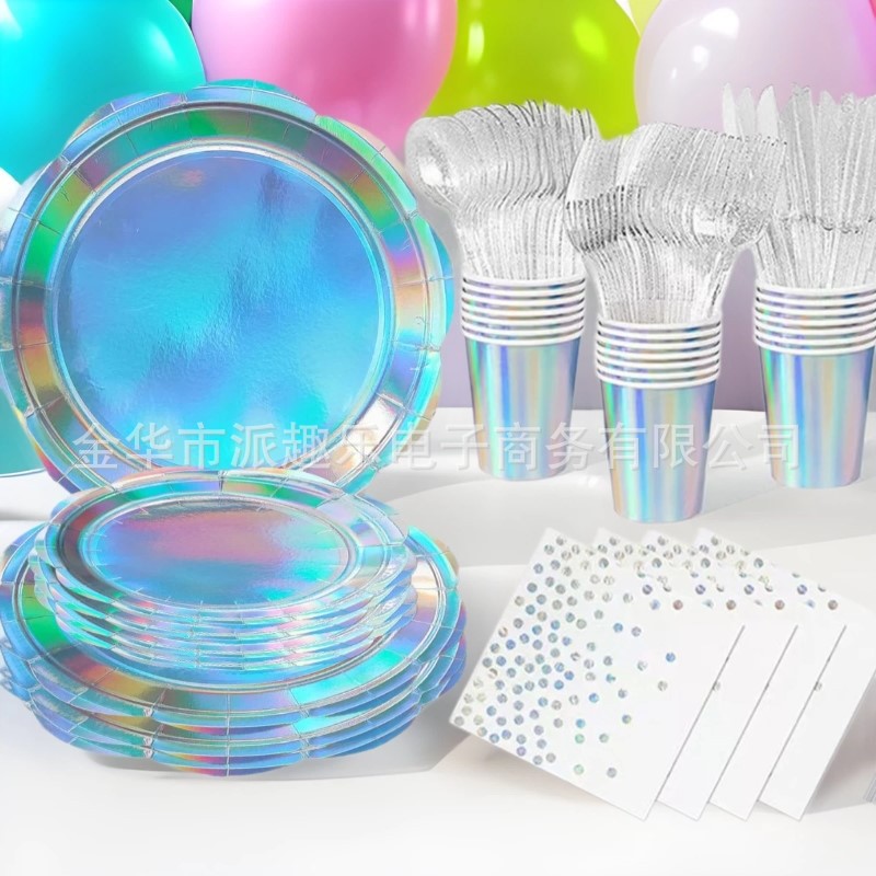 Одноразовая посуда, четырехцветное красочное кружево для вечеринок в лазерной тематике, бумажные тарелки, бумажные стаканчики и бумажные полотенца, прямые продажи с фабрики.