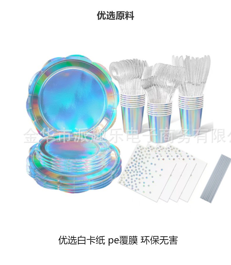 Радужная лазерная пластина 9inch *20; Радужная лазерная пластина 7inch *20; Радужная лазерная чашка*20; Радужная лазерная ткань*20; Серебряный нож*20; Серебряная вилка*20; Серебряная ложка*20; Серебряная соломка*20; Набор радужных лазеров из 8 предметов