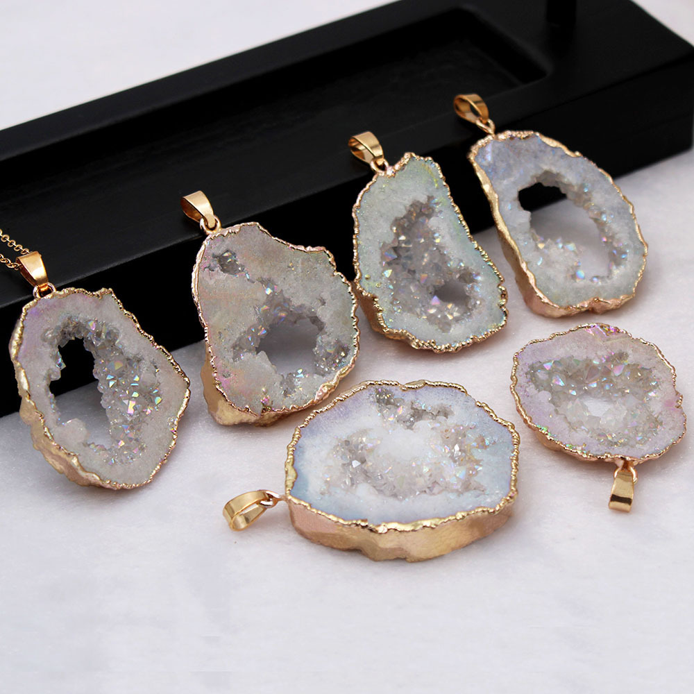 天然玛瑙晶洞切片吊坠随形晶簇切片镀金包边炫彩DIY厂家直销现货