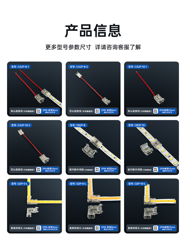 CA2P-8-1 (применимо к световой ленте SMD шириной 8 мм и шириной 2 контакта); CA2P-10-1 (применимо к 2-контактной световой ленте SMD шириной 10 мм); OA2P-5-1 (универсальная световая полоса SMD/COB шириной 5 мм, ширина 2 контакта); OA2P-8-1 (применимо к световой ленте 2pinCOB шириной 8 мм); OA2P-10-1 (применимо к световой ленте 2pinCOB шириной 10 мм); OA2P-5-2 (универсальная световая полоса SMD/COB шириной 5 мм, ширина 2 контакта); CA2P-8-2 (применимо к 2-контактной световой ленте SMD шириной 8 мм); CA2P-10-2 (применимо к 2-контактной световой ленте SMD шириной 10 мм); OA2P-8-2 (применимо к световой полосе 2pinCOB шириной 8 мм); OA2P-10-2 (применимо к световой ленте 2pinCOB шириной 10 мм); OB2P-5 (универсальная световая полоса SMD/COB шириной 5 мм, ширина 2 контакта); OB2P-8 (применимо к световой ленте 2pinCOB шириной 8 мм); OB2P-10 (применимо к световой ленте 2pinCOB шириной 10 мм); CB2P-8 (применимо к 2-контактной световой ленте SMD шириной 8 мм); CB2P-10 (применимо к 2-контактной световой ленте SMD шириной 10 мм); O2P-5-L (универсальная световая полоса SMD/COB шириной 5 мм, ширина 2 контакта); O2P-8-L (применимо к световой полосе 2pinCOB шириной 8 мм); O2P-10-L (применимо к световой ленте 2pinCOB шириной 10 мм); HO2P-8-L (универсальная световая полоса SMD/COB шириной 8 мм, ширина 2 контакта); HO2P-10-L (универсальная световая полоса SMD/COB шириной 10 мм, 2 контакта)
