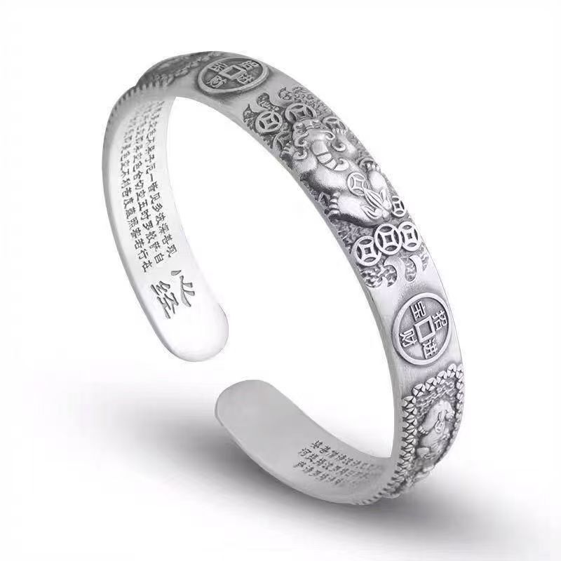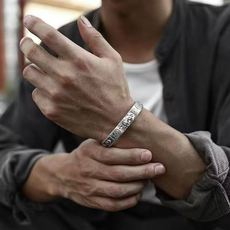 Винтажный открытый браслет из сплава с надписями, привлекающими богатство, и благоприятными узорами, тонко вырезанный, чтобы подчеркнуть восточный шарм.
