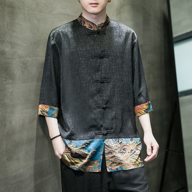 Мужской костюм Тан, летняя тонкая рубашка из ледяного шелка с короткими рукавами в китайском стиле, антикварный костюм Zhongshan, большой размер, улучшенная династия Хань
