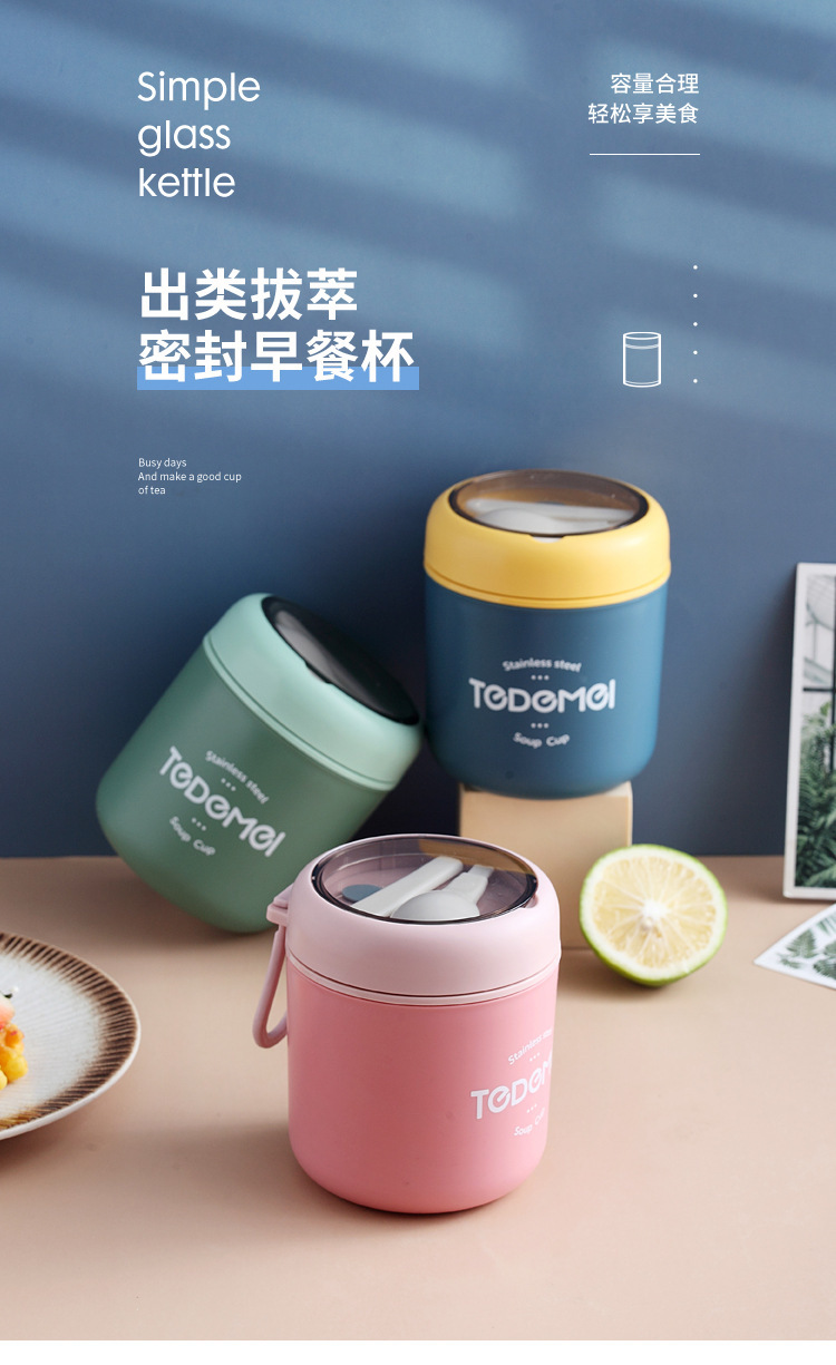 Дети могут использовать герметичную чашку для завтрака с ложкой, чашку для молока, удобную чашку, изолированную чашку для супа из нержавеющей стали 304 в японском стиле.