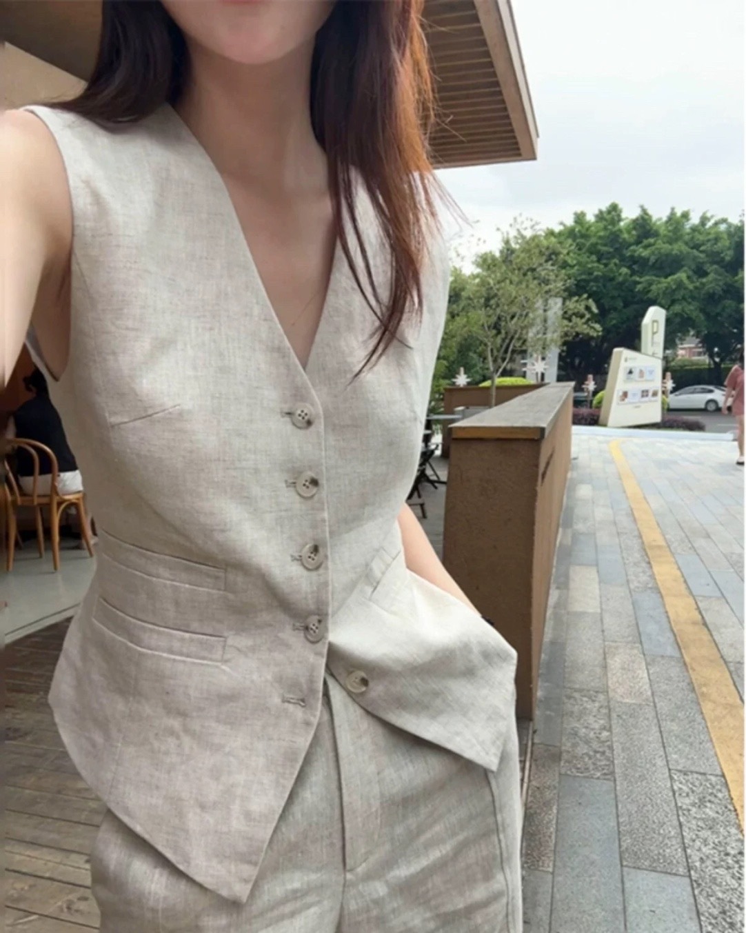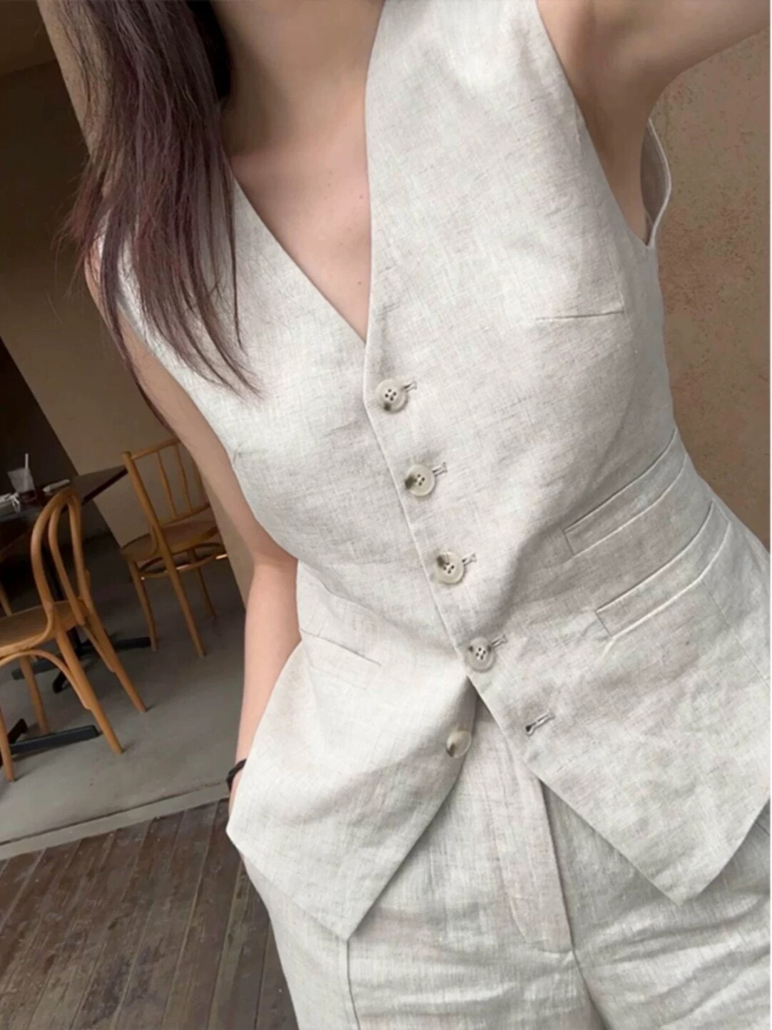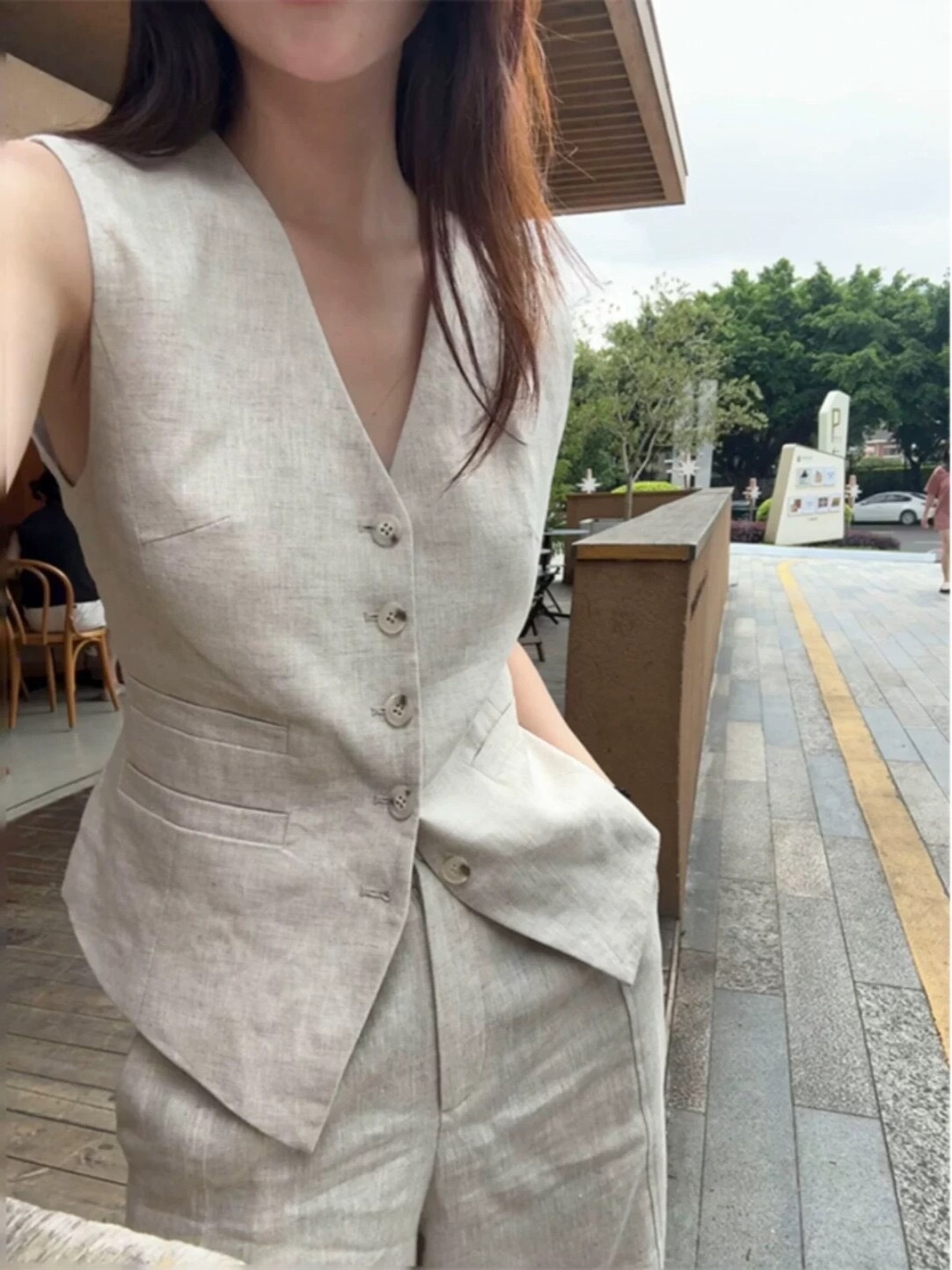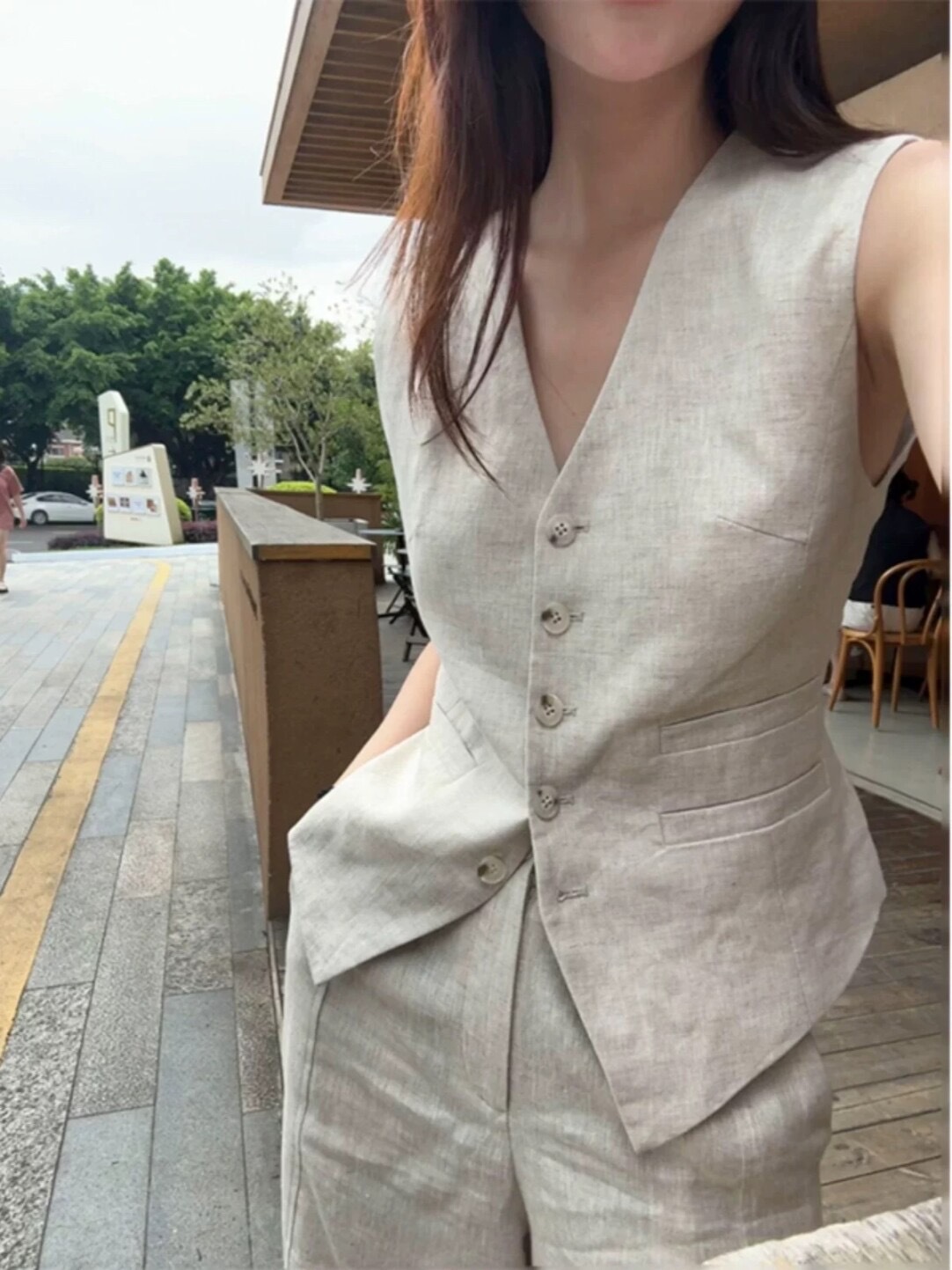 100 льняных жижей летняя тонкая ретро старый денежный ветер короткий костюм жилет женский V-образный вырез тонкий жилет куртка плеча