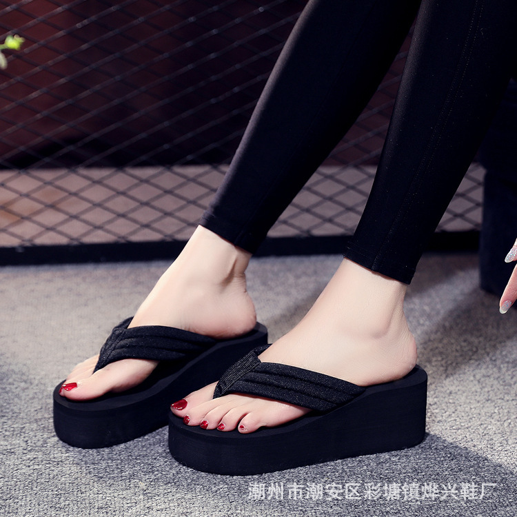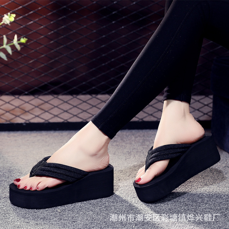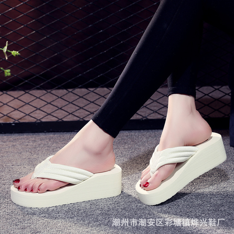 Летние новые женские шлепанцы на танкетке с толстой подошвой и тканевыми ремешками, модная пляжная обувь, оптом