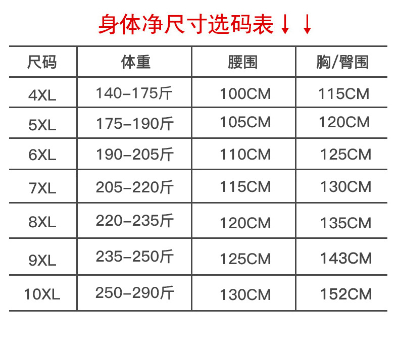4XL (70-87.5kg износа); 5XL (87.5-95kg одежда); 6XL (95-102.5kg одежда); 7XL (102.5-110kg одежда); 8XL (110-117.5kg износа); 9XL (117.5-125kg износа); 10XL (125-145kg износа); L