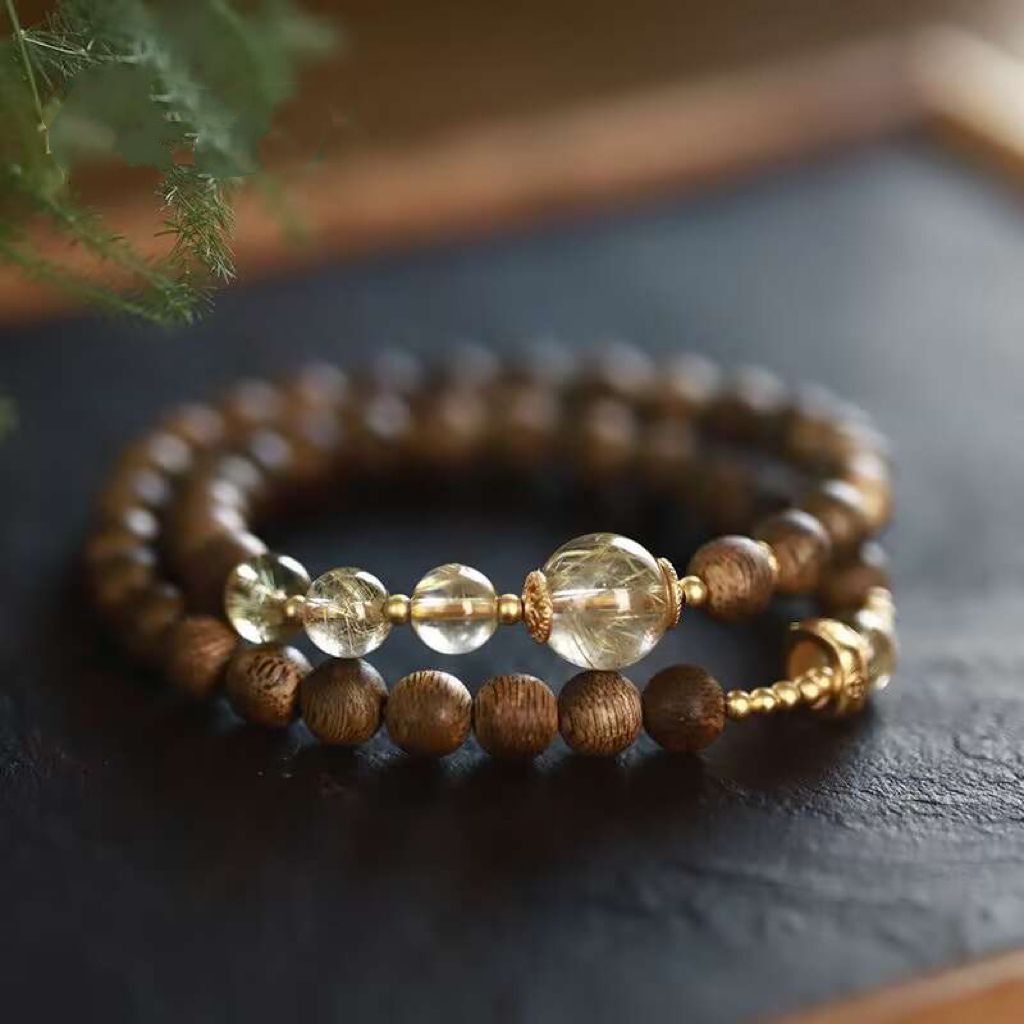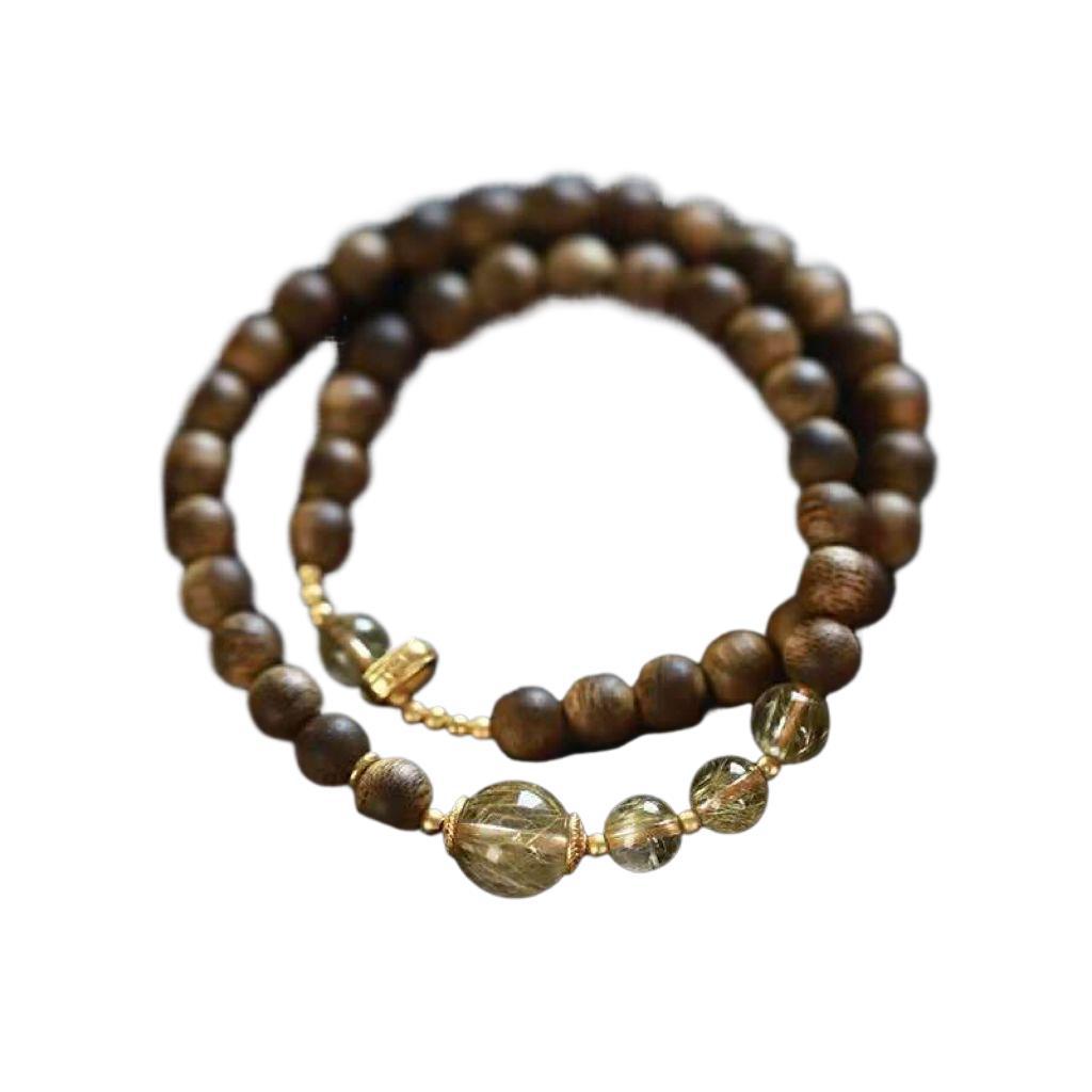 Индийский браслет из сандалового дерева Майсора Лаошань с двойным кругом и бисером в китайском стиле, легкий роскошный нишевый браслет из стерлингового серебра с золотым рутиловым кварцем, подарок.