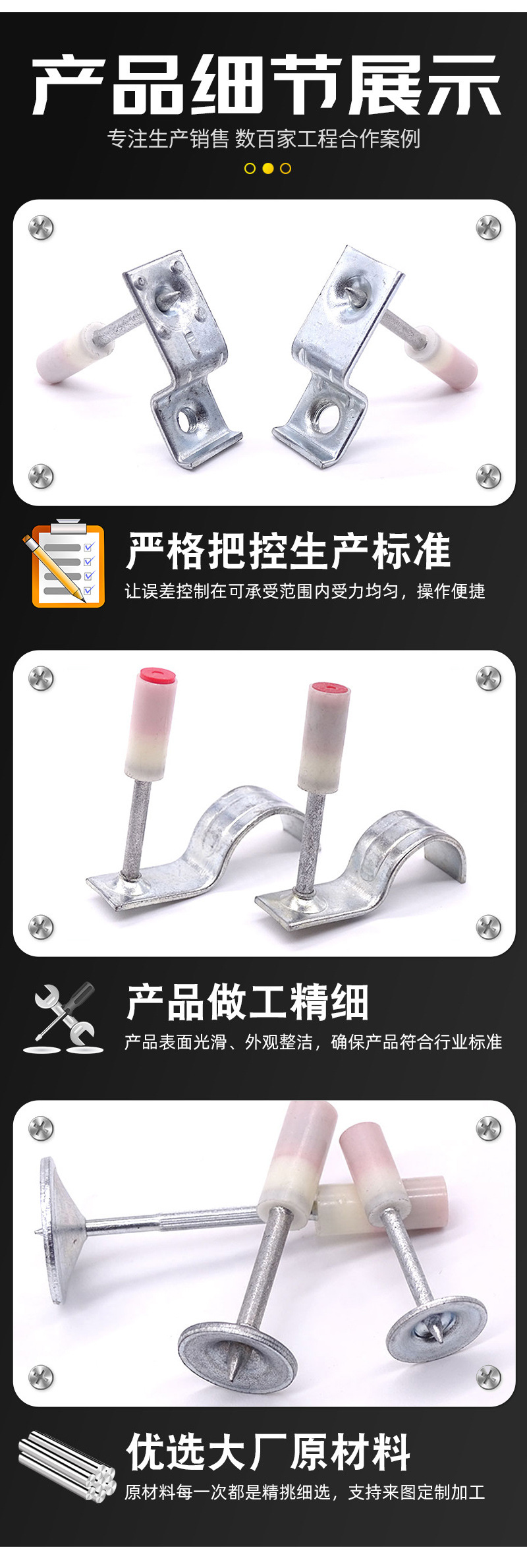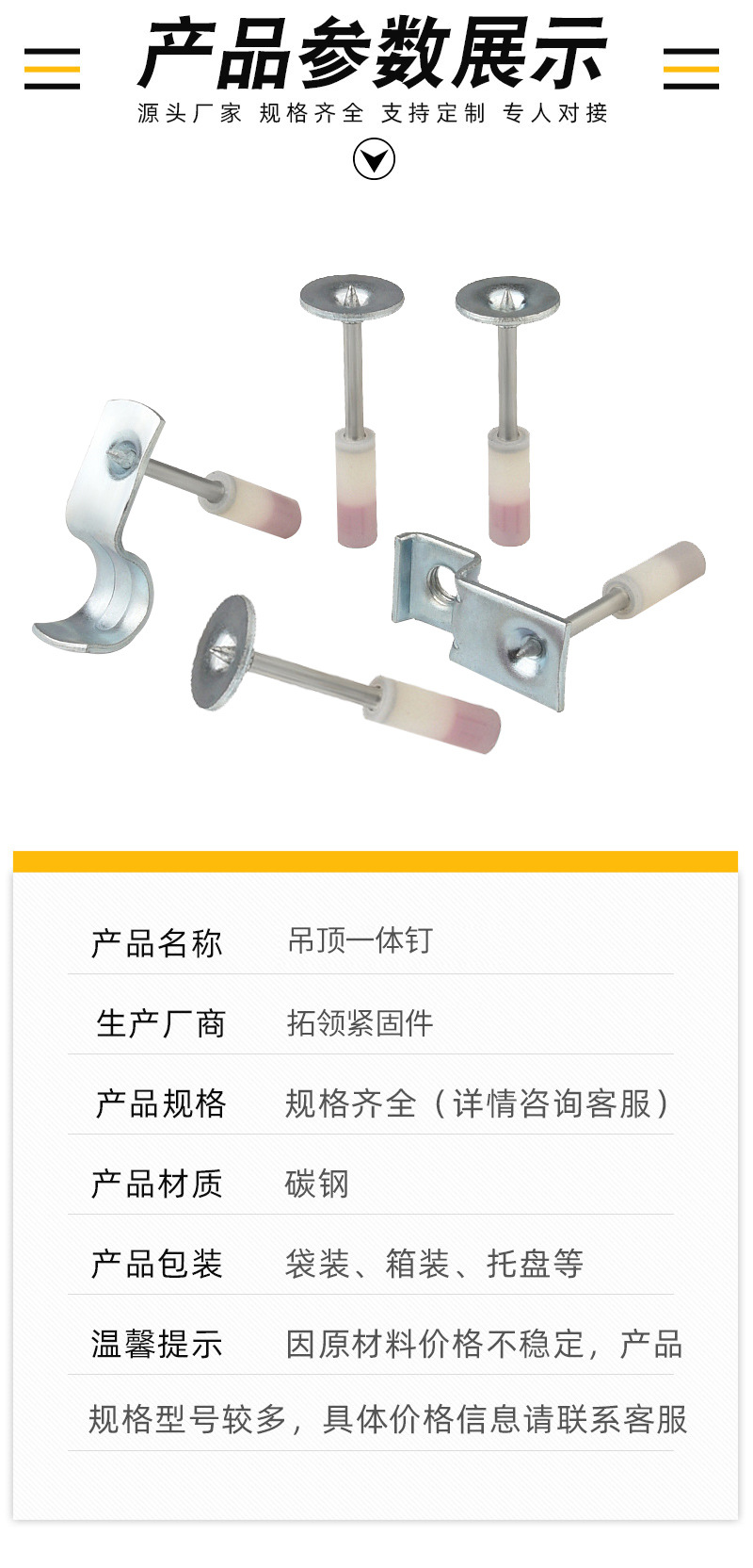 Потолочный интегрированный гвоздь M6; Потолочный интегрированный гвоздь М8; Потолочный интегрированный гвоздь M10; Потолочный строительный гвоздь М32; Потолочный пожарный гвоздь М42; Потолочный пожарный гвоздь М52; Мини-огненный гвоздь М32; Мини-огненный гвоздь М42; Мини-огненный гвоздь М27; Хомут для потолочной трубы М20; Хомут для потолочной трубы М25; Хомут для потолочной трубы М32; Хомут для потолочной трубы М40; Потолочные резьбовые гвозди
