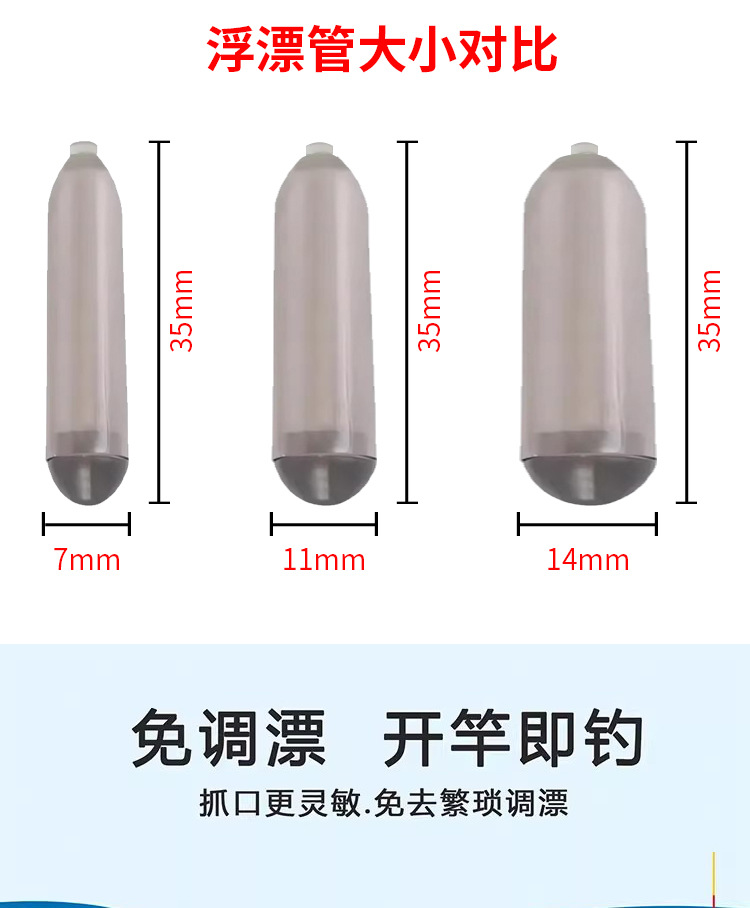 [7*35 мм-маленький размер] Поплавковая трубка с обратным дном; [11*35 мм-средний размер] часть поплавковой трубки с защитой от дна; [14*35 мм-большой размер] противодонная поплавковая трубка