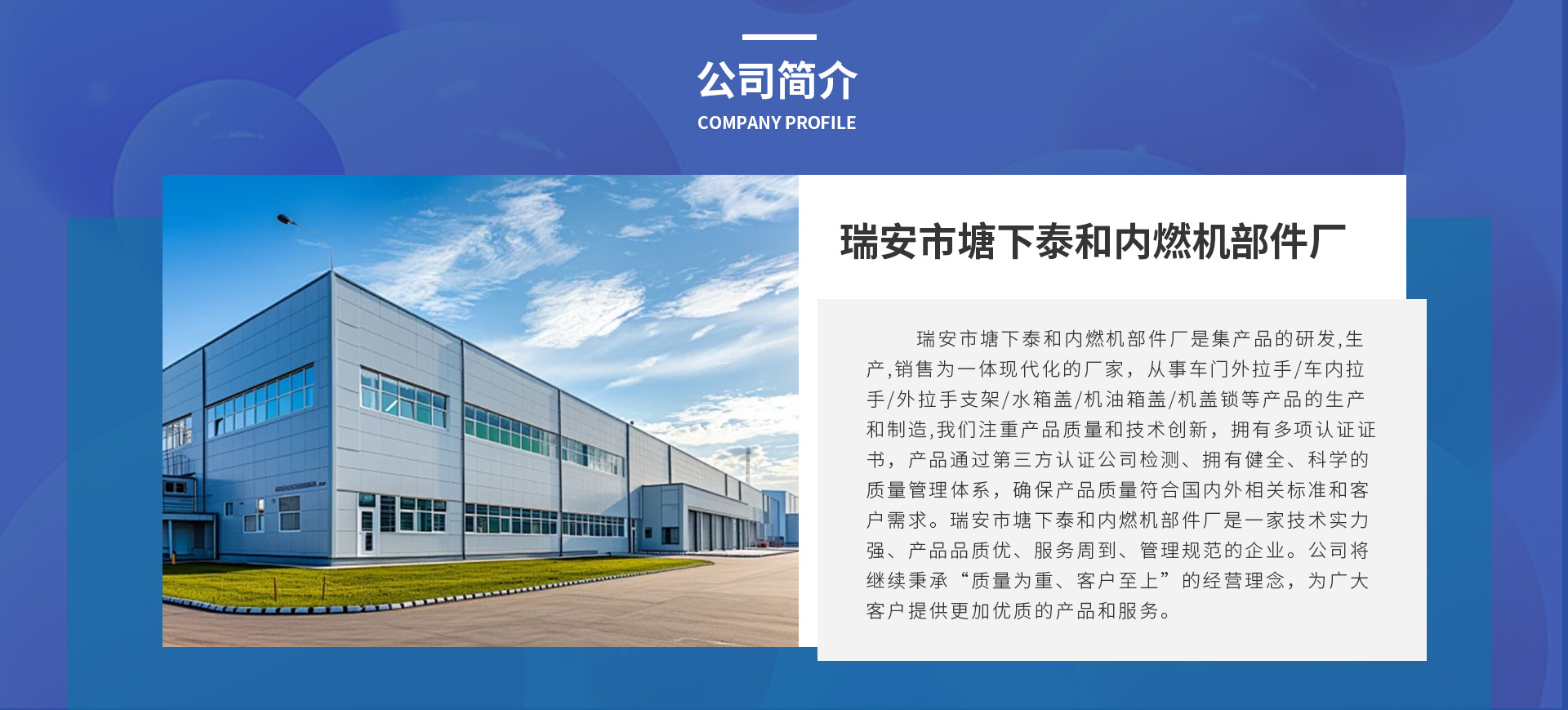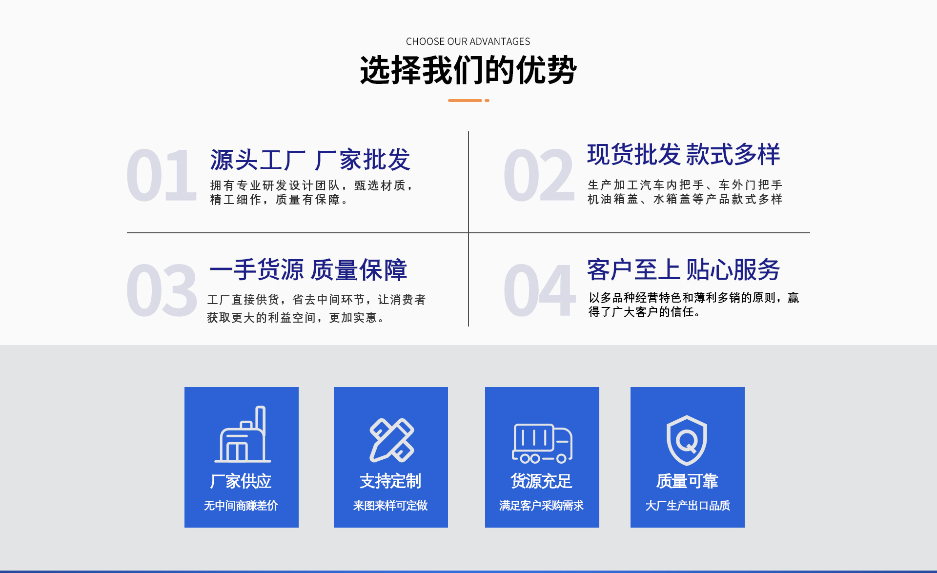 我厂立足温州汽摩配之都,深耕经营汽摩配行业20余年,致力于整合优势货源,打造高质 价优供应链体系;无起订量要求,快速发货,分享内外贸电商平台。