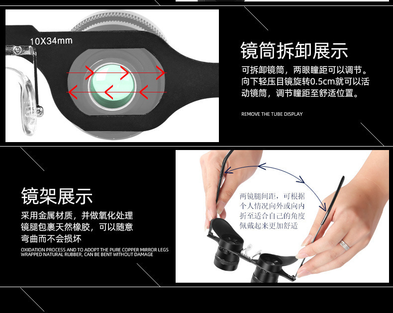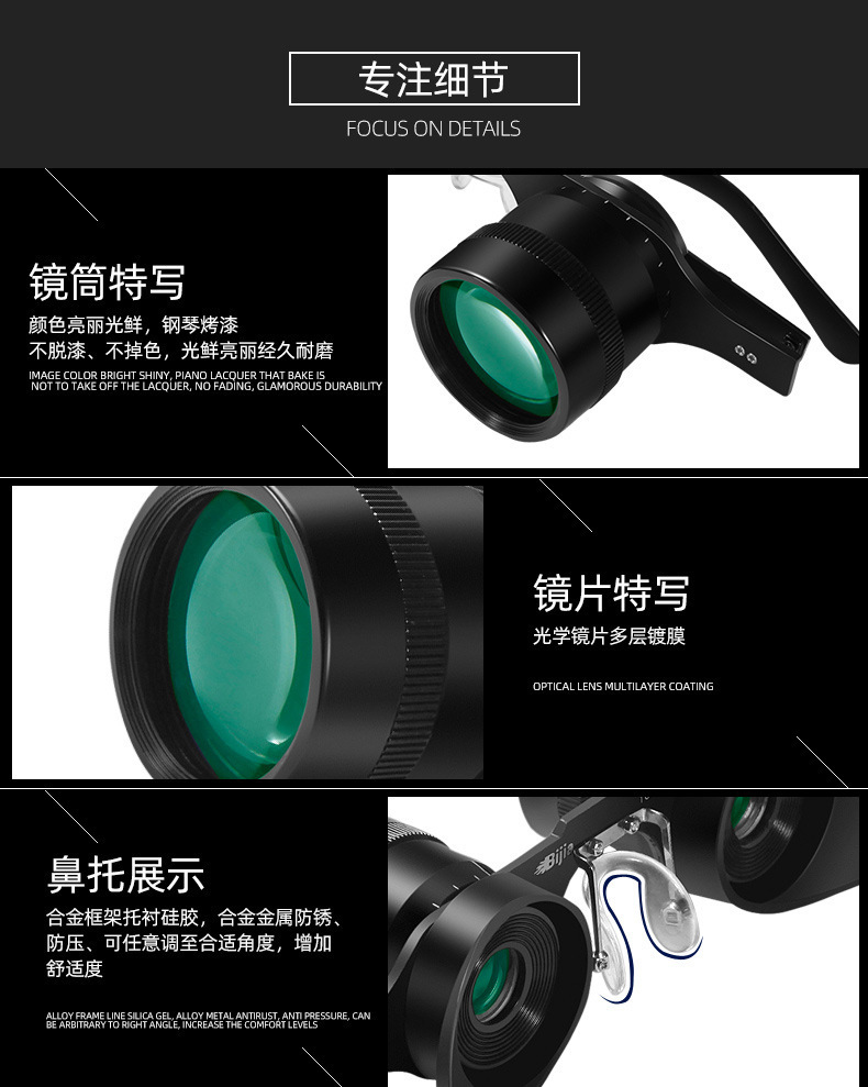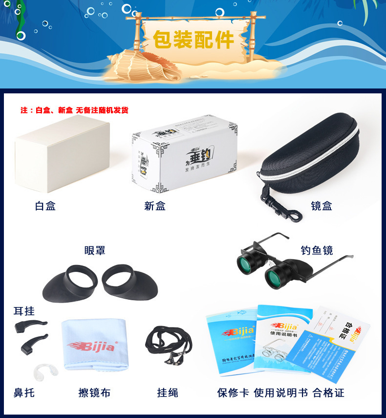 单件包装配件:彩盒或白盒,眼镜望远镜、镜包、鼻托、挂绳、擦镜布、眼罩