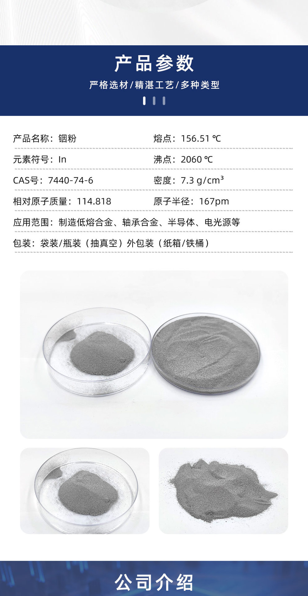 Индий порошковый высокочистый (99,99%), электронный класс, фракции 100/200/325/600/1000 меш, для использования в качестве целевого материала
