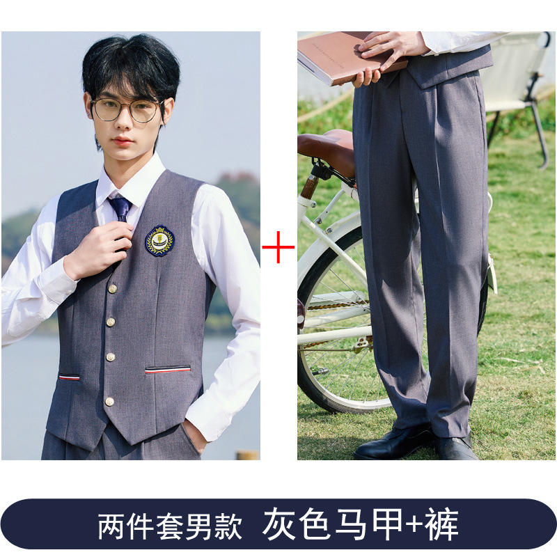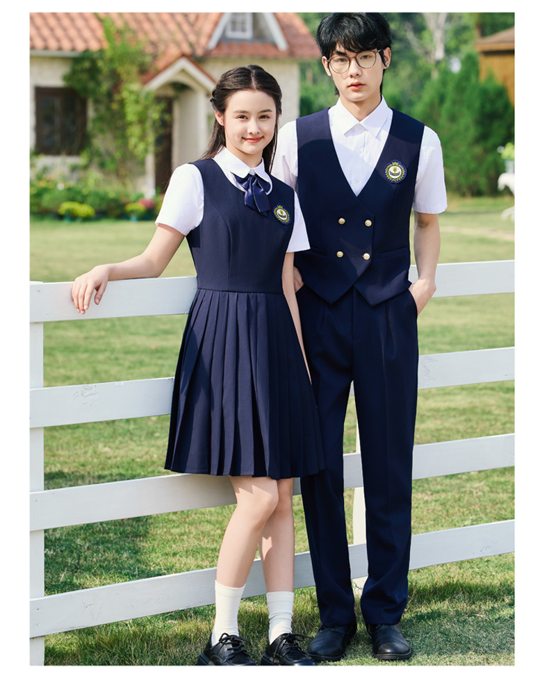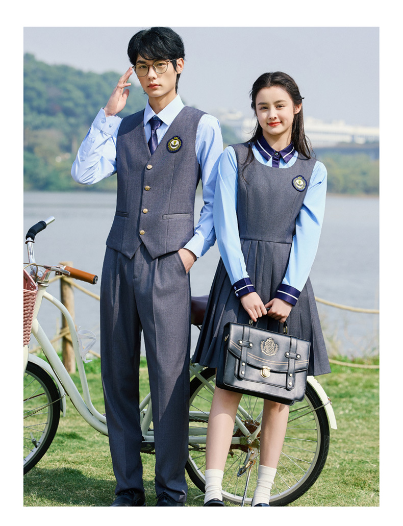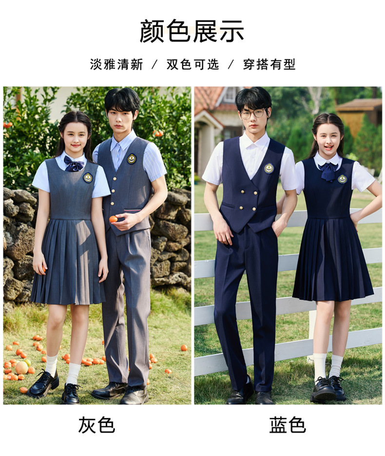 серая юбка; синяя юбка; Серая юбка + синяя рубашка с длинными рукавами.; Синяя юбка + белая рубашка; Серая юбка + белая рубашка с короткими рукавами.; Синяя юбка + белая рубашка с короткими рукавами.; Мужчина = синий жилет + синие брюки.; Мужчина = серый жилет + серые брюки.