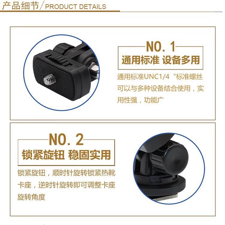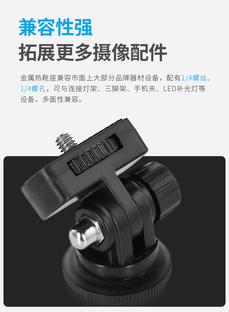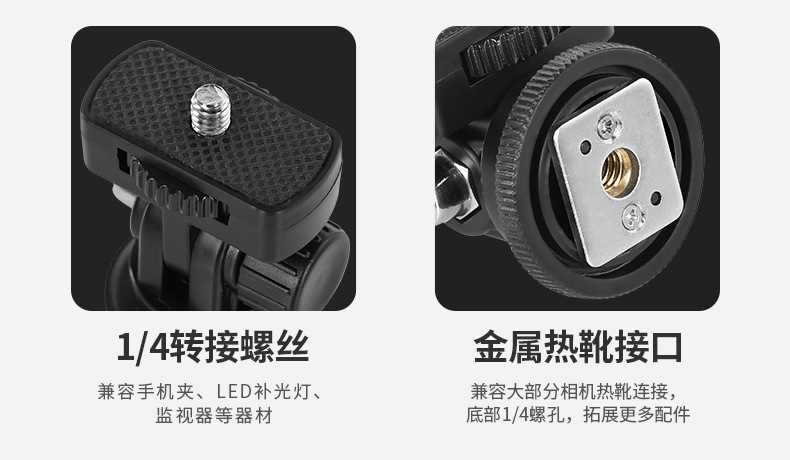 螺丝:1/4标准螺丝适用范围:适合带热靴插座的摄影机,和相机使用、顶部带有1/4标准螺丝适合搭配1/4螺丝接口的闪光灯搭配使用