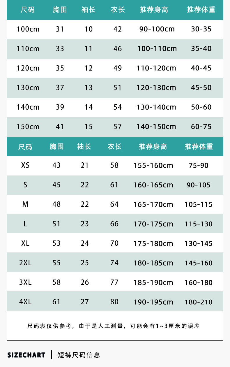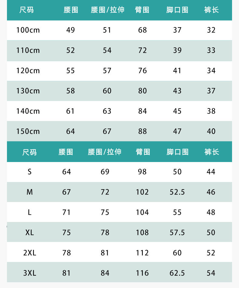 120cm; 130cm; 140cm; 150cm; S; M; L; XL; 2XL; 3XL